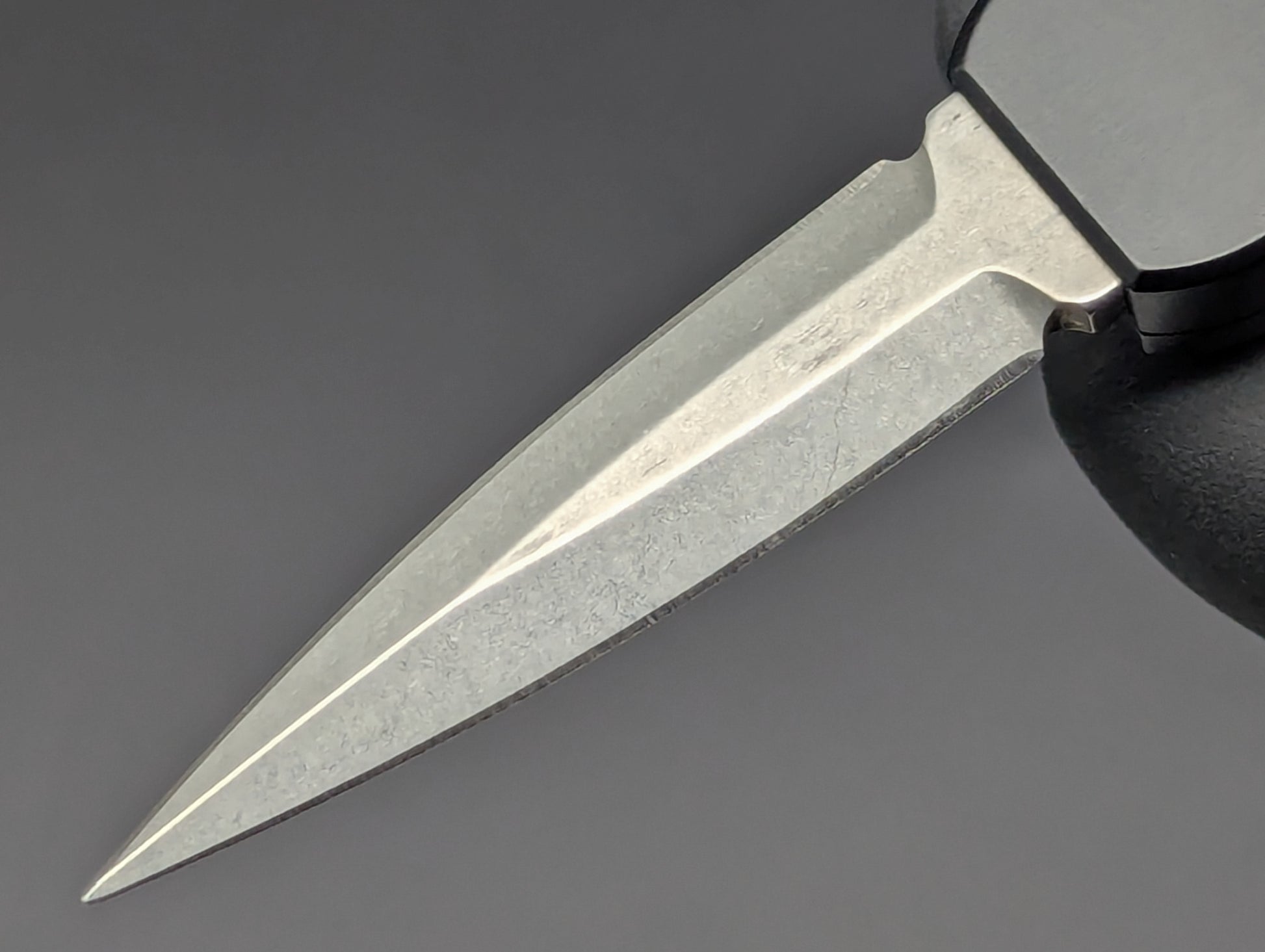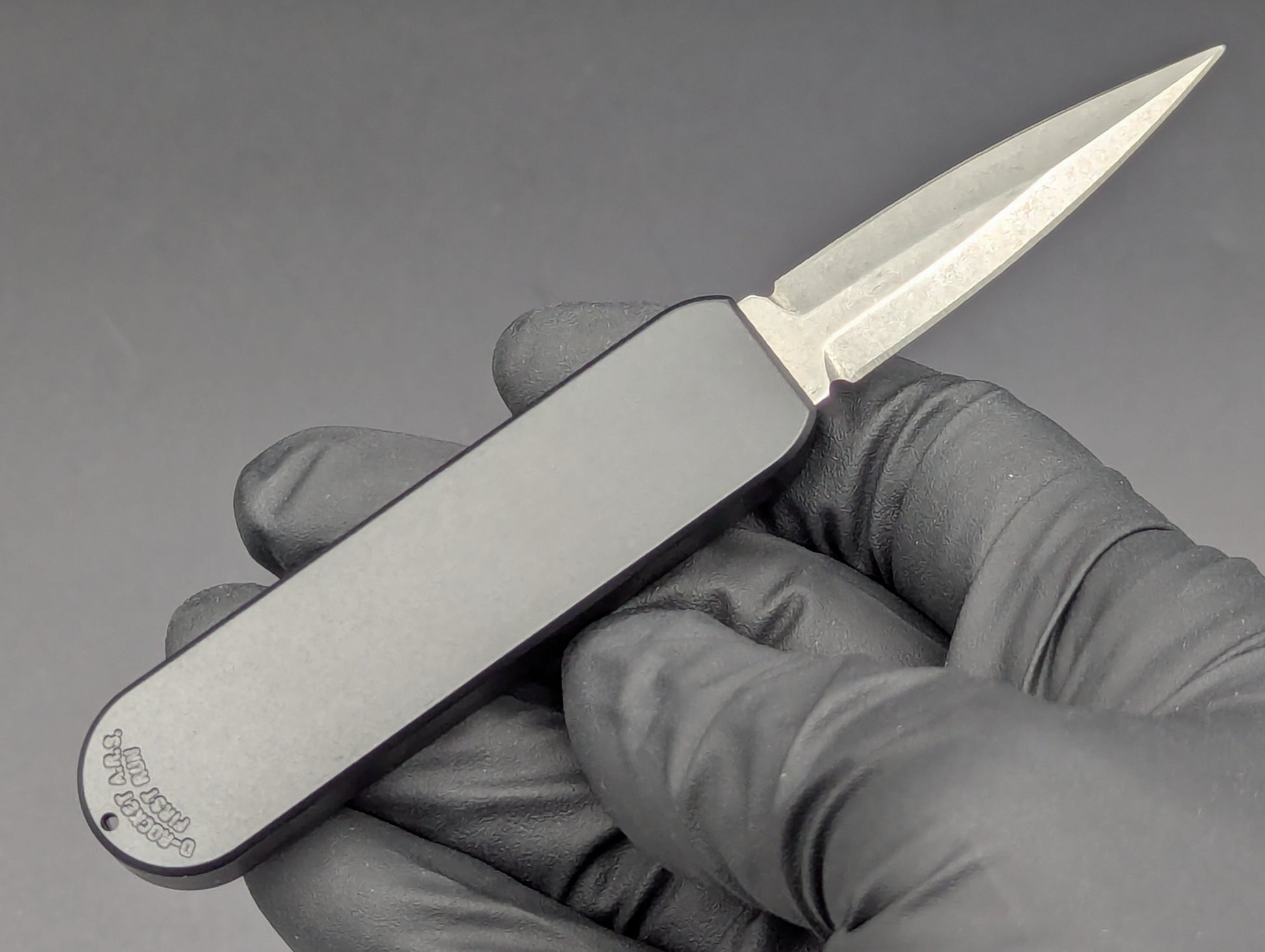 THESE ARE THE LAST OF THE LAST OF THIS MODEL FROM A R.S. KNIVES! CALIFORNIA LEGAL SIZE. DEADLY SPEAR POINT DOUBLE EDGE BLADE OF "NITRO V" STEEL, TURQUOISE COMPOSITE BUTTON AND BLACK FINISHED 7075 T6 ALUMINUM HANDLE. COMPOSITE BUTTON. OVERALL LENGTH: 5" BLADE LENGTH: 2"
