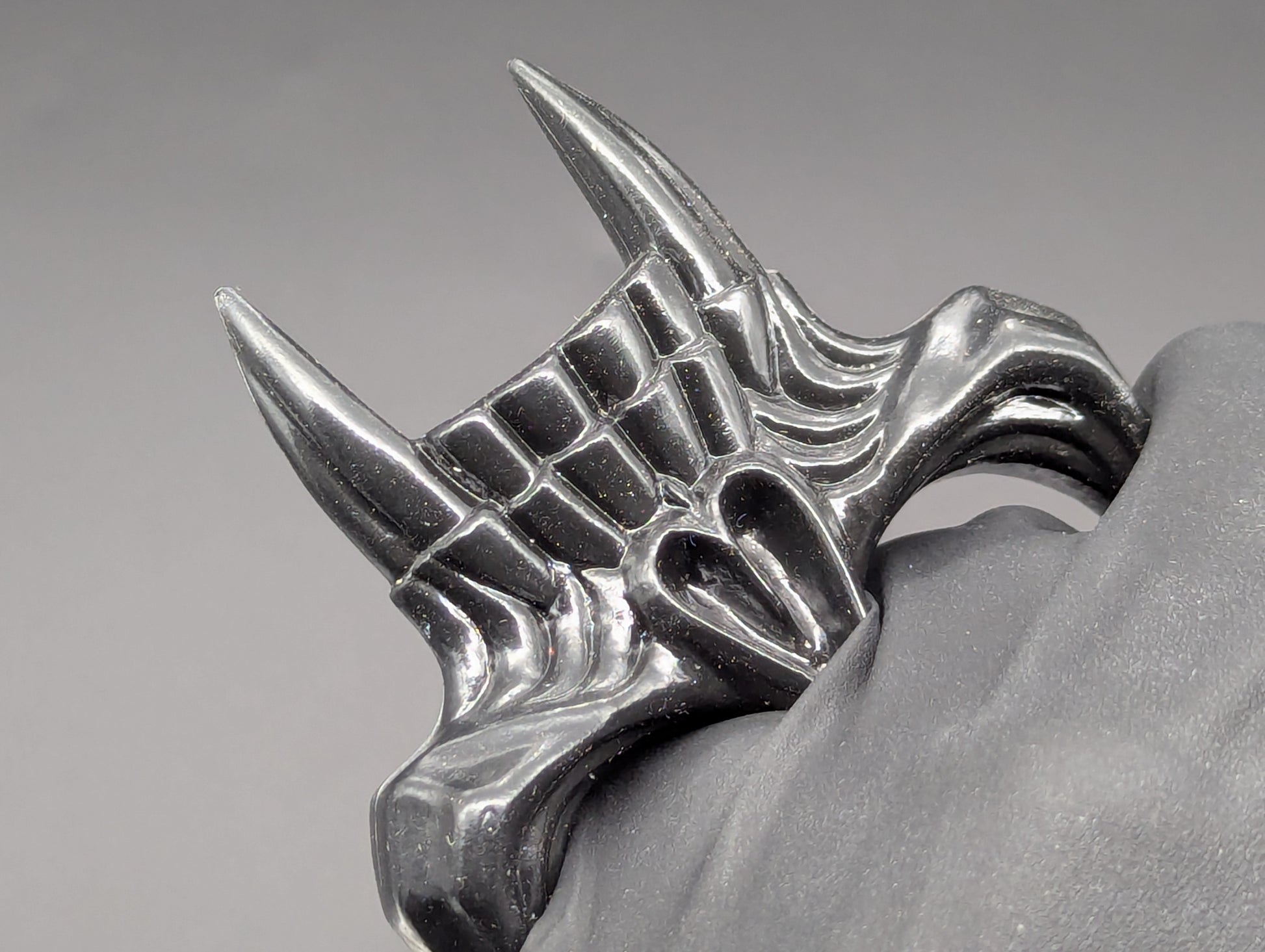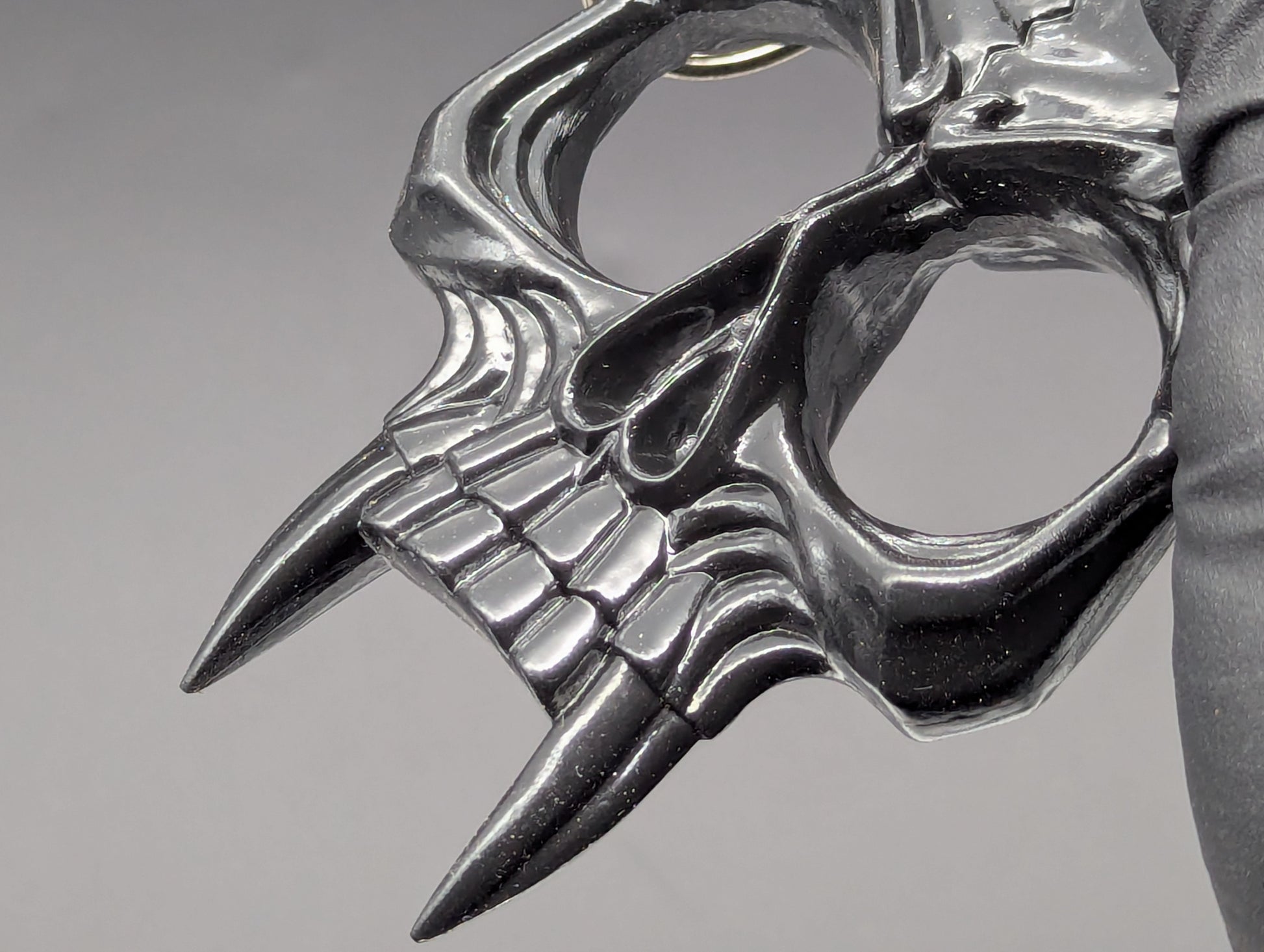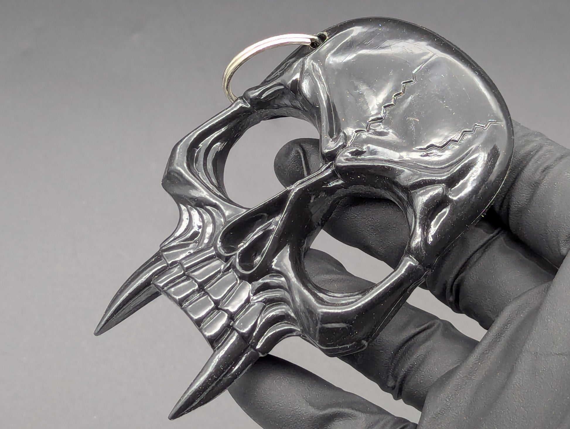 BLACK FINISHED SKULL SELF DEFENSE CHARM AND KEYRING ATTACHMENT. MADE OF ABS IMPACT RESISTANT MOLDED PLASTIC. JUST PLACE YOUR FINGERS THROUGH THE SKULL'S "EYES" FOR A GOOD GRIP. VERY HEAVY DUTY DURABLE CONSTRUCTION