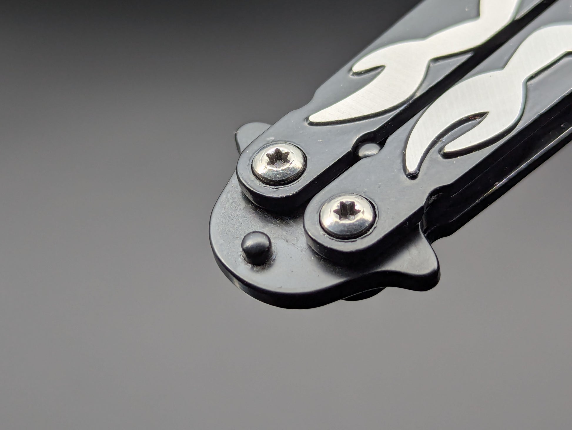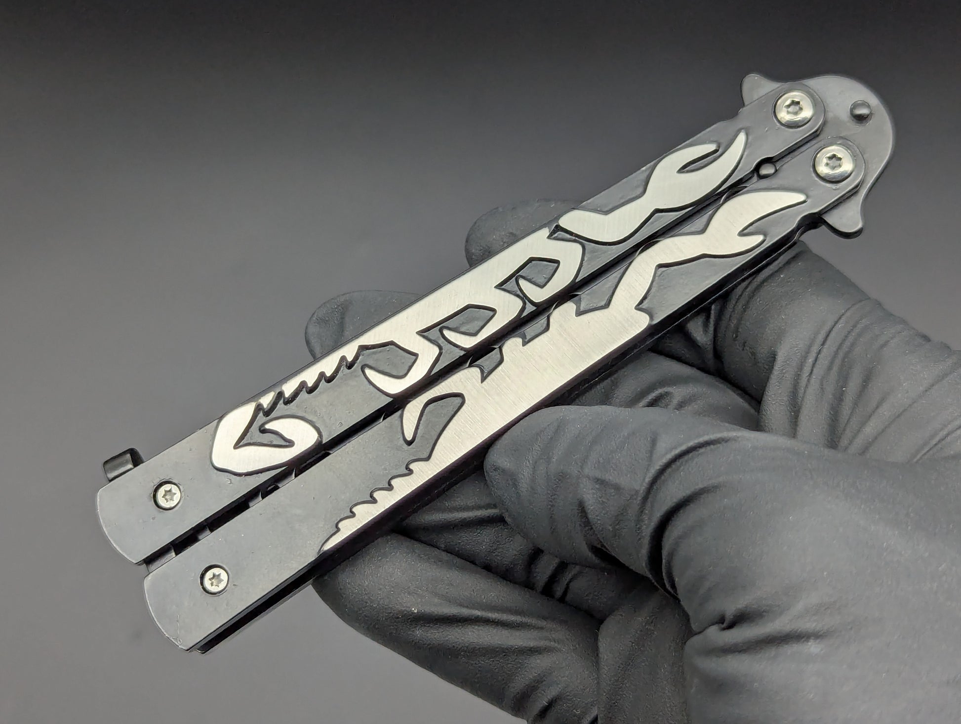 OLD SCHOOL SCORPION HANDLE HIGH RELIEF DESIGNED BALISONG TRAINERS. ALUMINUM ALLOY AND STEEL CONSTRUCTION WITH LOCKING HANDLE LATCH. GREAT FIDGET/ DECOMPRESSION TOY AS WELL AS A SAFE WAY TO PRACTICE YOUR BALISONG FLIPPING SKILLS! BLACK HANDLE BLACK "BLADE" VERSION