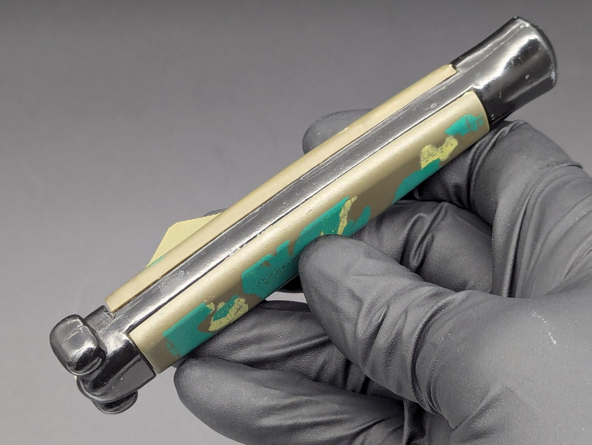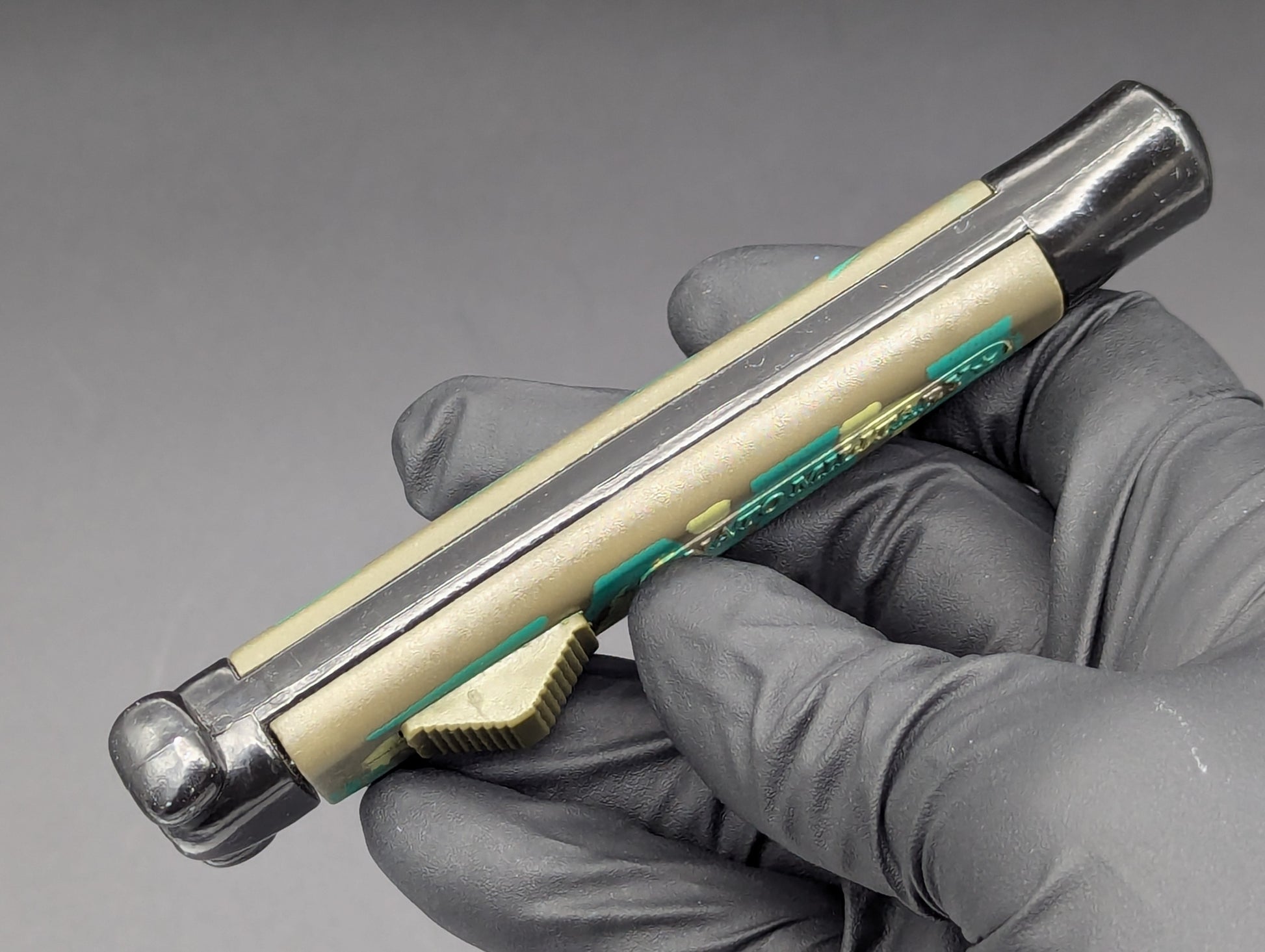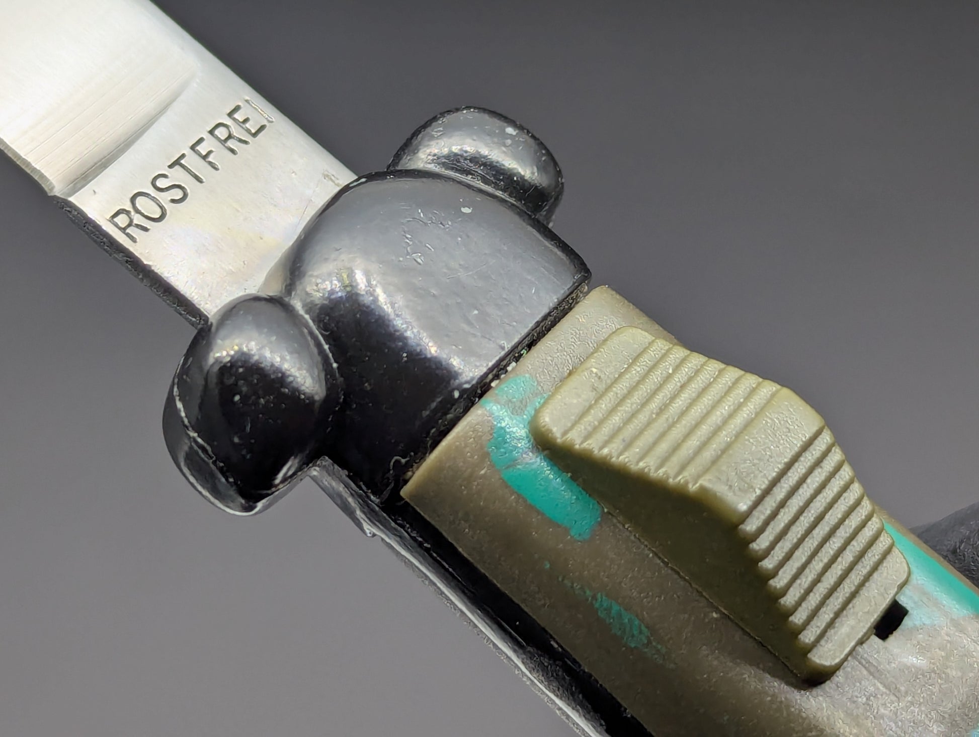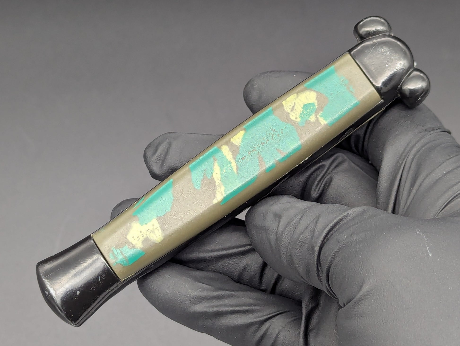 80'S HEAVY WEIGHT "NATO MILITARY" OTF KNIFE WITH NON PINNED BUNNY EARS. CLASSIC BLACK FINISHED GREEN DRAB SCALED NATO! THIS GUY HAS SOME REALLY BRIGHT CAMOUFLAGE COLORS THAT REALLY POP ON THIS VERSION! UNUSED CONDITION. THERE ARE A FEW TINY BLEMISHES AND MICRO ABRASIONS FROM DECADES OF HANDLING, PASSING FROM COLLECTOR TO COLLECTOR. BUT THIS MODEL IS PERFECT IN EVERY OTHER WAY RIGHT NOW WITH A VERY NICE CLEAN UNUSED BLADE. DO NOT RAPID FIRE THESE MODELS YOU WELL BEND THE INTERNAL MECHANISM THEY'RE MADE FROM THE CHEAPEST METALS FROM ASIA BACK IN THE DAY! FOR ONCE TO OPEN. FIRE AGAIN TO CLOSE AND LEAVE IT ALONE ETC TYPE OF ITEM OF YOUR WANT THESE TO LAST FOREVER...