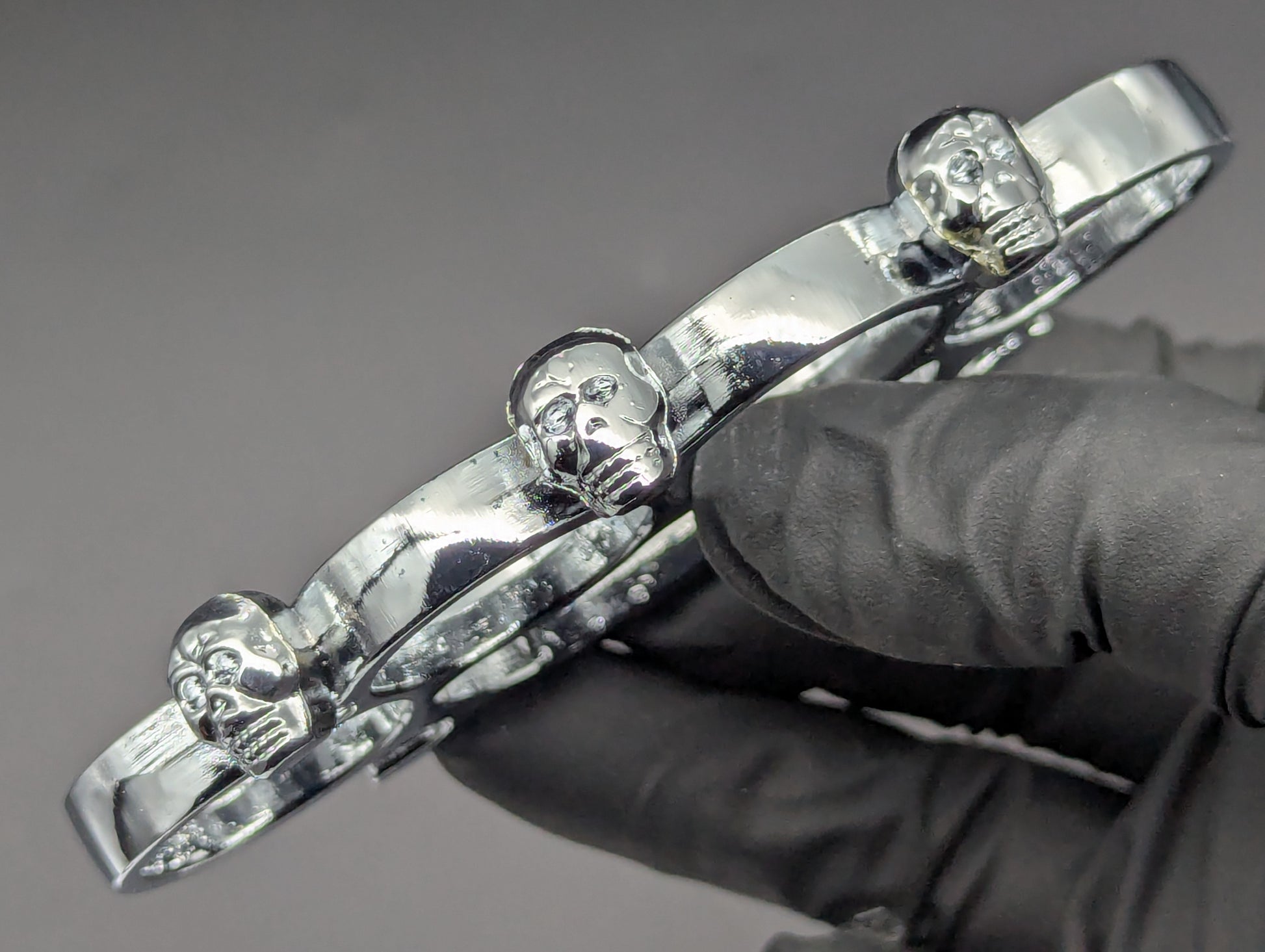 CHROME FINISHED MOLDED STEEL APPT FOUR FINGER KNUCKLE DUSTERS WITH 3 SKULLS! LIGHTWEIGHT YET HEAVY ENOUGH TO GET ANY JOB DONE