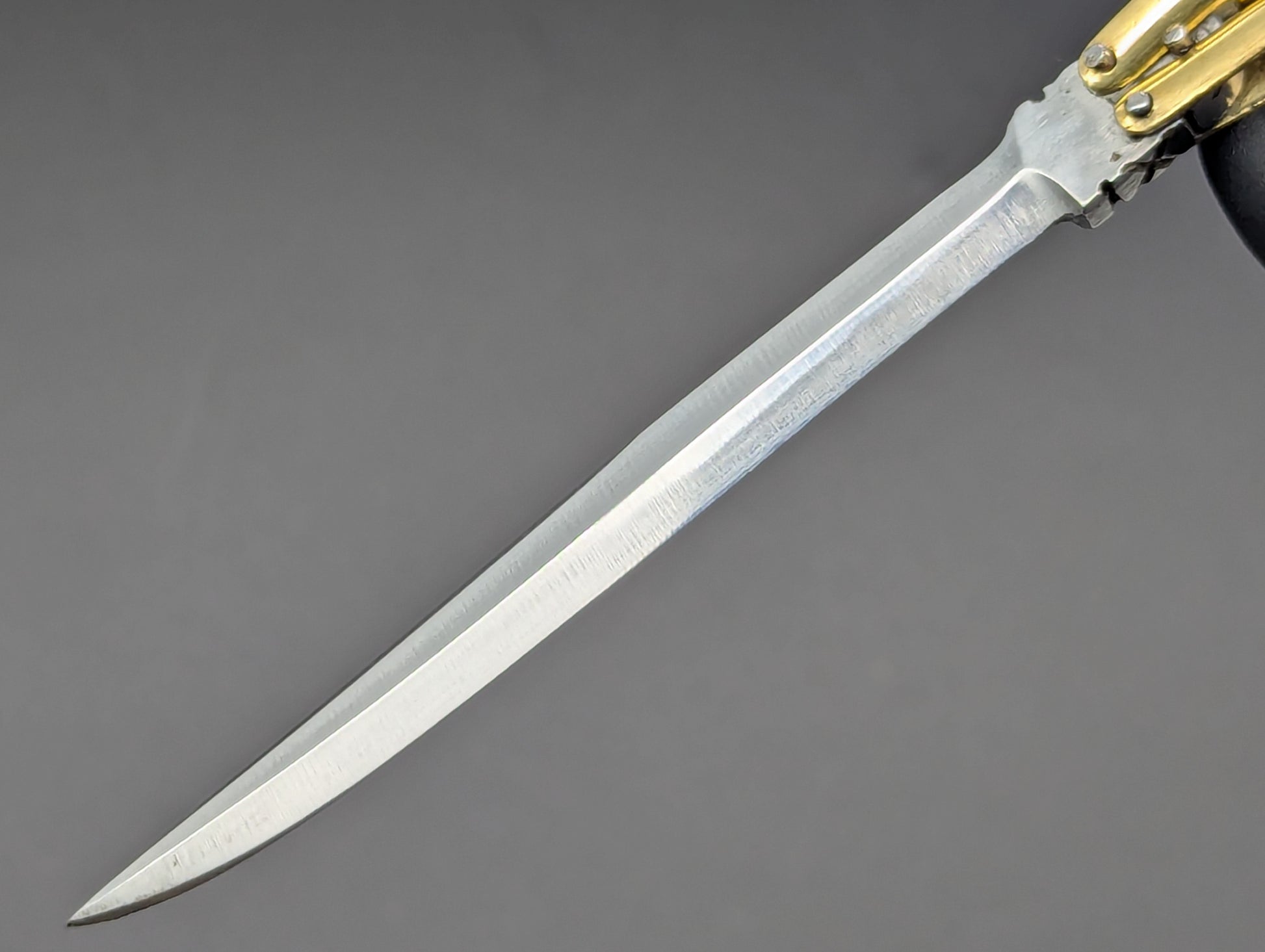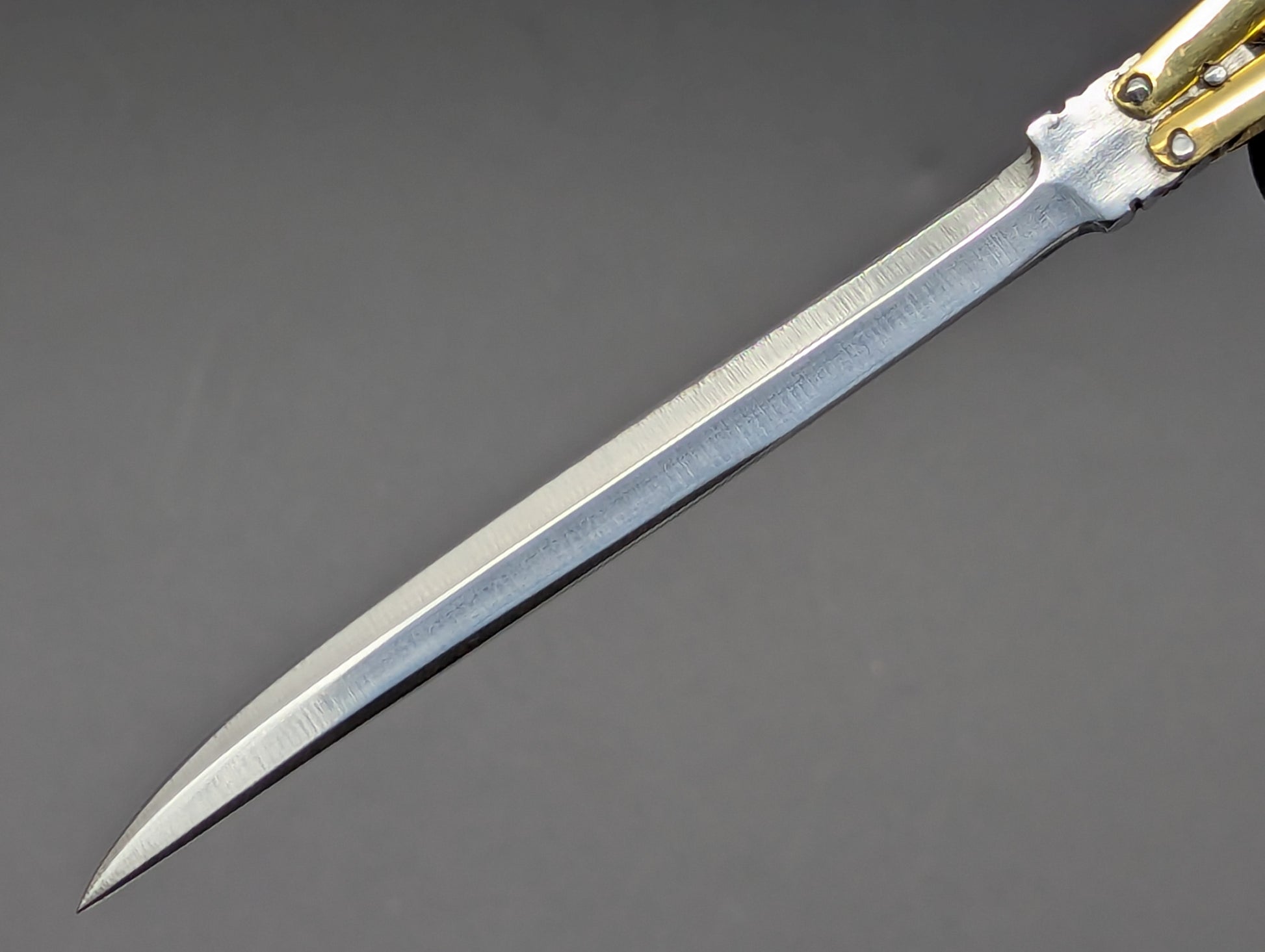 FHM SOLID BRASS BALISONG "PENS" NOW OFFER MORE FUNCTIONAL BLADES NOW. NO THESE DO NOT WRITE! BUT THEY DO CONCEAL A REALLY BEAUTIFUL POLISHED STEEL BLADE INSIDE THE PEN HANDLE. BLADE IS HIGH POLISHED WITH LIGHT "FACTORY" EDGE. HANDLES ARE BEAUTIFUL WORKS OF HANDMADE ART. THE CLIP MAKES THIS ALMOST INDISTINGUISHABLE FROM A REALLY NICE BRASS PEN. VERY COOL DISCRETE ITEM. THESE DO NOT FLIP WHEN THEY'RE FIRST CREATED BUT WILL LOOSEN UP IN TIME. WD40 IS ACTUALLY A GREAT RUST PREVENTATIVE/ LUBRICANT. THIS MODEL OFFERS A CLIP POINT GRIND BLADE.