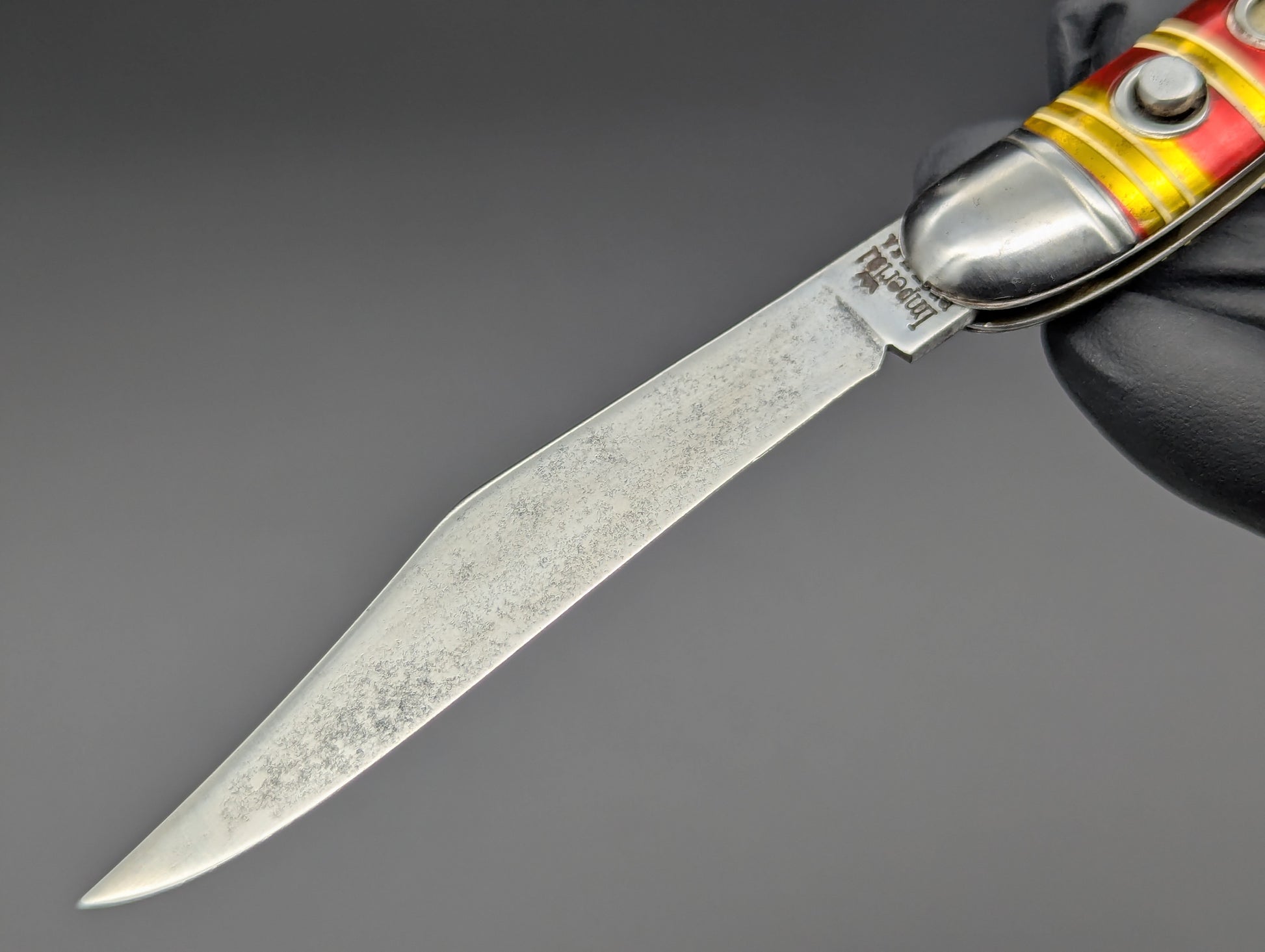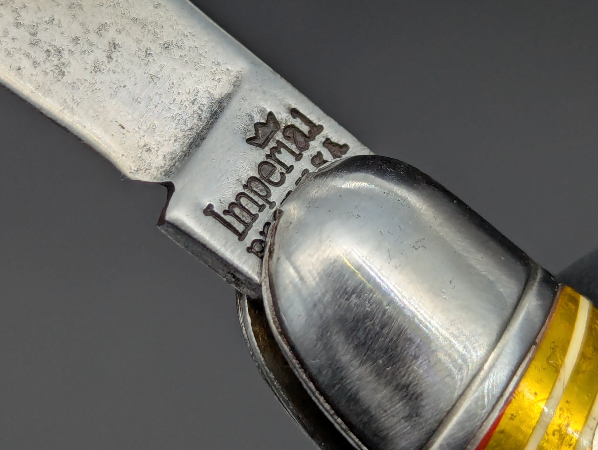ANTIQUE 1940's USA MADE AUTOMATIC OPENING KNIFE IN EXCELLENT CONDITION. OPENS POWERFULLY WITH POSITIVE LOCKUP EVERYTIME. SAFETY LOCK WORKS IN OPEN AND CLOSED POSITIONS. MADE BY IMPERIAL KNIFE COMPANY NY, NY. 7 5/8" OPEN 4 1/4" CLOSED TOOTHPICK MODEL # JM-90 PBC/ "IMPERIAL" TANG STAMPED FULL UNUSED BLADE. SUPER CLEAN CANDY STRIPE CELLULOID SCALES WITH HIGHLY VISIBLE TANG STAMPS. MINT VALUE $325