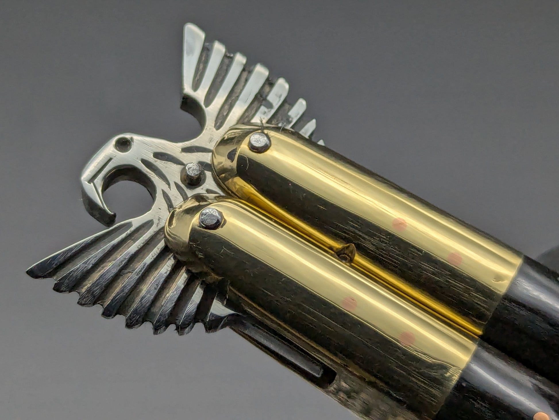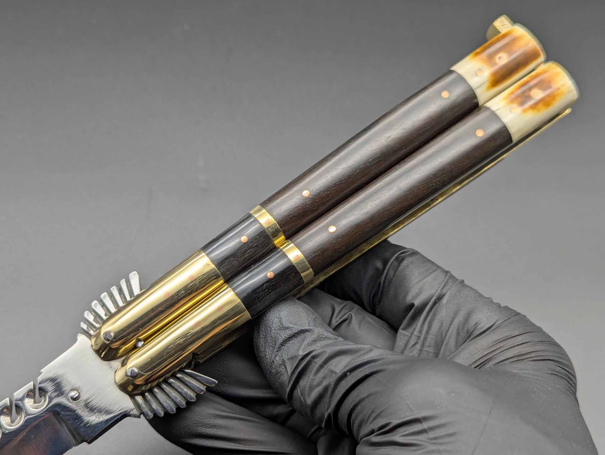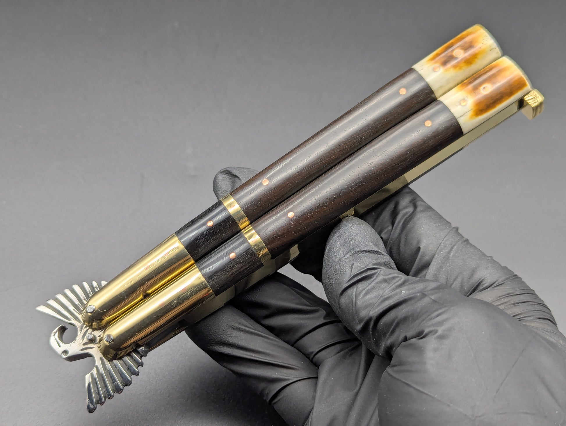11" OL 248 GRAM SPECIAL HEAVYWEIGHT TRADITIONAL PHILIPPINES HANDMADE BALISONG. BONE/HORN/ BRASS HANDLES. THE ELUSIVE BUT CLASSIC CARVED WINGED EAGLE BOLSTER. HUGE MIRROR POLISHED CLIP POINT BLADE WITH GUT HOOK SPINE. THESE DON'T REALLY COME MUCH NICER AND ARE EXTREMELY LIMITED TO ONE PIECE EACH MODEL!