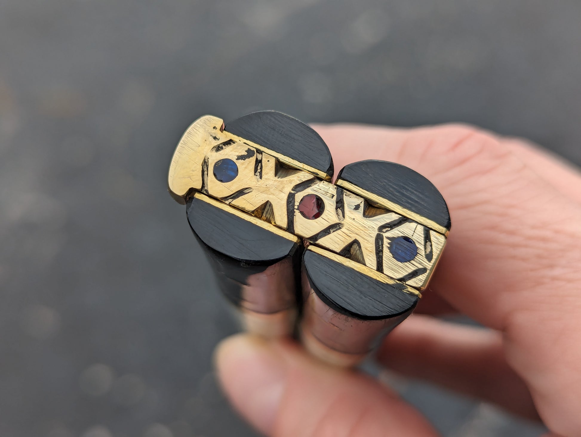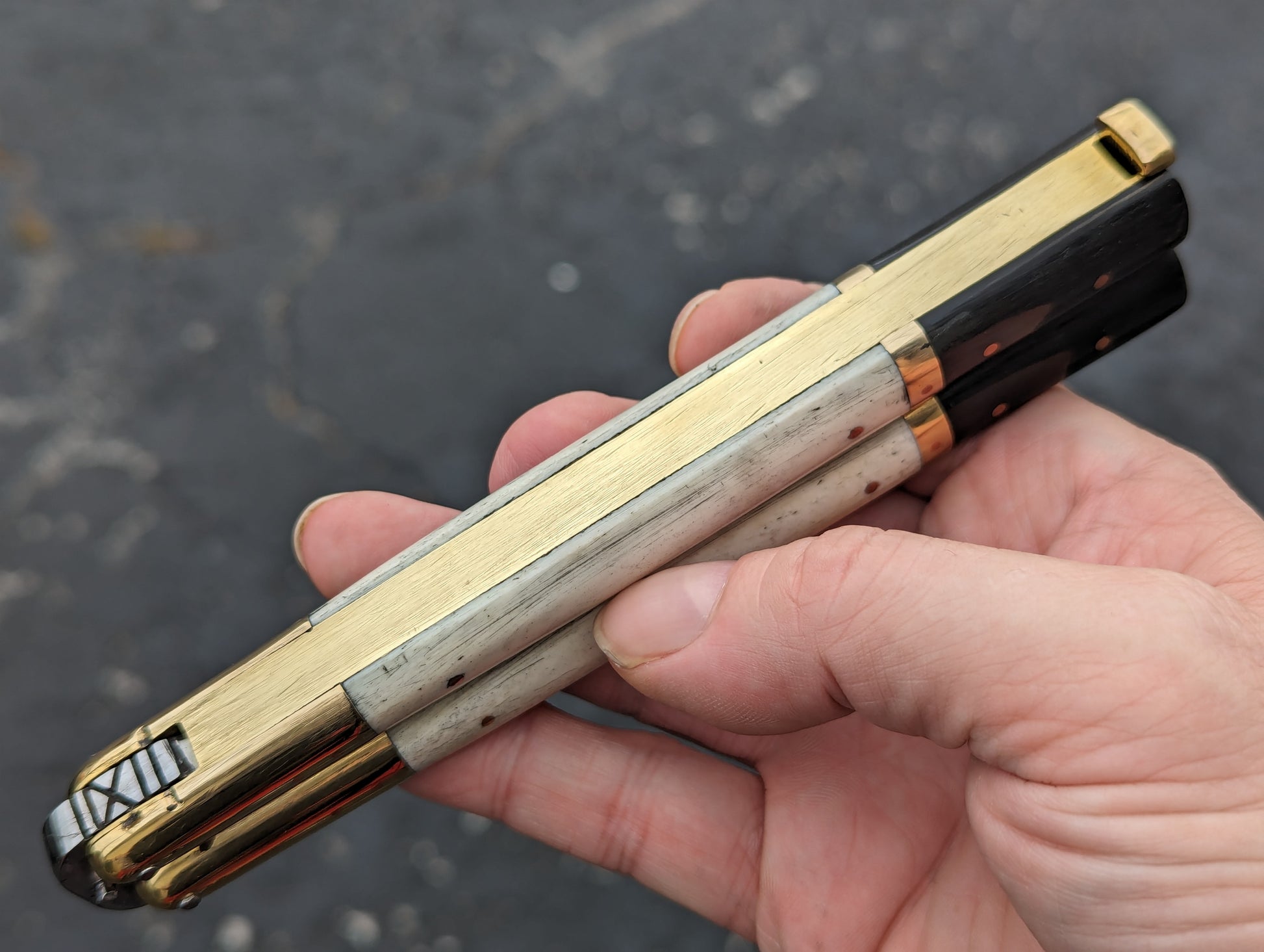 BEAUTIFUL HANDMADE PHILIPPINES BALISONG. INCREDIBLE BRASS WITH WHITE BONE AND BLACK HORN SCALES. INSANE FILEWORKED CLIP POINT BLADE GRIND! THESE ARE MADE AS FOLDING KNIVES. THE HANDLES FOLD OVER TO COVER THE BLADE INITIALLY. BUT THEY WILL LOOSEN IN TIME AND BE ABLE TO "FLIP" LIKE THE BUTTERFLY KNIVES WE HAVE COME TO KNOW