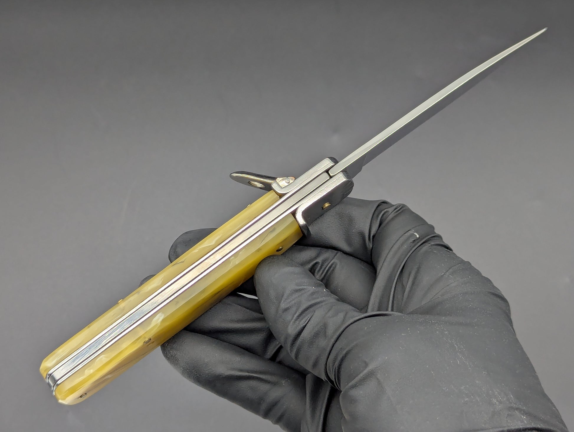 THIS IS A VERY CLASSY LOOKING LEVERLOCK WITH IT'S POLISHED APPEAL. SCALLOPED TOP BOLSTER. MIRROR POLISHED BLADE. THIS OFFER IS FOR THE IMITATION BLOND HORN SCALE VERSION. LEVER OPENS KNIFE AUTOMATICALLY AND RELEASES THE BLADE TO CLOSE. ALSO AVAILABLE IN RED AND BLACK WOOD SCALES OL 7.5" BL 3.2"