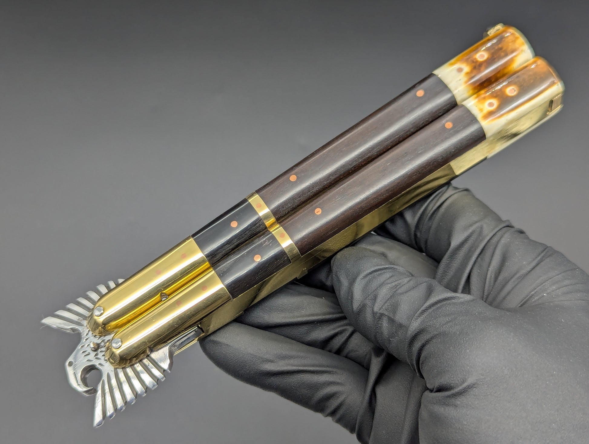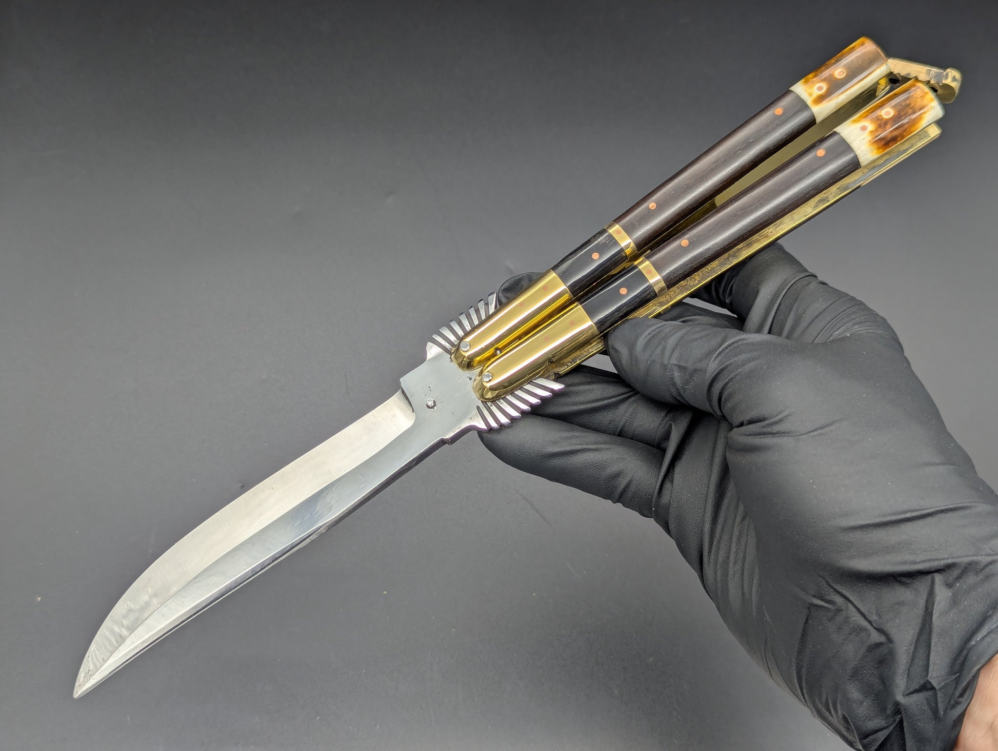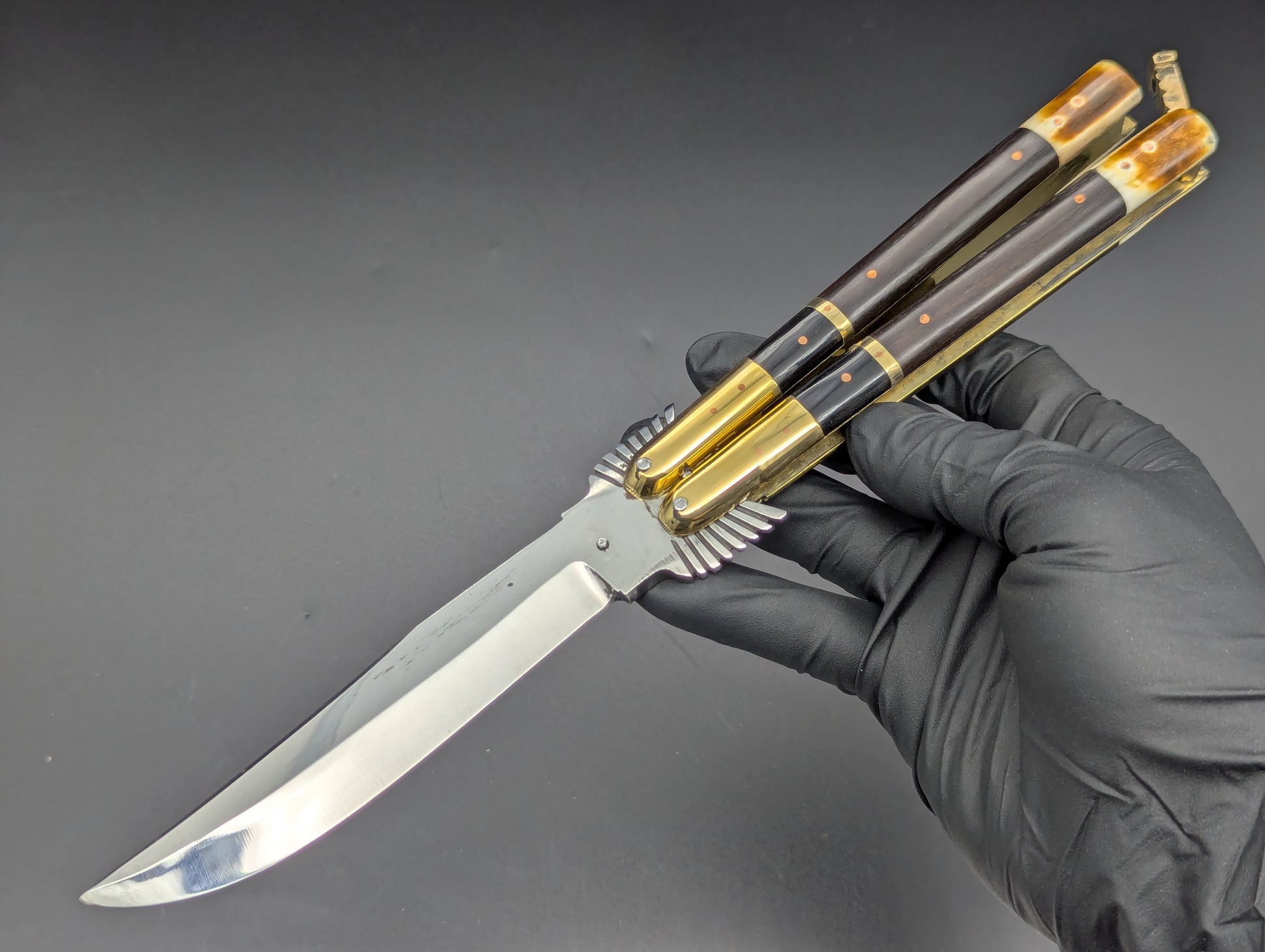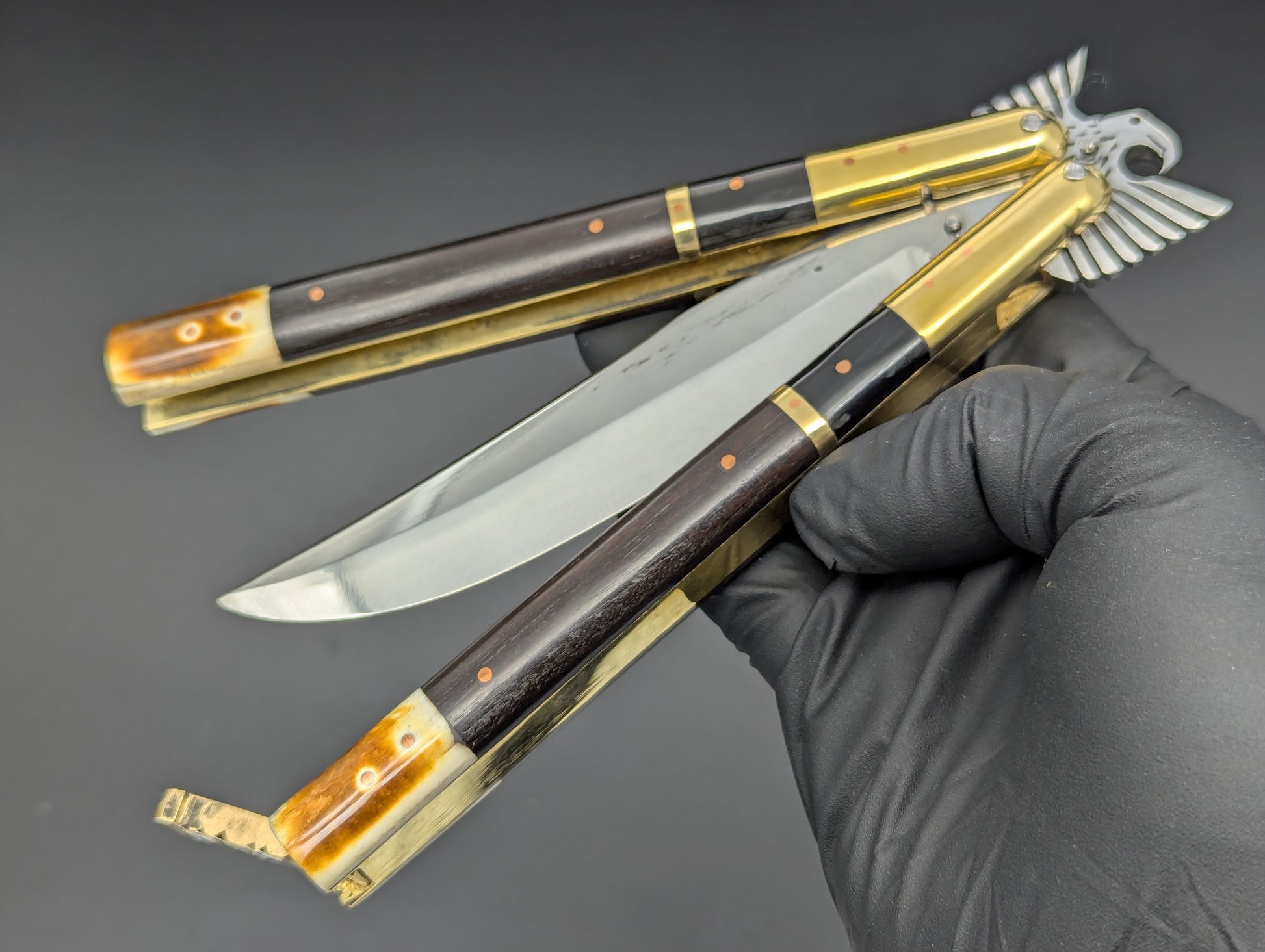 ONE OFF SPECIAL LIMITED CARVED "EAGLE TANG" PHILIPPINES HANDMADE BALISONG. ALL GLEAMING BRASS CONSTRUCTION. DOUBLE SECTIONS OF POLISHED DARK WOOD SCALES WITH BRASS UPPER BOLSTERS AND BURNT BONE LOWER. HIGH CARBON STEEL "CLIP POINT" GRIND BLADE. ABSOLUTELY CLASSIC! MAKERS MARK ON SAFETY LATCH. 11.25" OPEN LENGTH. 5.25" BLADE LENGTH. 276 GRAMS OVERALL WEIGHT