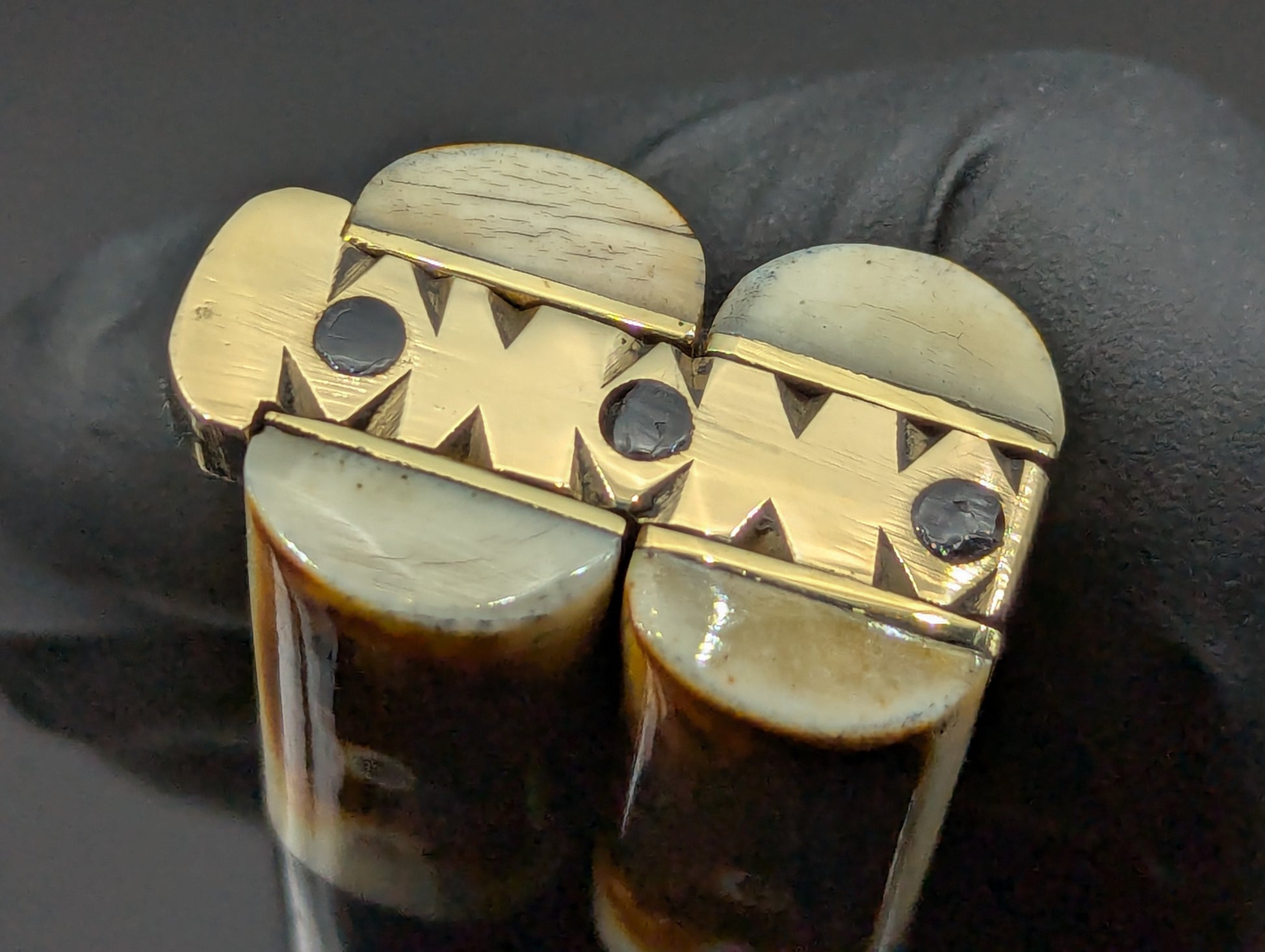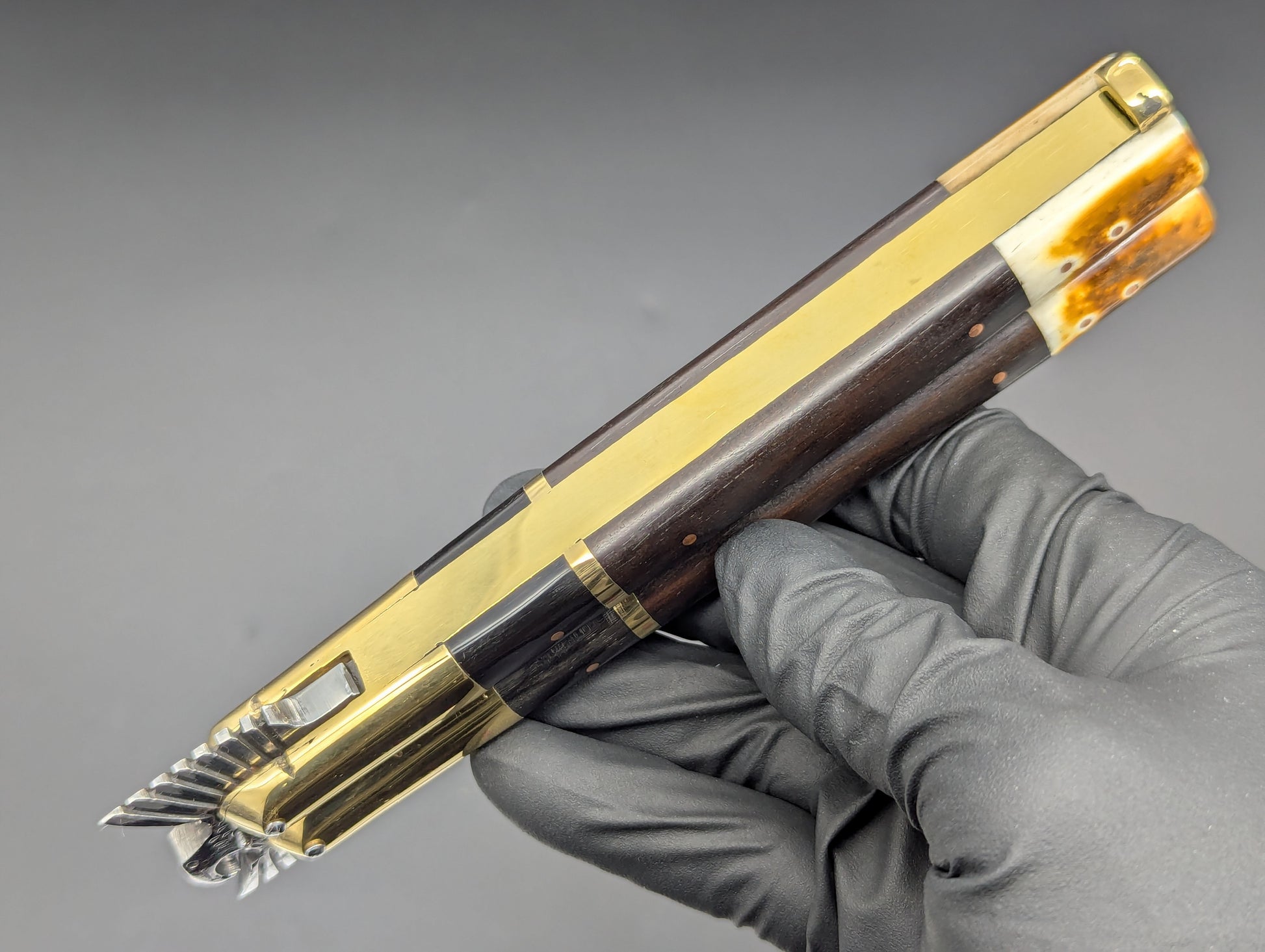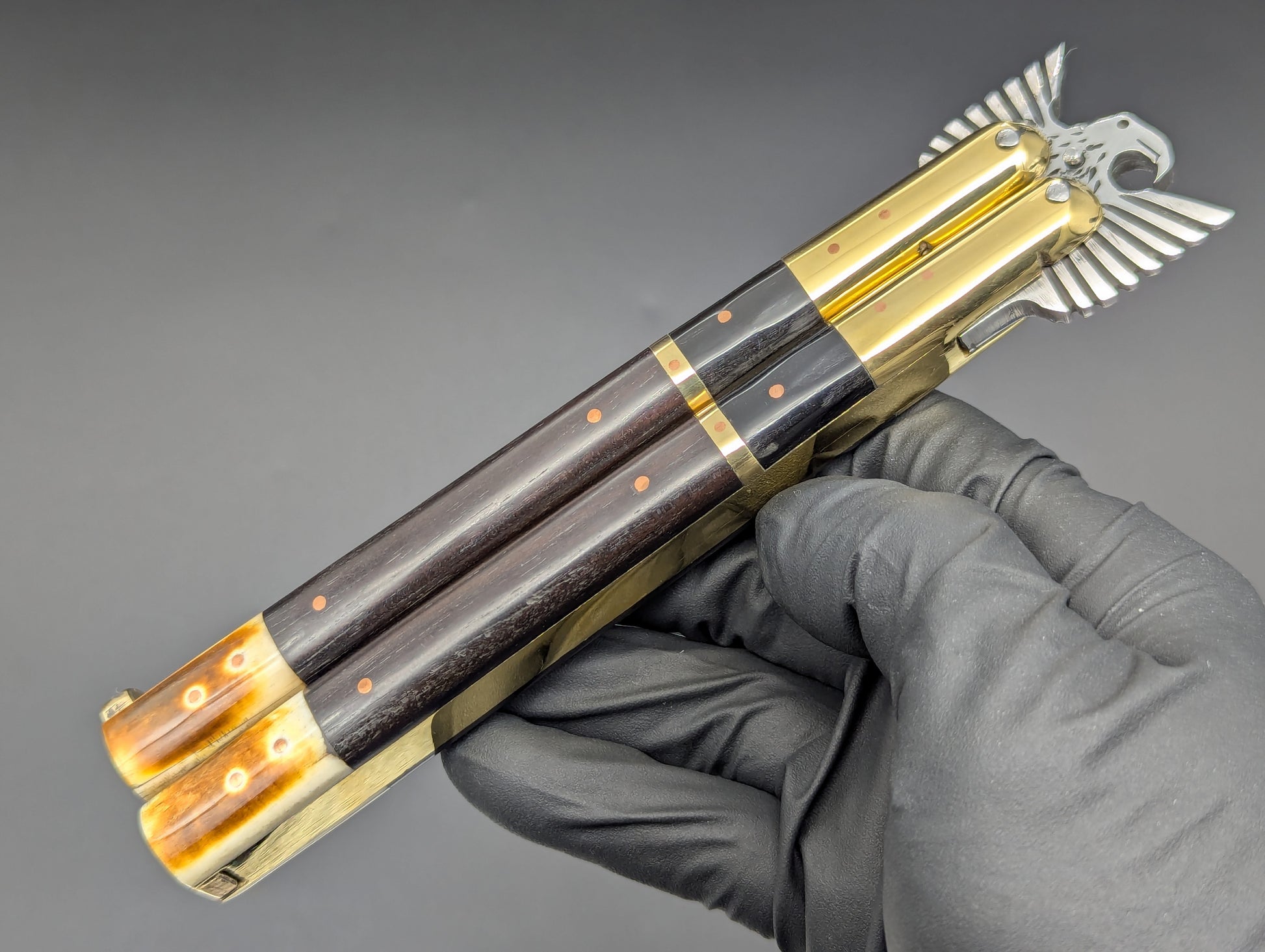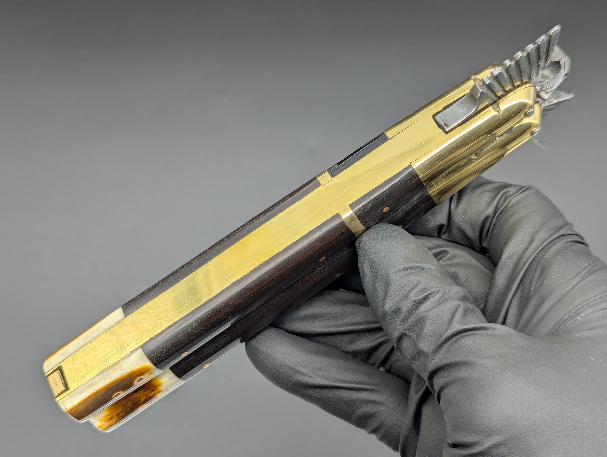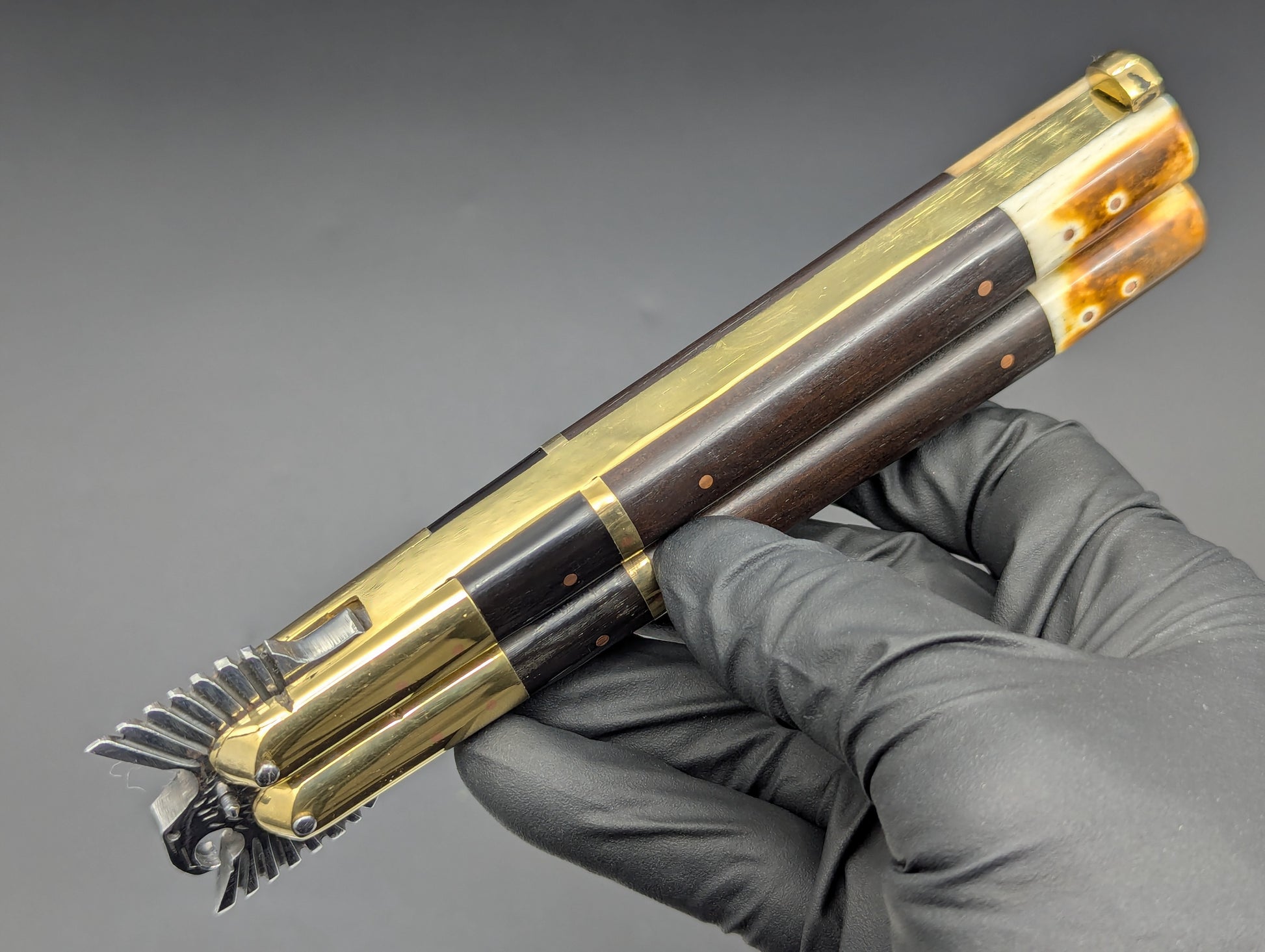 ONE OFF SPECIAL LIMITED CARVED "EAGLE TANG" PHILIPPINES HANDMADE BALISONG. ALL GLEAMING BRASS CONSTRUCTION. DOUBLE SECTIONS OF POLISHED DARK WOOD SCALES WITH BRASS UPPER BOLSTERS AND BURNT BONE LOWER. HIGH CARBON STEEL "CLIP POINT" GRIND BLADE. ABSOLUTELY CLASSIC! MAKERS MARK ON SAFETY LATCH. 11.25" OPEN LENGTH. 5.25" BLADE LENGTH. 276 GRAMS OVERALL WEIGHT