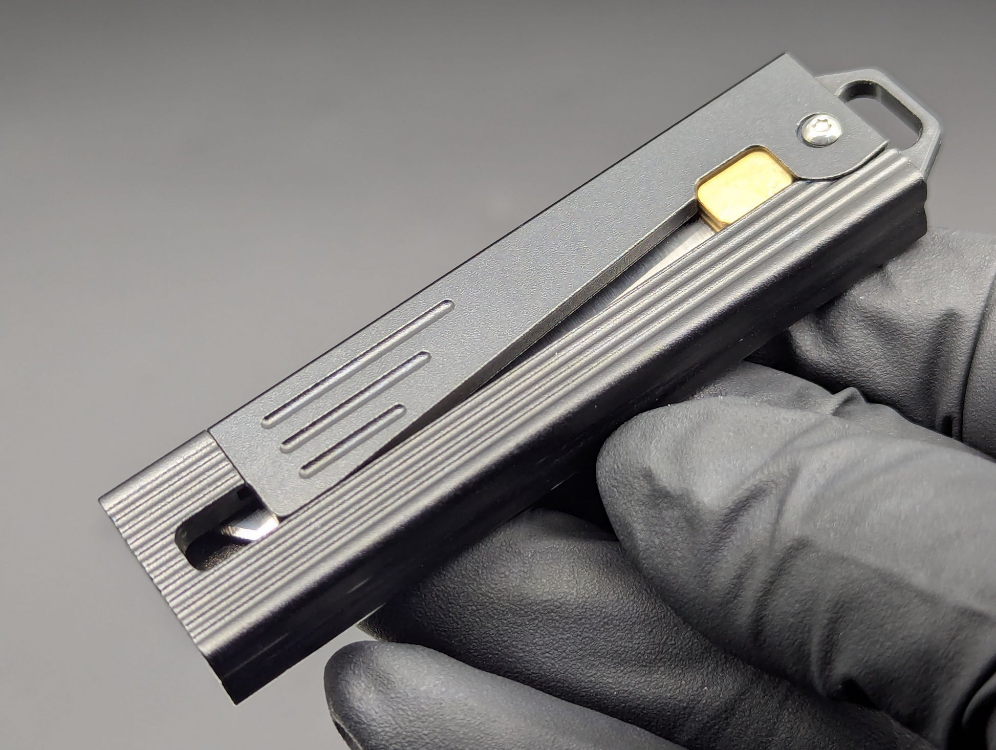 WHO'S LOOKING FOR AN INEXPENSIVE GRAVITY BLADE? HIGH QUALITY MACHINED ALUMINUM, BRASS AND D2 STEEL CONSTRUCTION. SMOOTH OPERATION. INCLUDES STEEL RING ATTACHMENT FOR KEYS, RUCKSACK, OR WHATEVER FLOATS YOUR BOAT. GREY FINISHED VERSION
