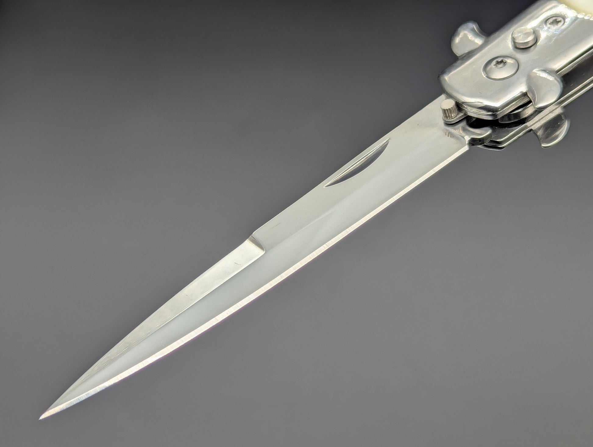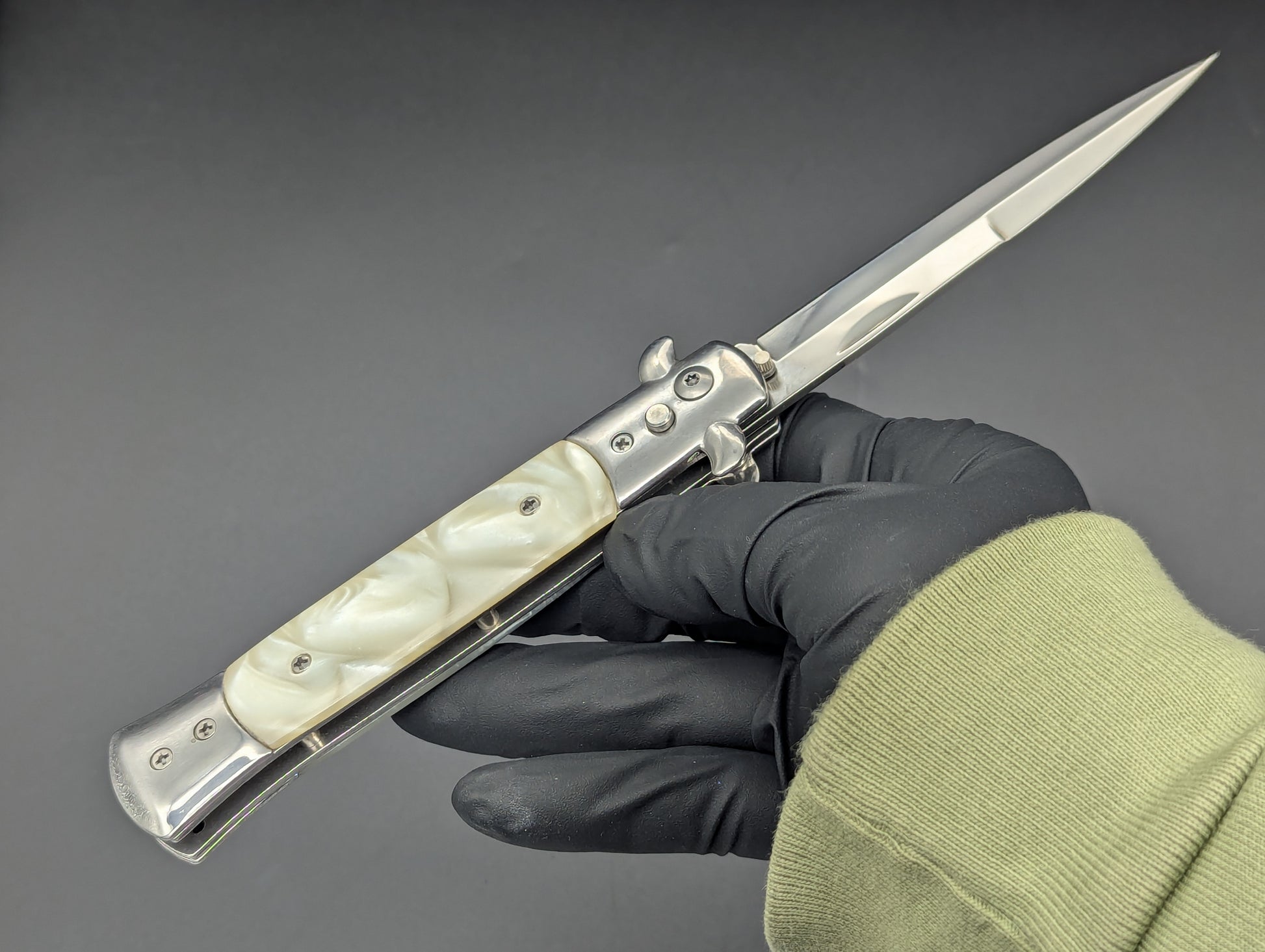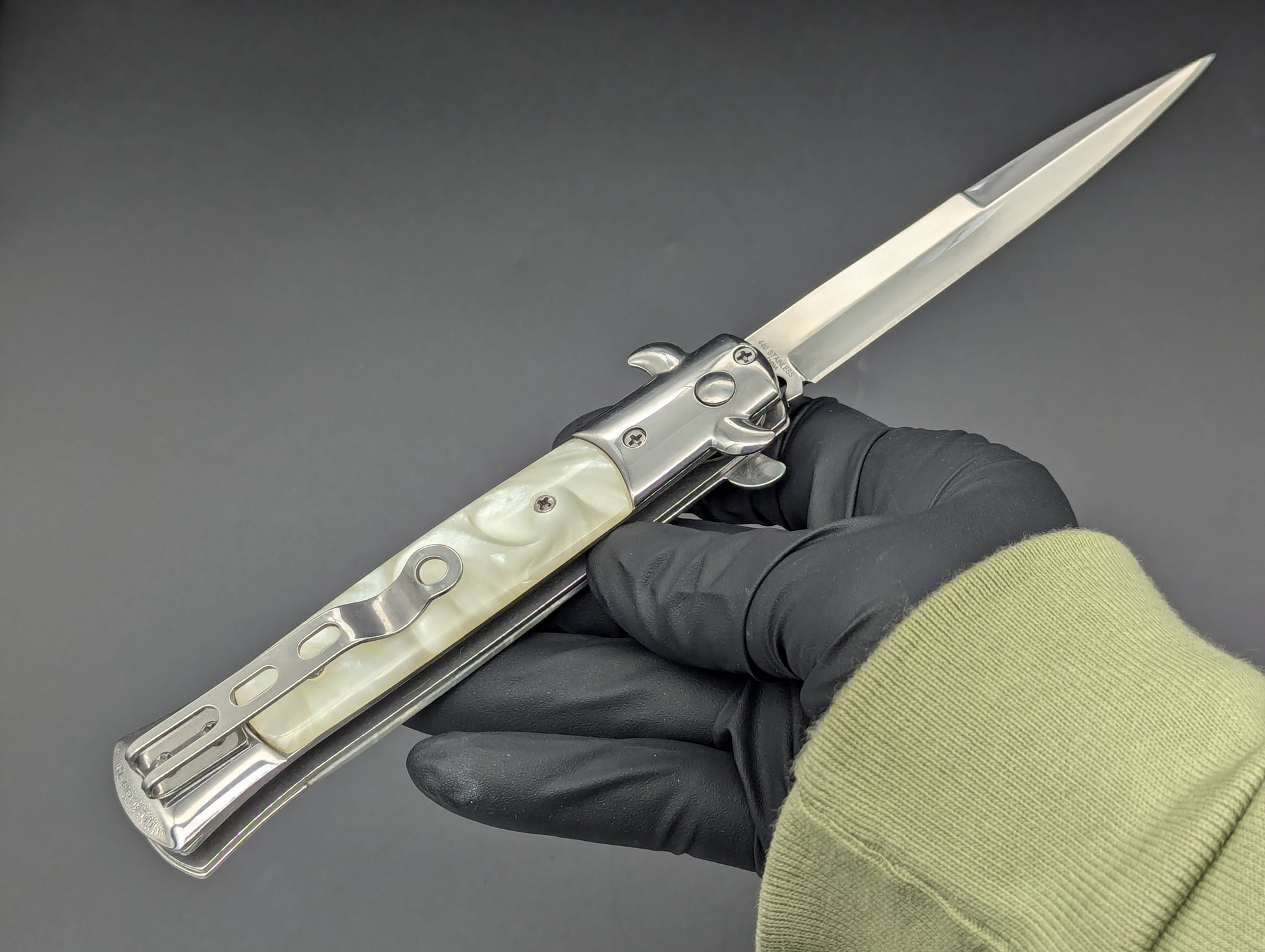 THE MILANO DIABLO STILETTO! AN OLDIE BUT GOODIE! THESE ARE FANTASTIC AUTOMATIC OPENING KNIVES. ALL STAINLESS STEEL CONSTRUCTION WITH FAUX WHITE PEARL ACRYLIC HANDLE SCALES. 3.75" TAPERED BAYONET STYLE GRIND BLADE. FEATURES A SAFETY THAT LOCKS BLADE IN OPEN AND CLOSED POSITIONS. SOLID STEEL POCKET CLIP.  OVERALL LENGTH: 9"
