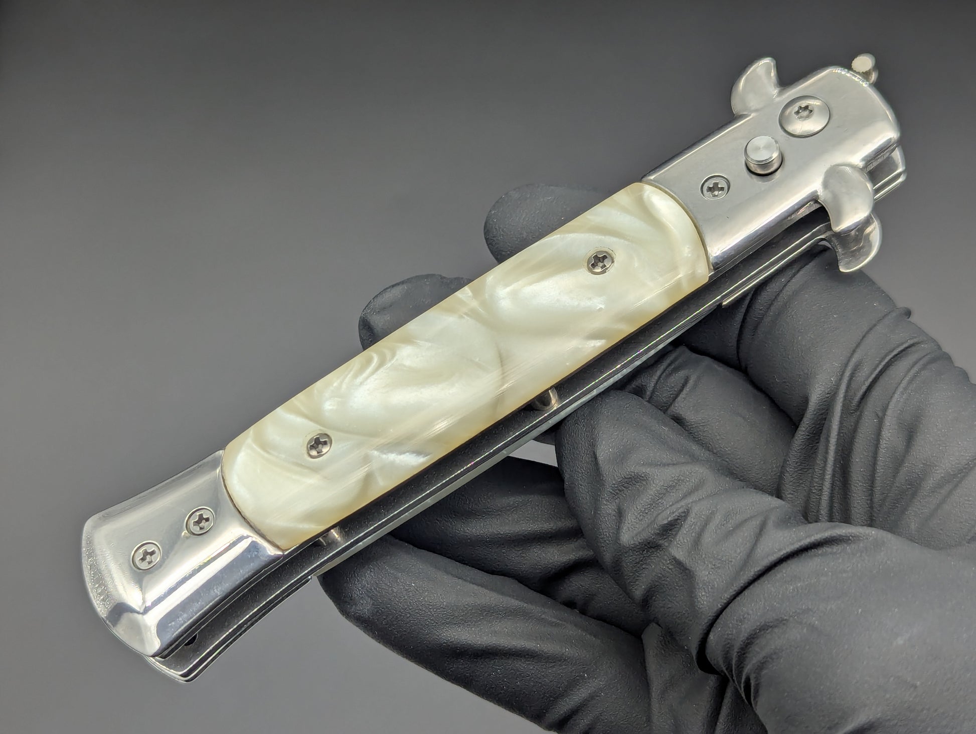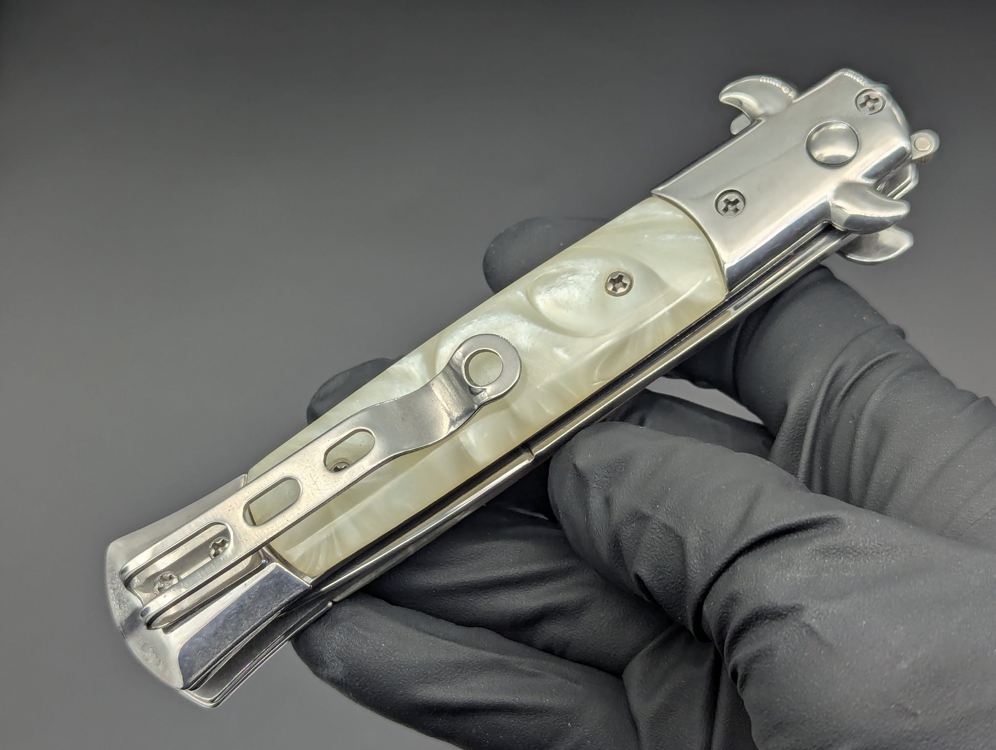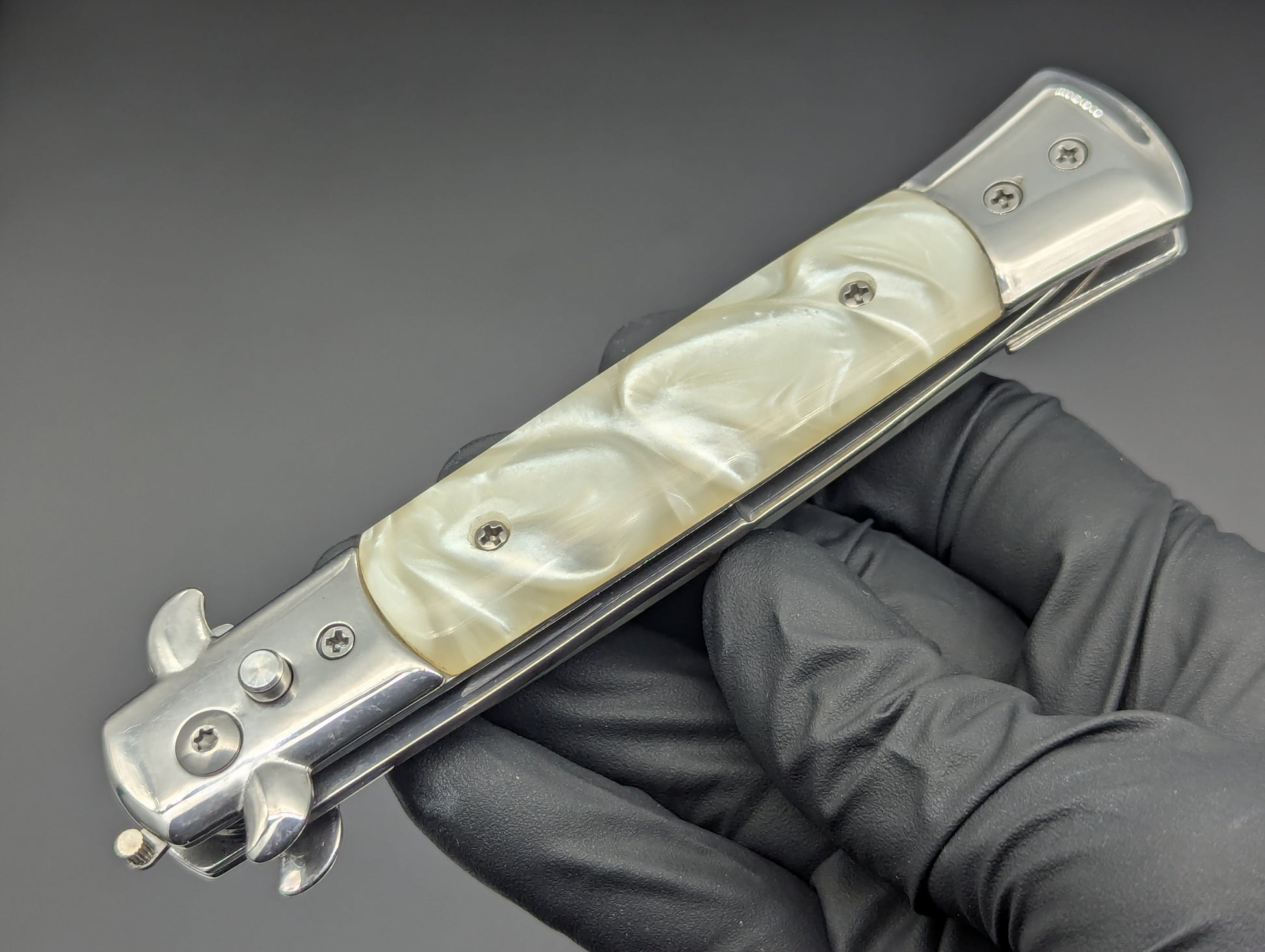 THE MILANO DIABLO STILETTO! AN OLDIE BUT GOODIE! THESE ARE FANTASTIC AUTOMATIC OPENING KNIVES. ALL STAINLESS STEEL CONSTRUCTION WITH FAUX WHITE PEARL ACRYLIC HANDLE SCALES. 3.75" TAPERED BAYONET STYLE GRIND BLADE. FEATURES A SAFETY THAT LOCKS BLADE IN OPEN AND CLOSED POSITIONS. SOLID STEEL POCKET CLIP.  OVERALL LENGTH: 9"