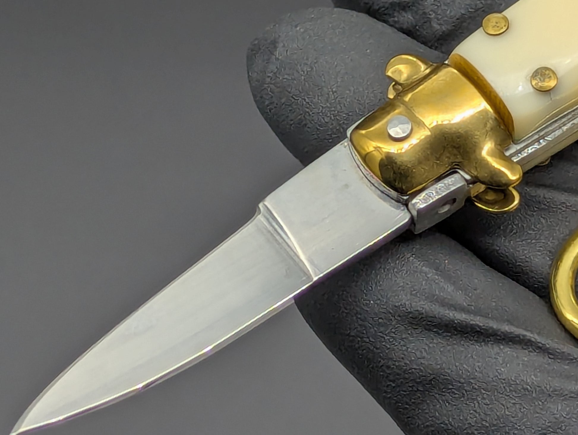 AWESOME NEW ITALIAN STYLE MINI "JUMBO" STILETTO KEYRINGS ARE SUPER COOL AND VERY FUN FIDGET TOYS. THIS MODEL FEATURES FAUX IVORY SCALE. BRASS FINISHED HARDWARE WITH A NICE BIG STAINLESS FLAT GRIND BLADE. AN EXTRA FEATURE THAT'S UNPRECEDENTED ON THESE KEYRINGS IS THE "SAFETY LOCK" TO PREVENT ACCIDENTAL OPENING. PICKLOCK CLOSING SYSTEM. THESE ARE JUST FANTASTIC ITEMS AND VERY LIMITED!