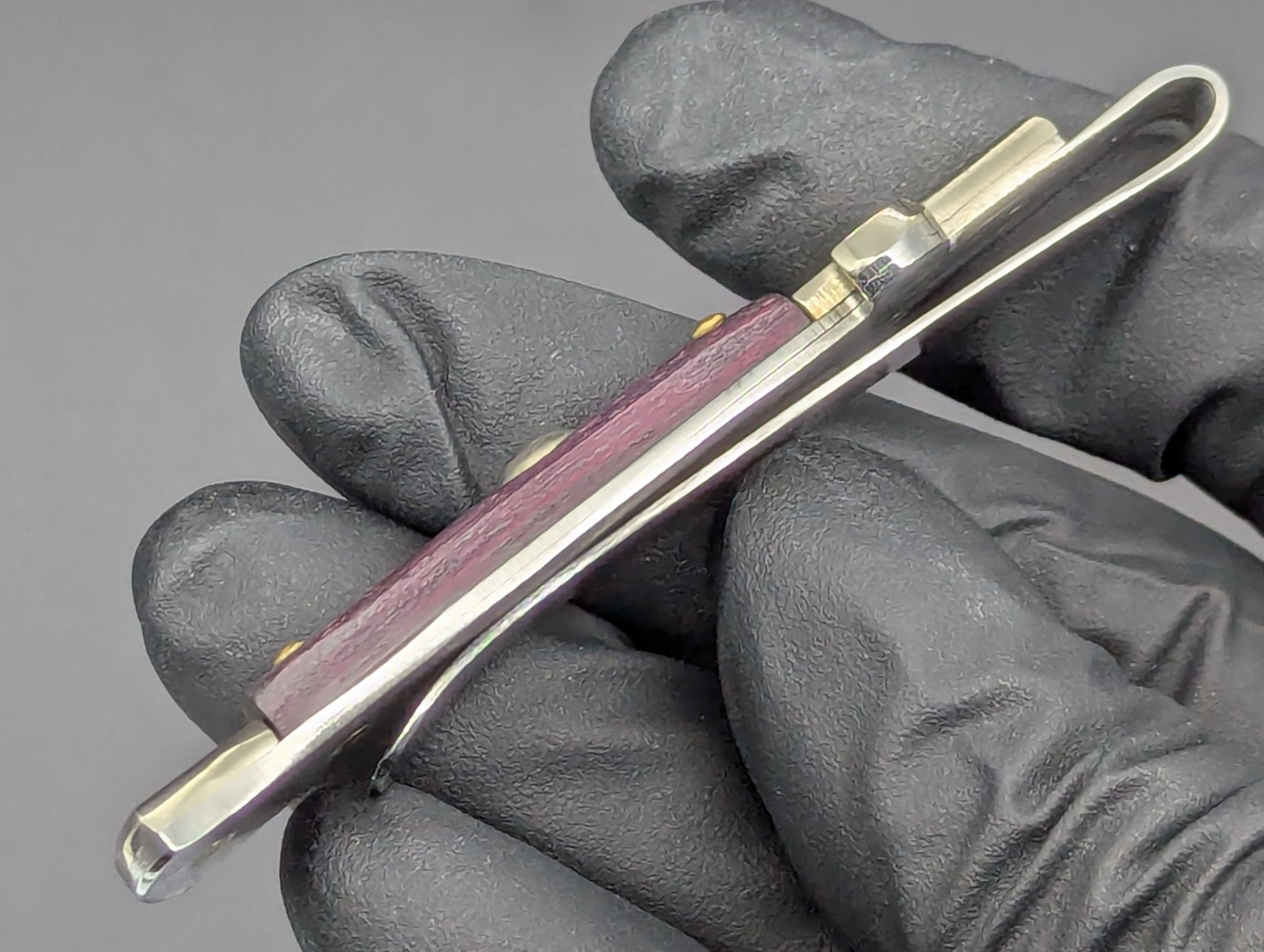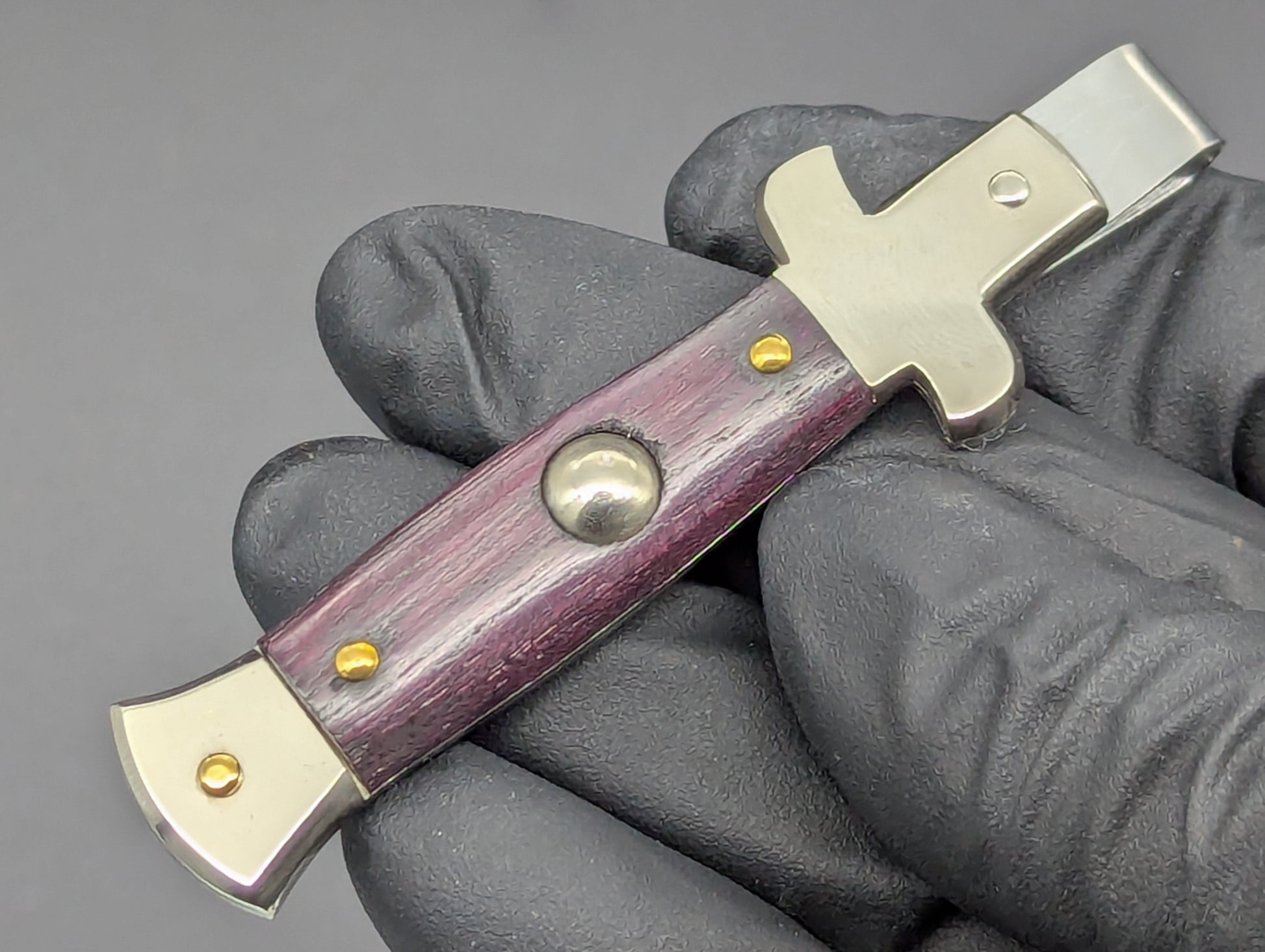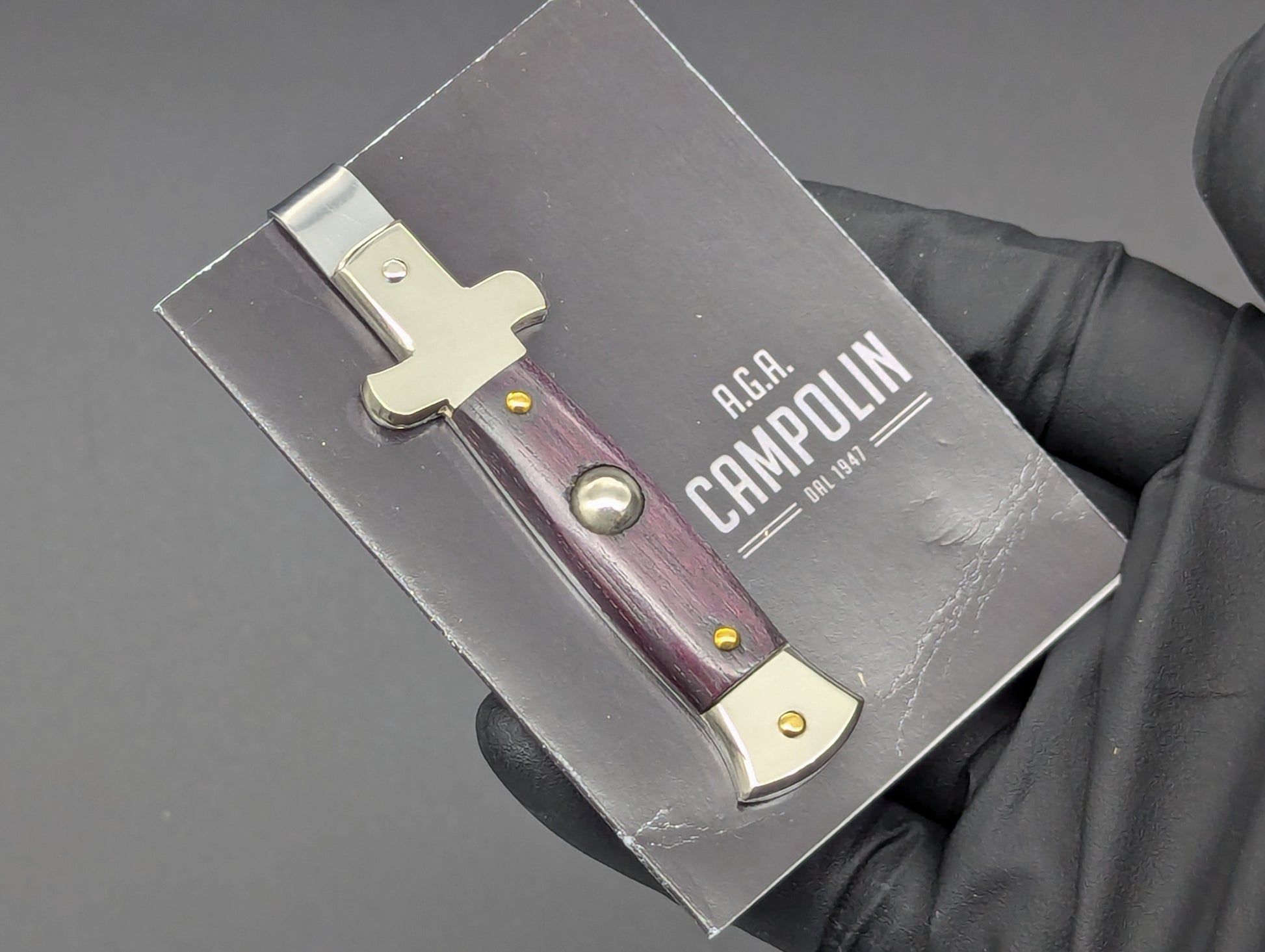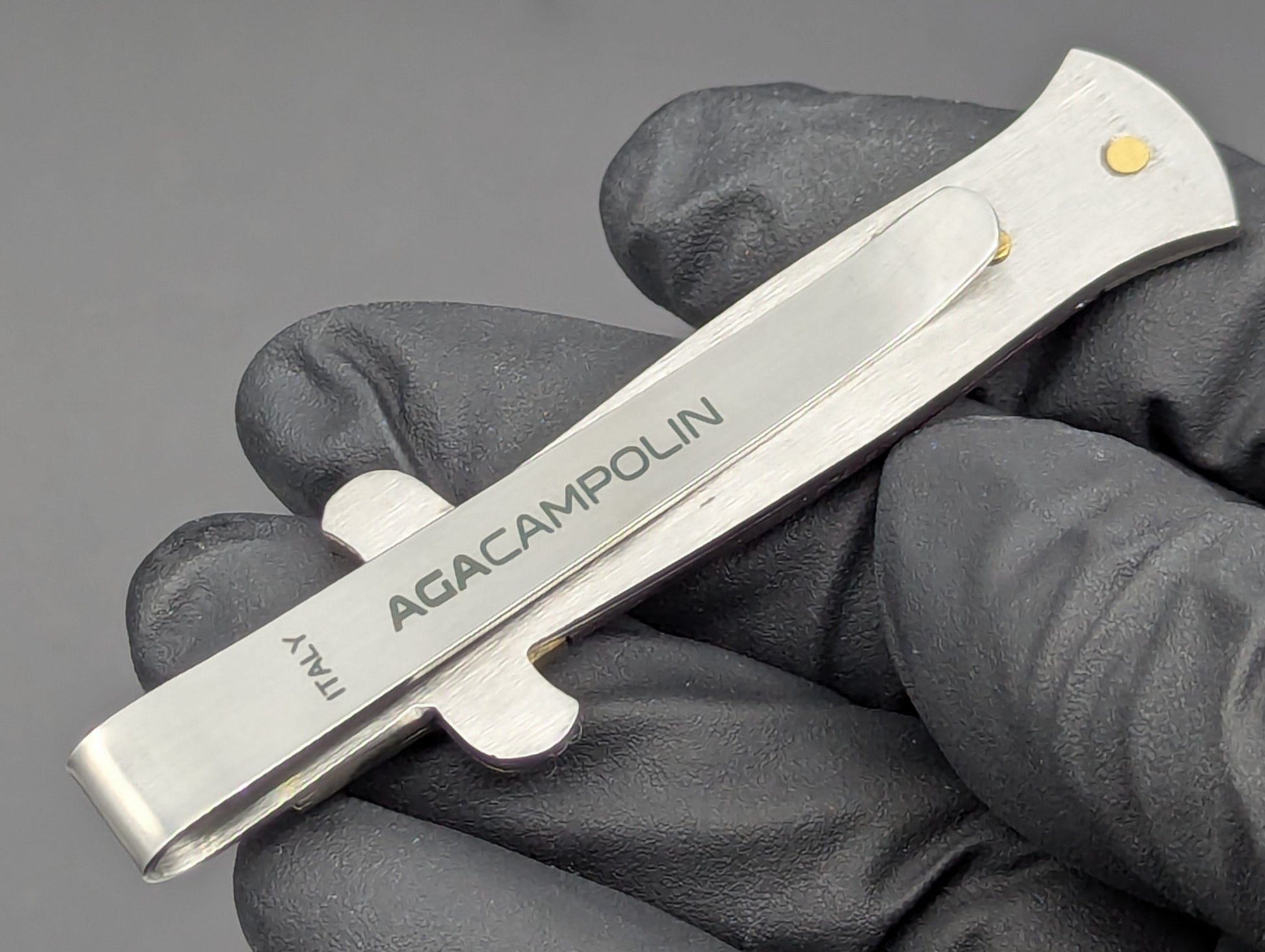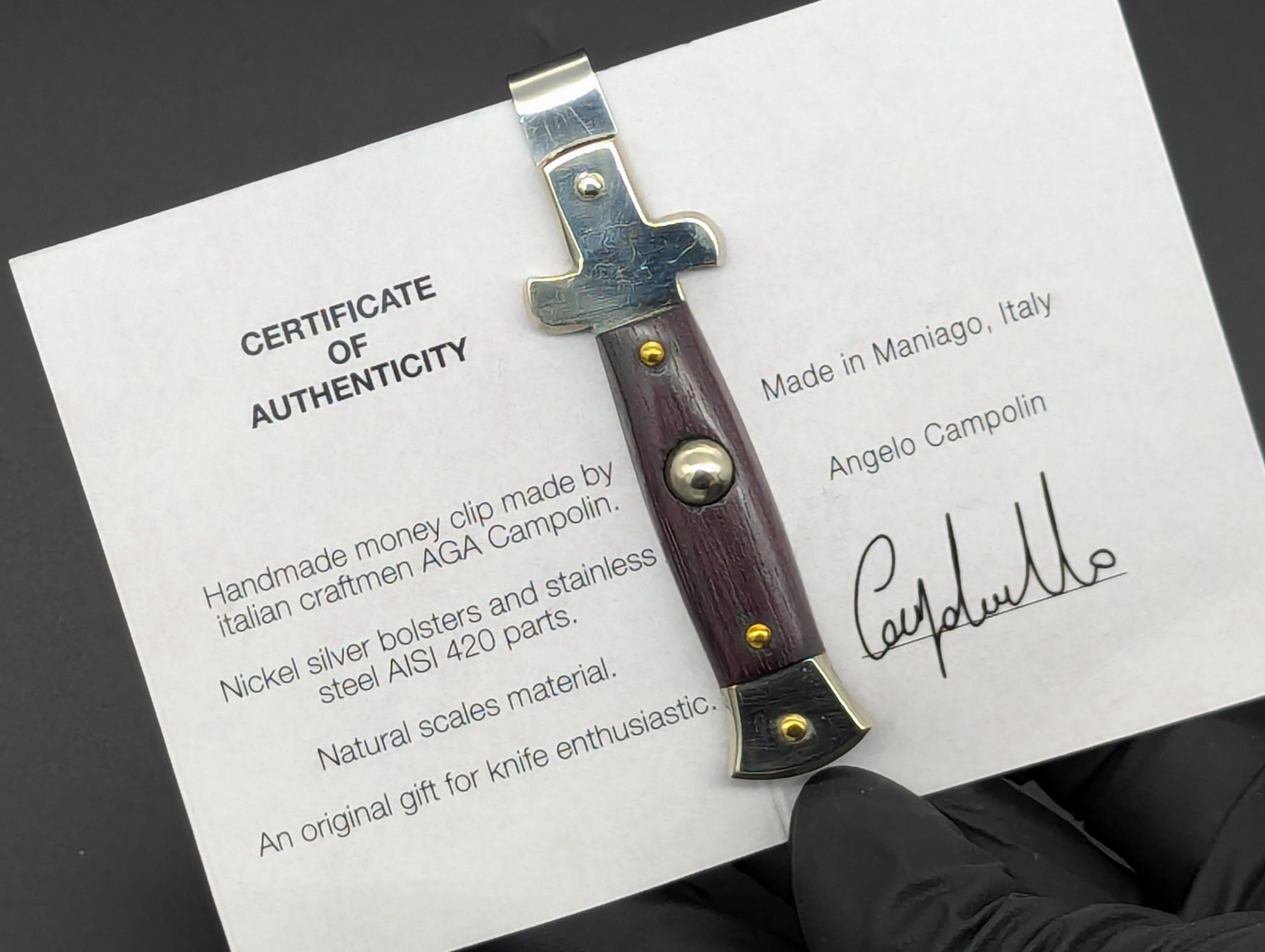 NEW OLD STOCK UNUSED MINT CONDITION AGA CAMPOLIN MONEY CLIPS.  FOUND A SMALL STASH FROM HALF A DECADE BACK! CERTIFICATE OF AUTHENTICITY.  GENUINE MATERIALS LIKE THE REAL STILETTOS! THESE OFFER UP SOLID WOOD SCALES.  THESE ARE NON FUNCTIONING NOVELTY MONEY CLIPS HANDMADE IN MANIAGO ITALY