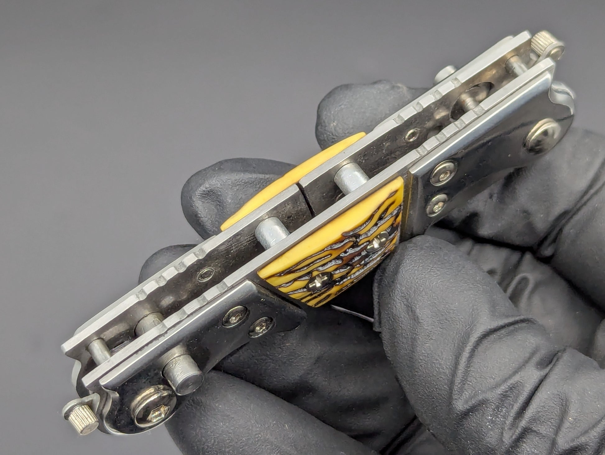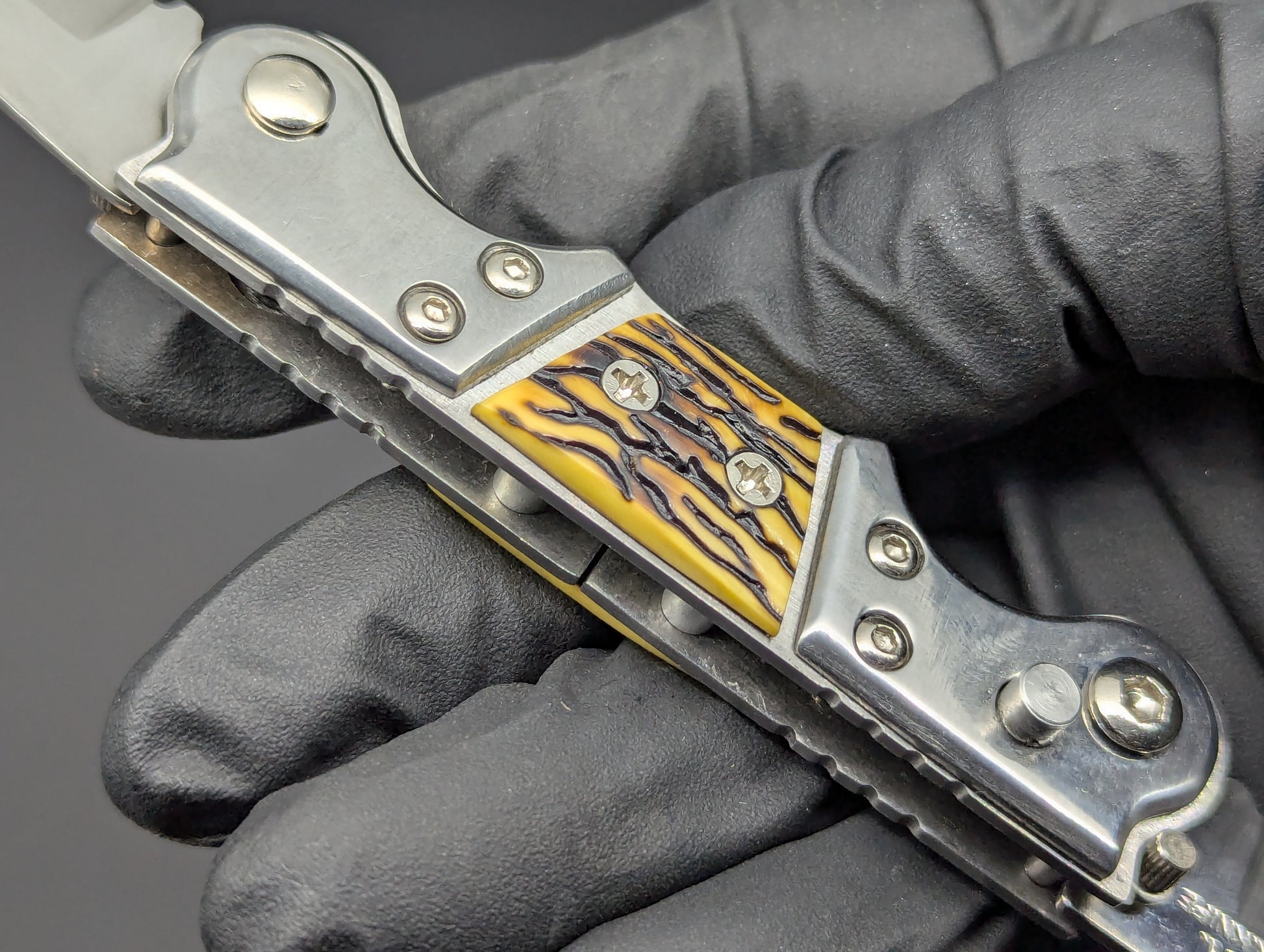 NEW OLD STOCK VERY EARLY 2000 DOUBLE BLADE MINI CALI-LEGAL SIZED AUTO KNIVES WITH FAUX STAG SCALES. GOOD OLE SUPER KNIFE BRAND WITH OLD SCHOOL "USA" BLADE STAMP AND ALL! PLAIN AND LAST SERRATED BLADES WITH SAFETIES ON BOTH. THESE ARE JUST COOL