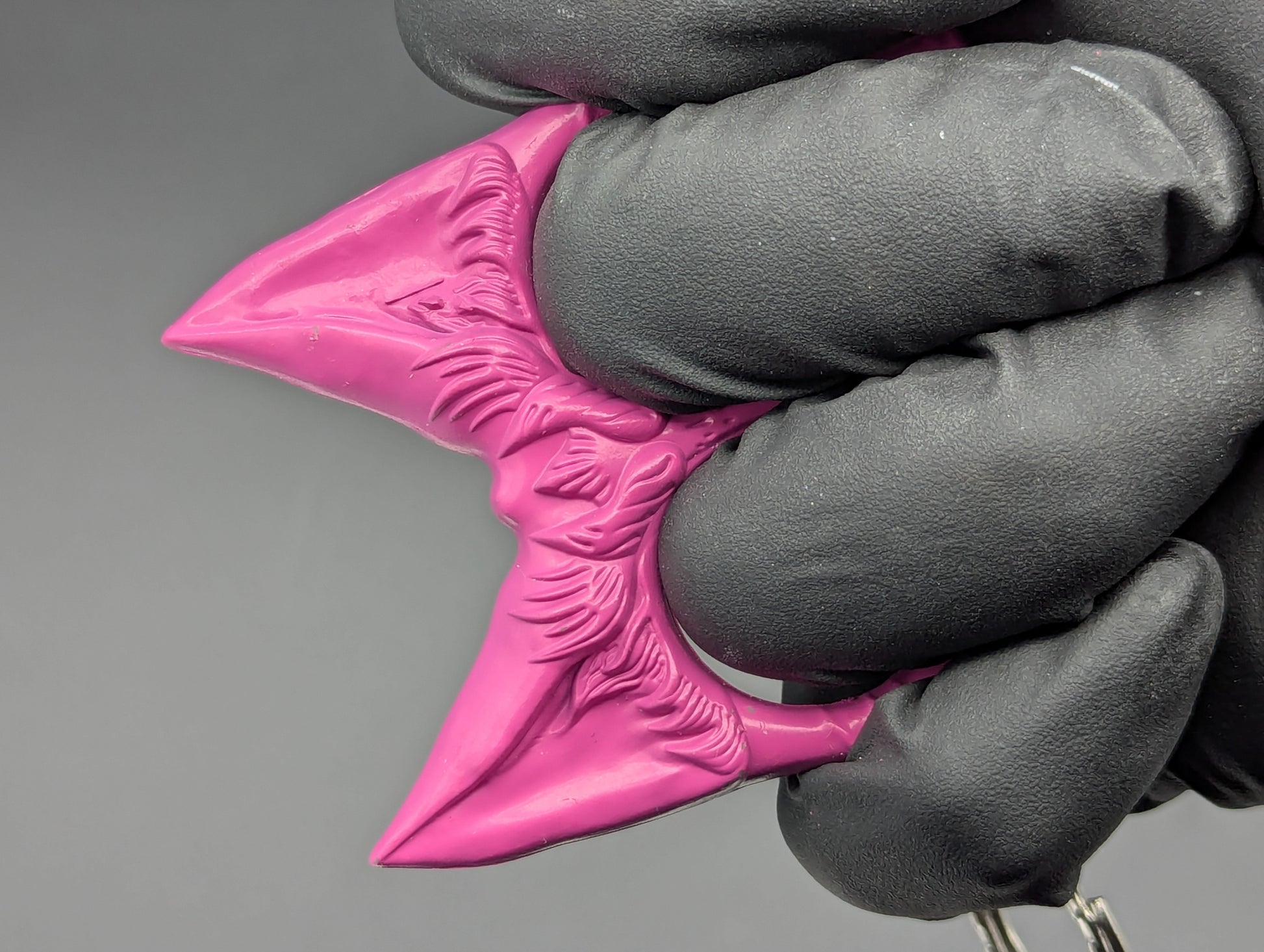 NEW LADIES PINK FINISHED "CAT" SELF DEFENSE CHARM AND KEYRING ATTACHMENT. MADE OF ABS IMPACT RESISTANT MOLDED PLASTIC. JUST PLACE YOUR FINGERS THROUGH THE CATS "EYES" FOR A GOOD GRIP. VERY HEAVY DUTY DURABLE CONSTRUCTION