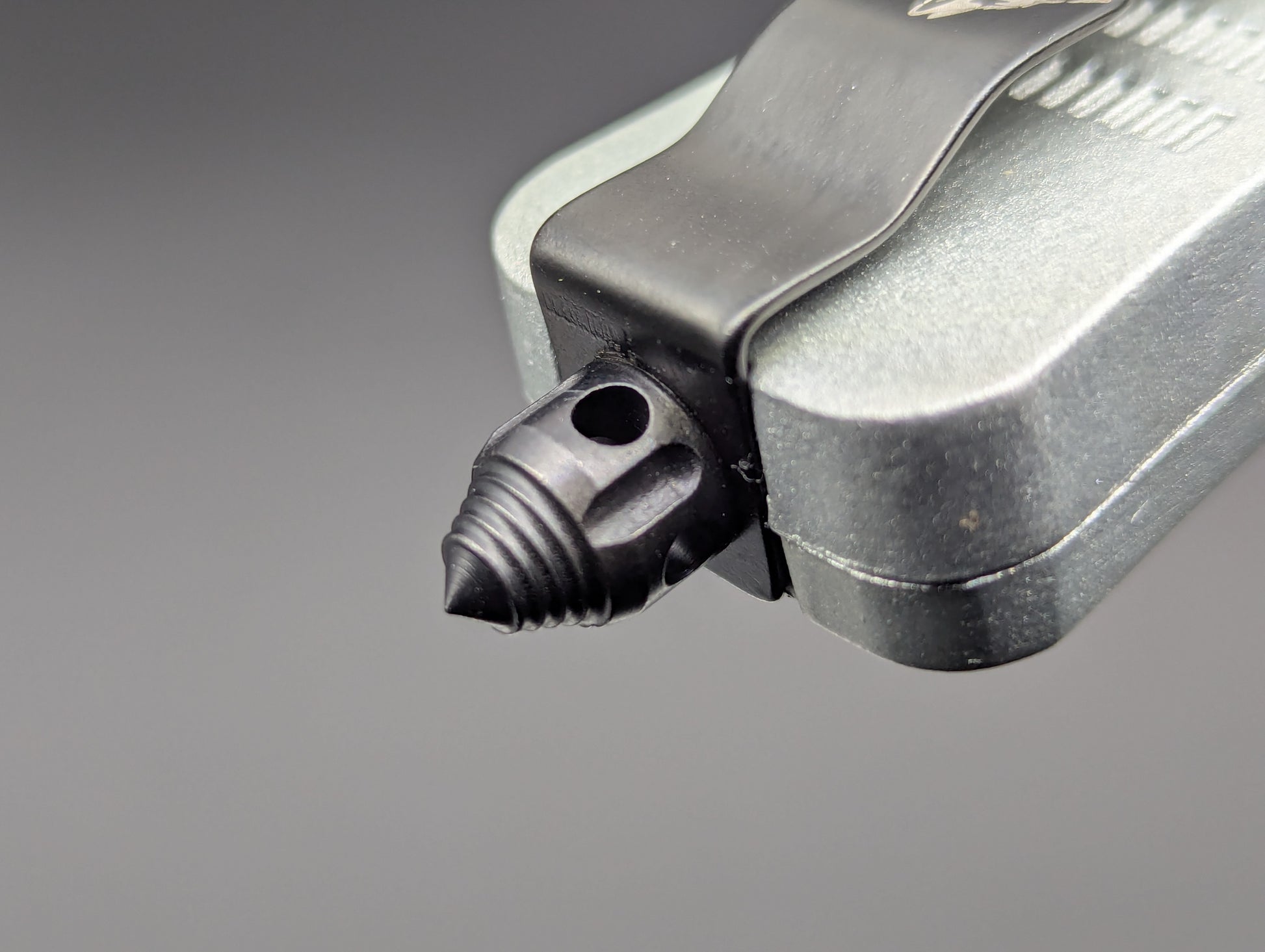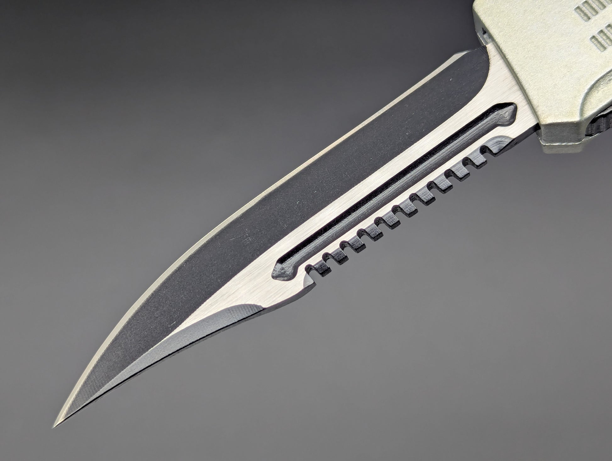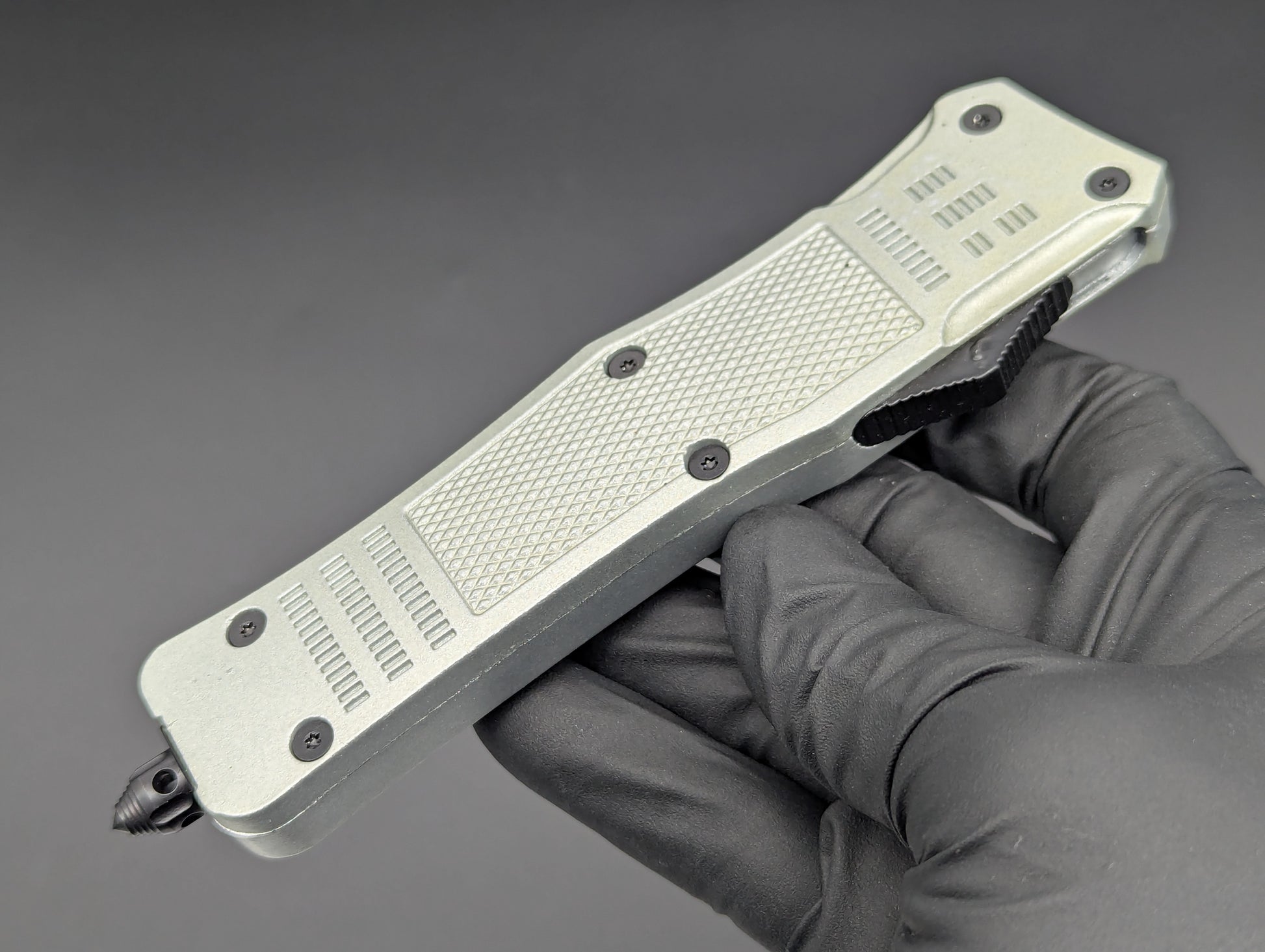 2-TONE FINISHED 440C STAINLESS STEEL RAMBO STYLE CLIP POINT BLADE DUAL ACTION AUTOMATIC OPENING AND CLOSING. SILVER FINISHED ALUMINUM ZINC HANDLES. SPRING STEEL POCKET CLIP. TUNGSTEN CARBIDE GLASS BREAKER ATTACHMENT. 9.5" OL 3.75" BL