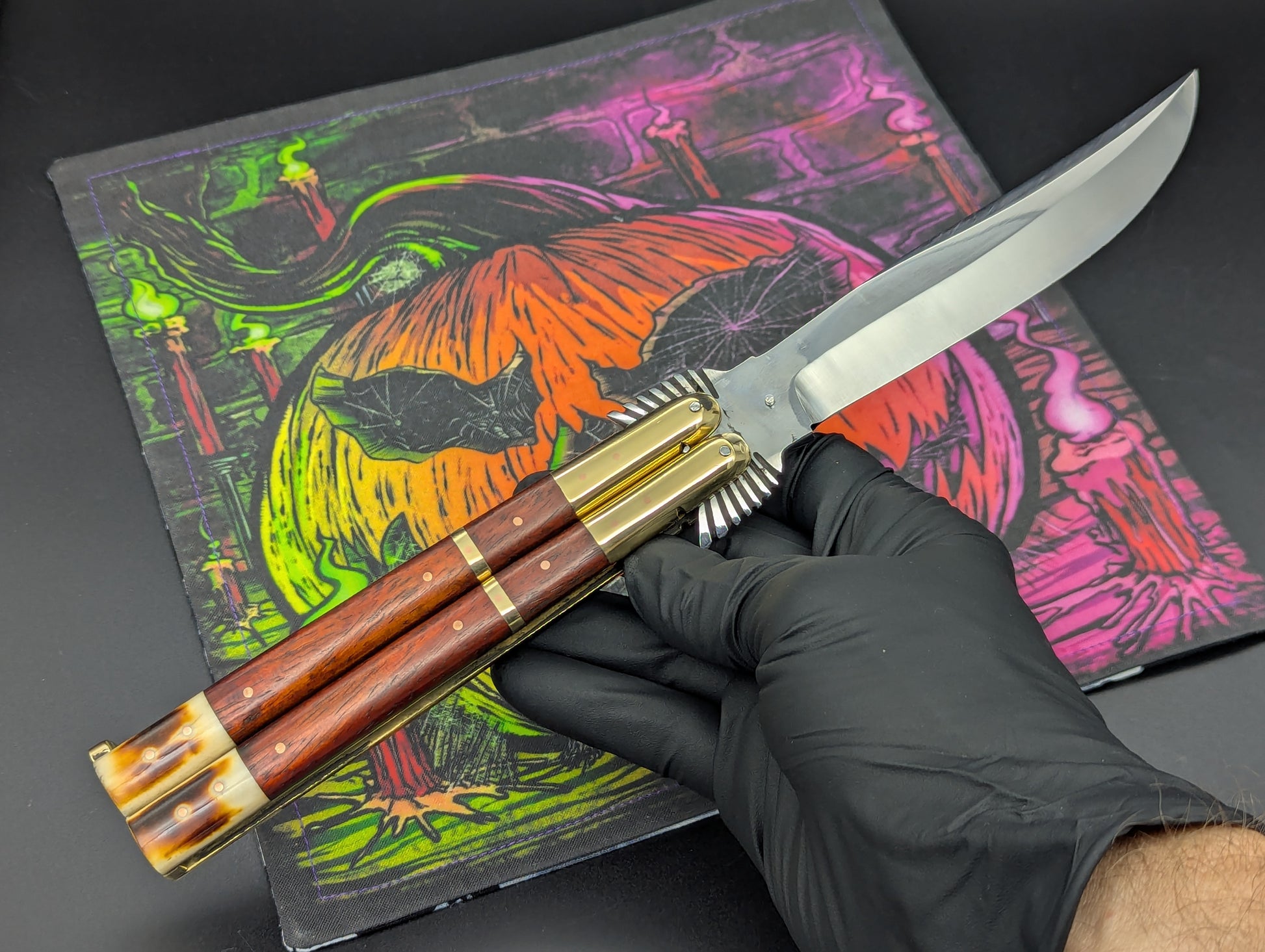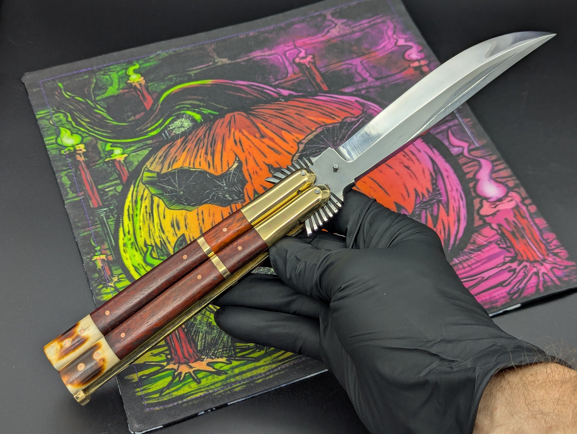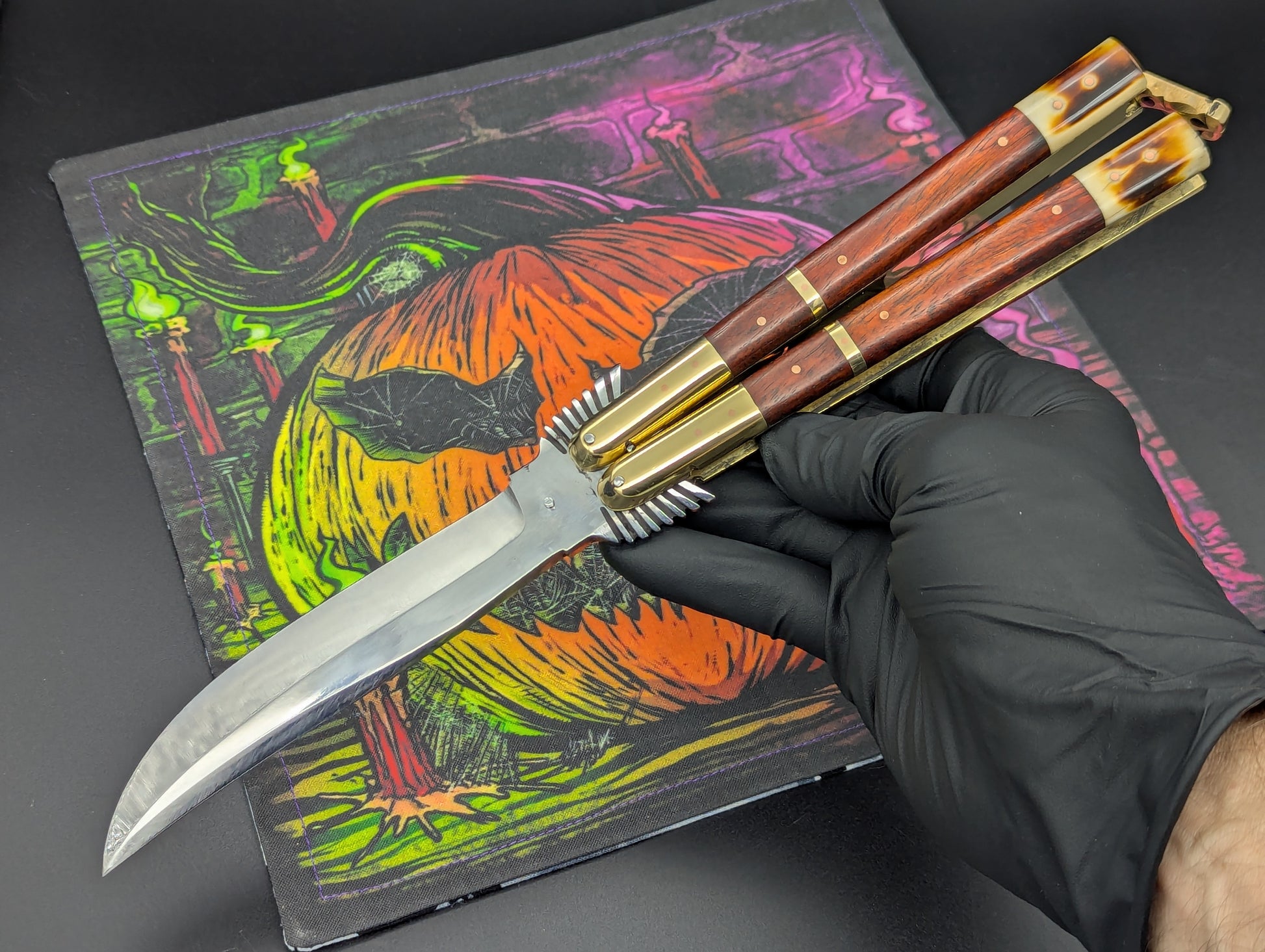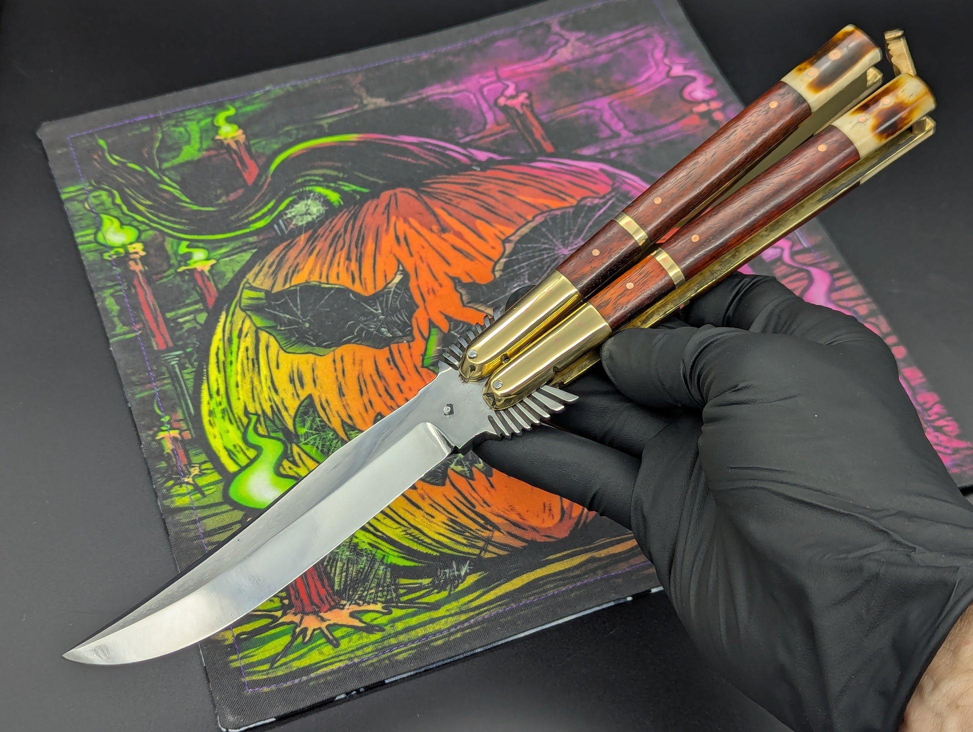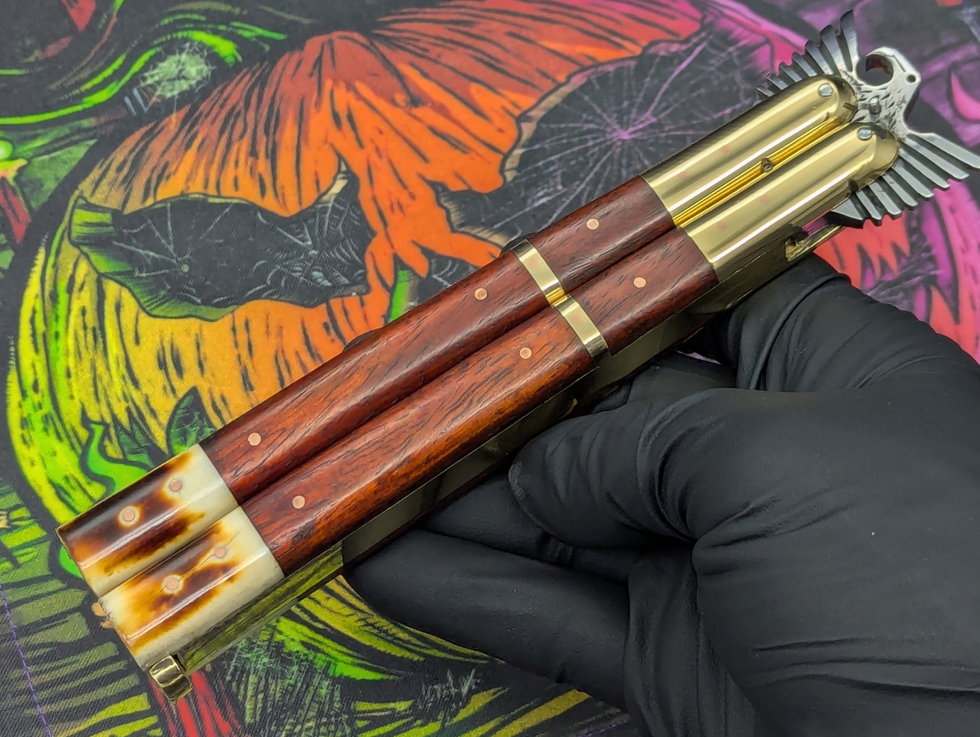 VERY LIMITED CARVED "EAGLE TANG" PHILIPPINES HANDMADE BALISONG. ALL GLEAMING BRASS CONSTRUCTION. DOUBLE SECTIONS OF POLISHED RED WOOD SCALES WITH BRASS UPPER BOLSTERS AND BURNT BONE LOWER. HIGH CARBON STEEL "CLIP POINT" GRIND BLADE. ABSOLUTELY CLASSIC! MAKERS MARK ON SAFETY LATCH. 11.25" OPEN LENGTH. 5.25" BLADE LENGTH. 272 GRAMS OVERALL WEIGHT