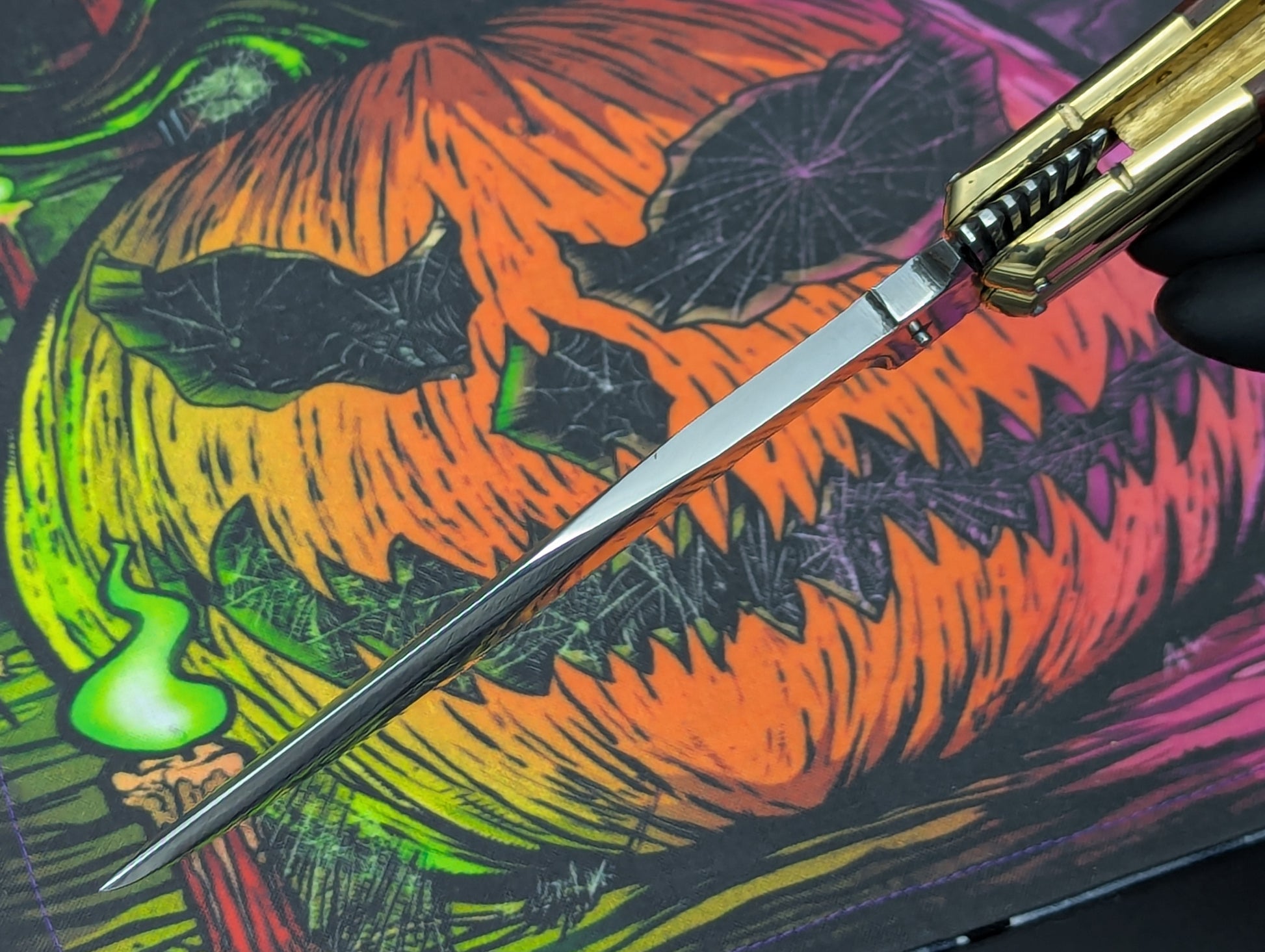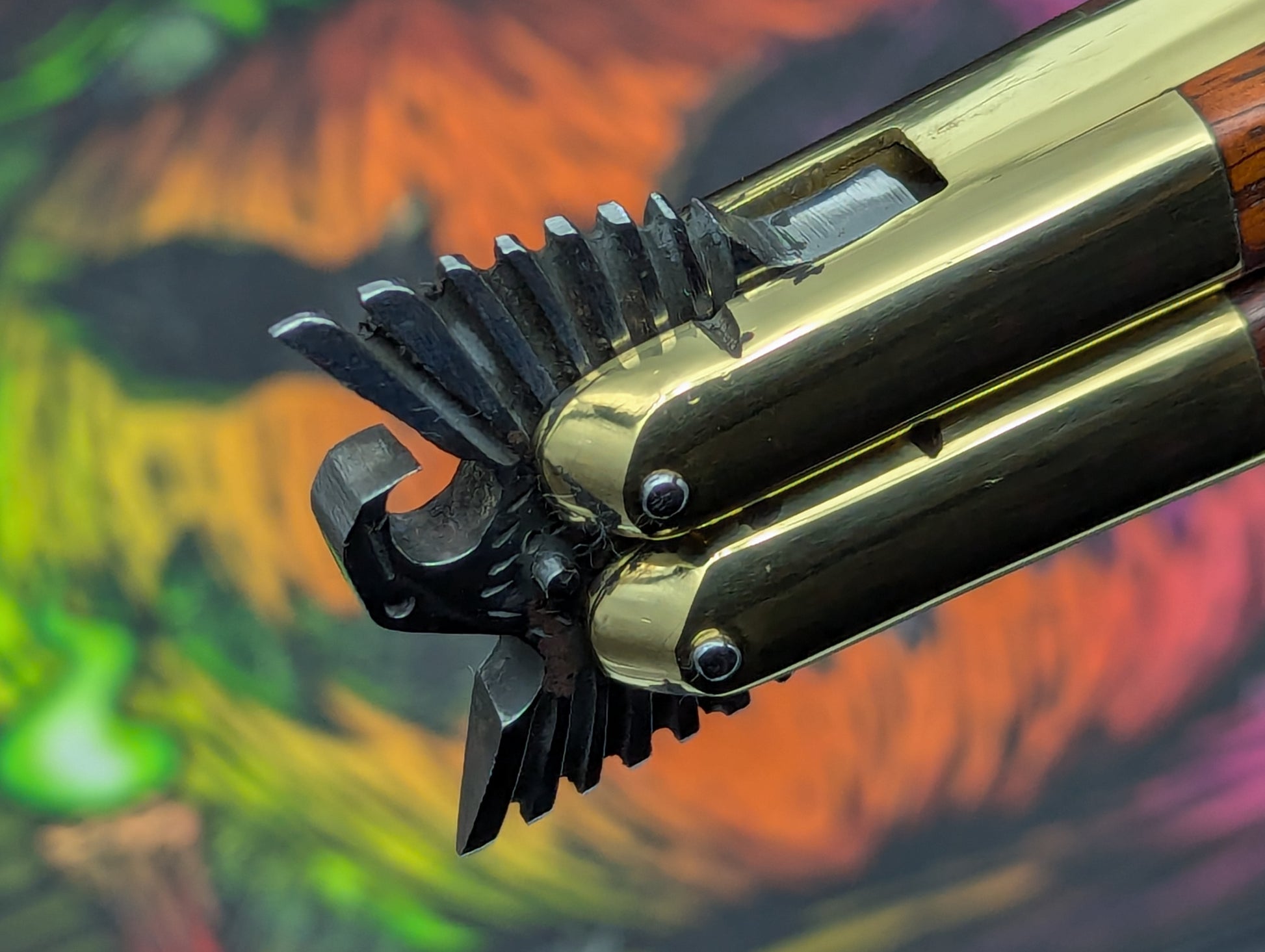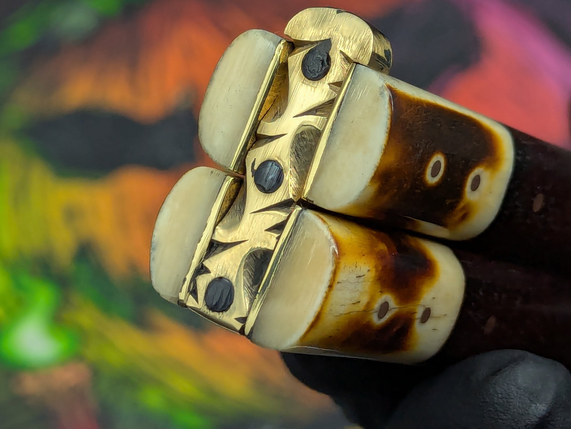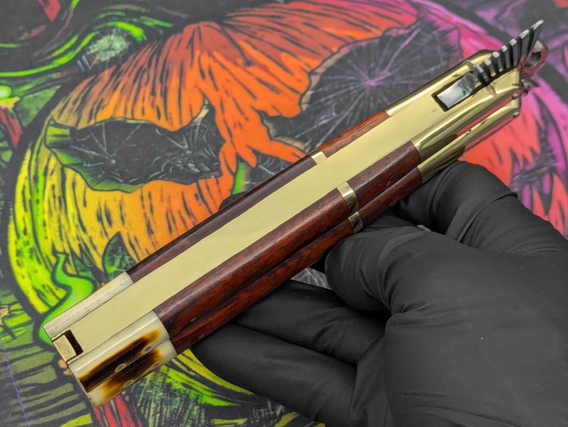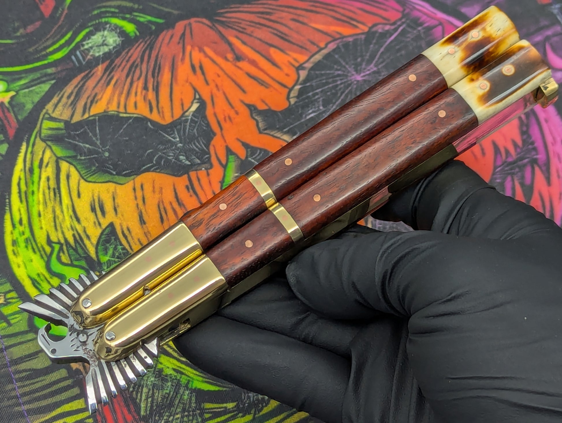 VERY LIMITED CARVED "EAGLE TANG" PHILIPPINES HANDMADE BALISONG. ALL GLEAMING BRASS CONSTRUCTION. DOUBLE SECTIONS OF POLISHED RED WOOD SCALES WITH BRASS UPPER BOLSTERS AND BURNT BONE LOWER. HIGH CARBON STEEL "CLIP POINT" GRIND BLADE. ABSOLUTELY CLASSIC! MAKERS MARK ON SAFETY LATCH. 11.25" OPEN LENGTH. 5.25" BLADE LENGTH. 272 GRAMS OVERALL WEIGHT