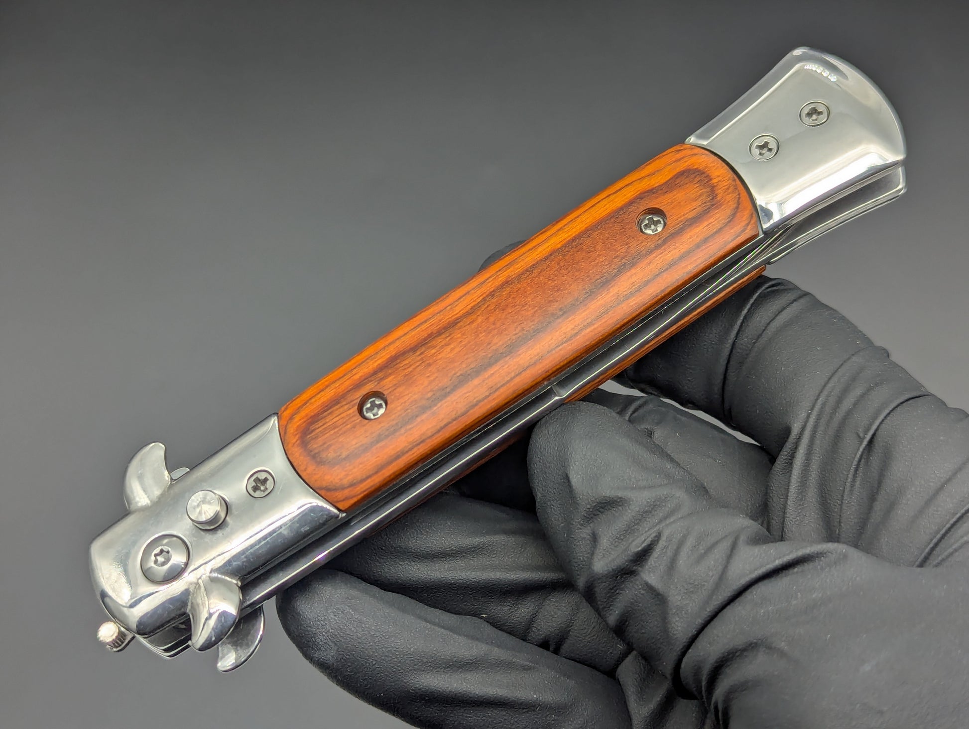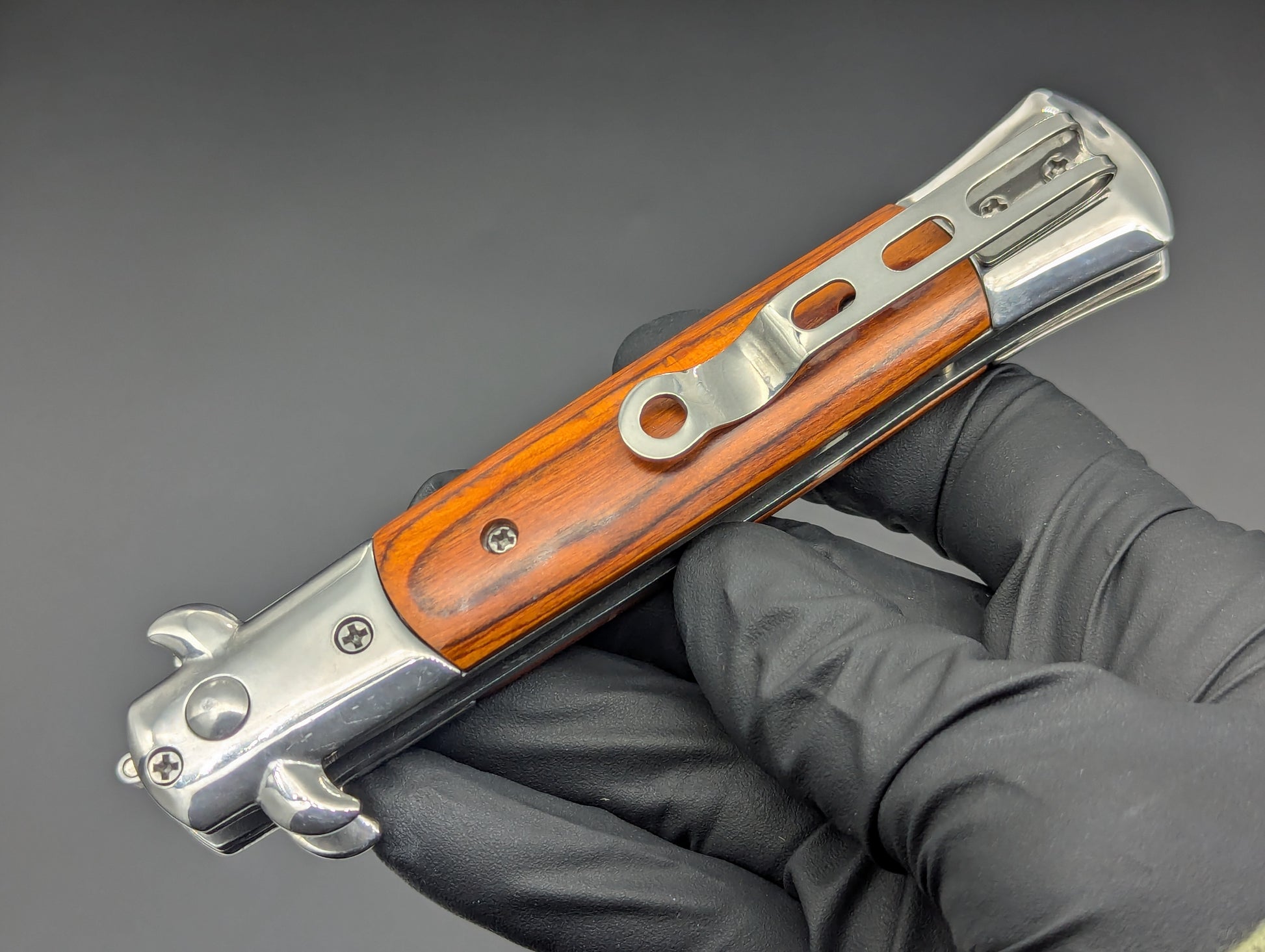 THE MILANO DIABLO STILETTO! AN OLDIE BUT GOODIE! THESE ARE FANTASTIC AUTOMATIC OPENING KNIVES. ALL STAINLESS STEEL CONSTRUCTION WITH SOLID RED WOOD HANDLE SCALES. 3.75" TAPERED BAYONET STYLE GRIND BLADE. FEATURES A SAFETY THAT LOCKS BLADE IN OPEN AND CLOSED POSITIONS. SOLID STEEL POCKET CLIP.  OVERALL LENGTH: 9"