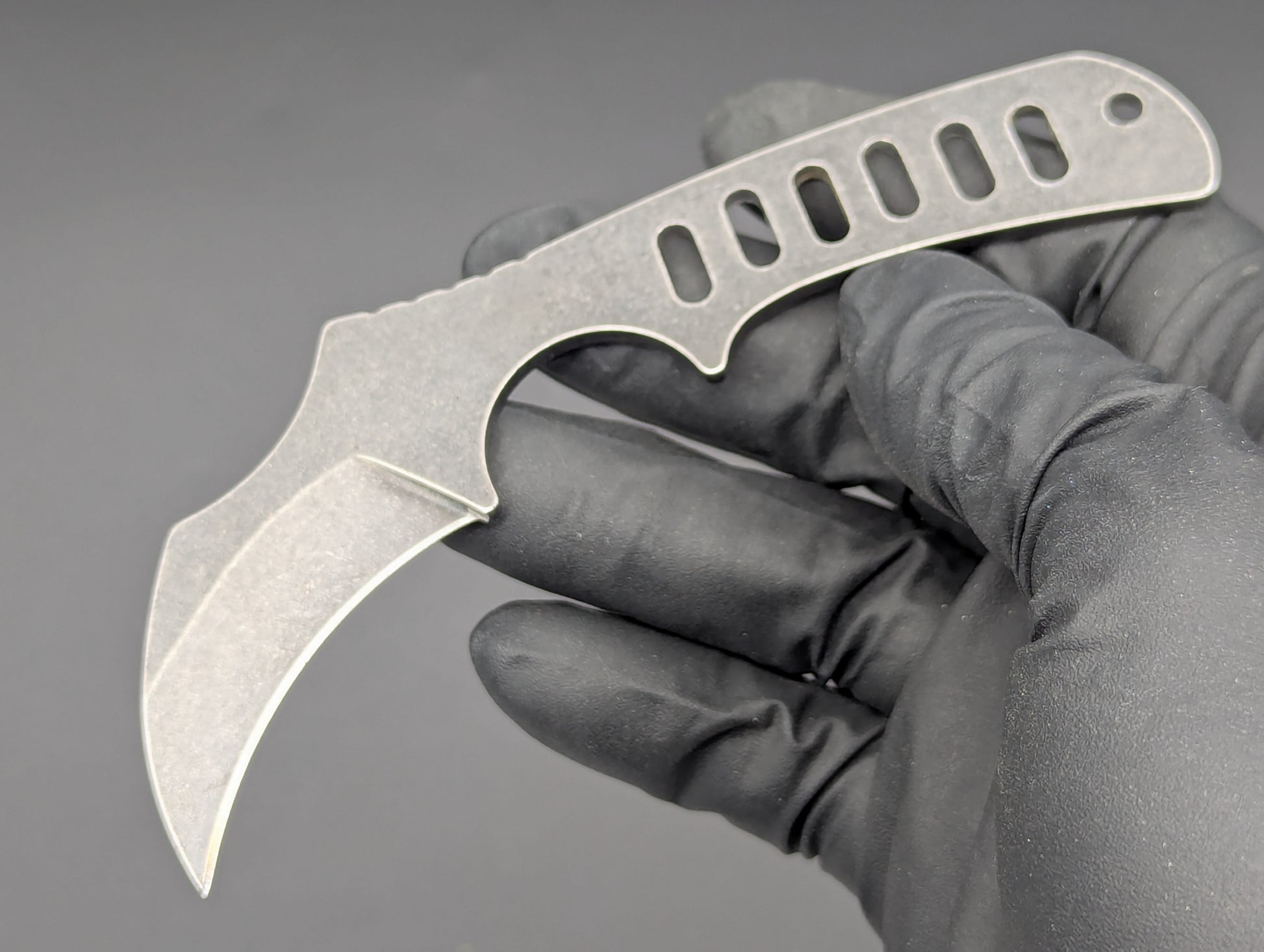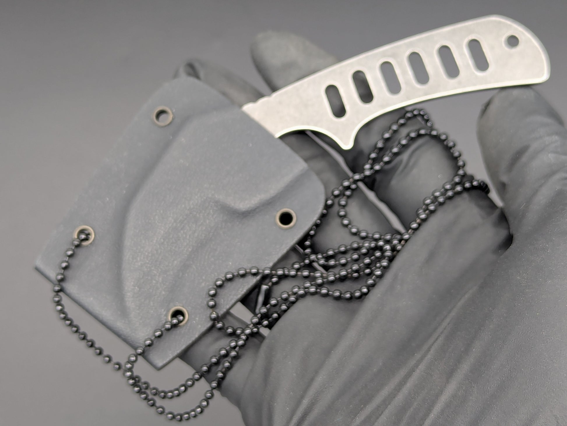 HARDENED STAINLESS STEEL CONSTRUCTION HAWKBILL NECK KNIFE. STONEWASHED FINISH. INCLUDES ABS NECK SHEATH WITH LONG STEEL BEAD CHAIN. OVERALL LENGTH 5" BLADE 1 7/8"