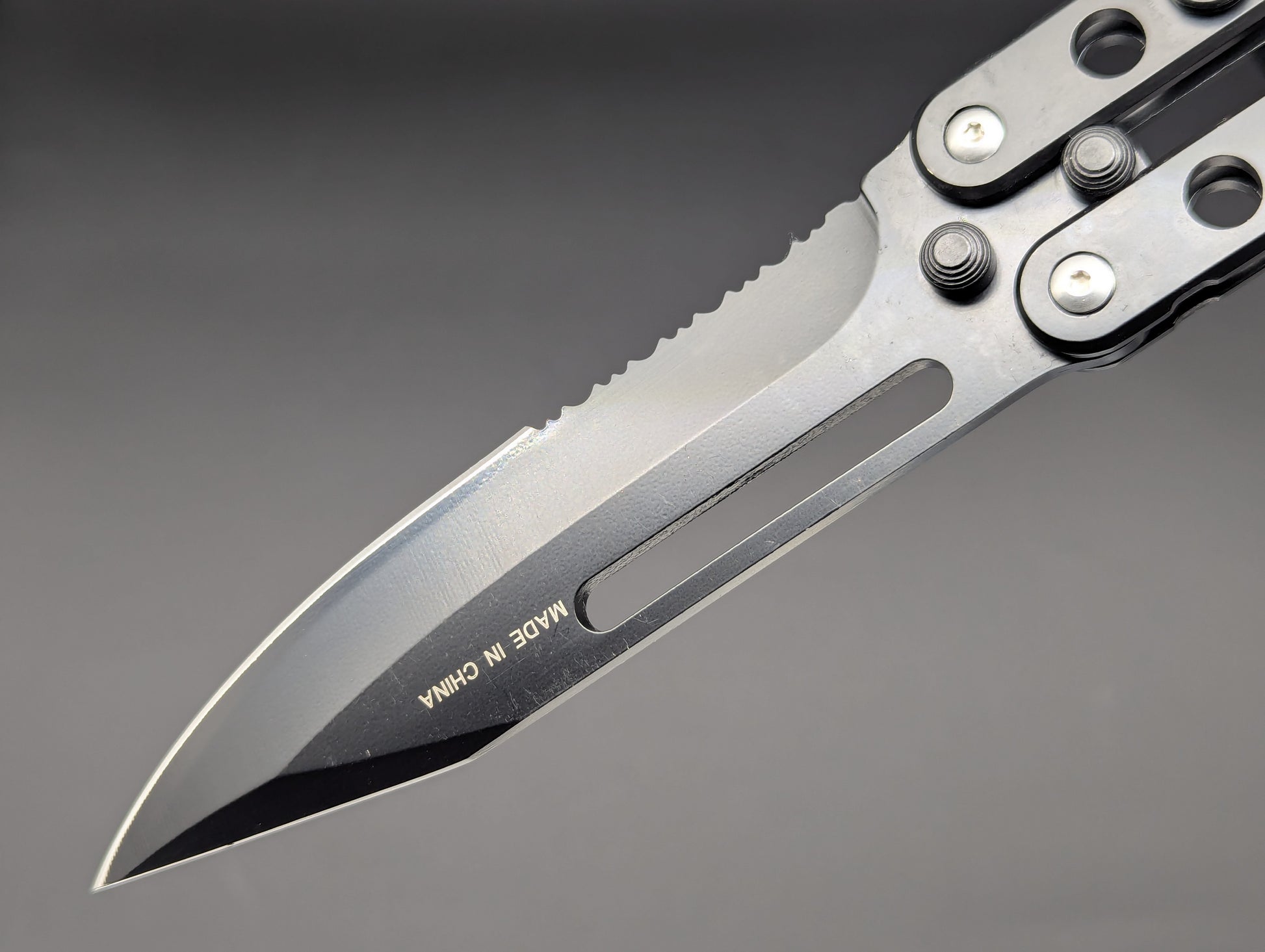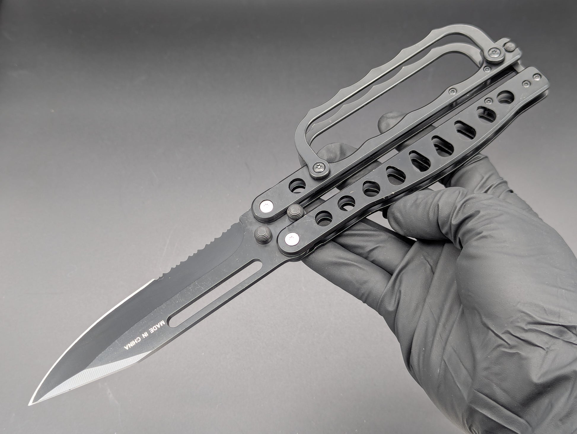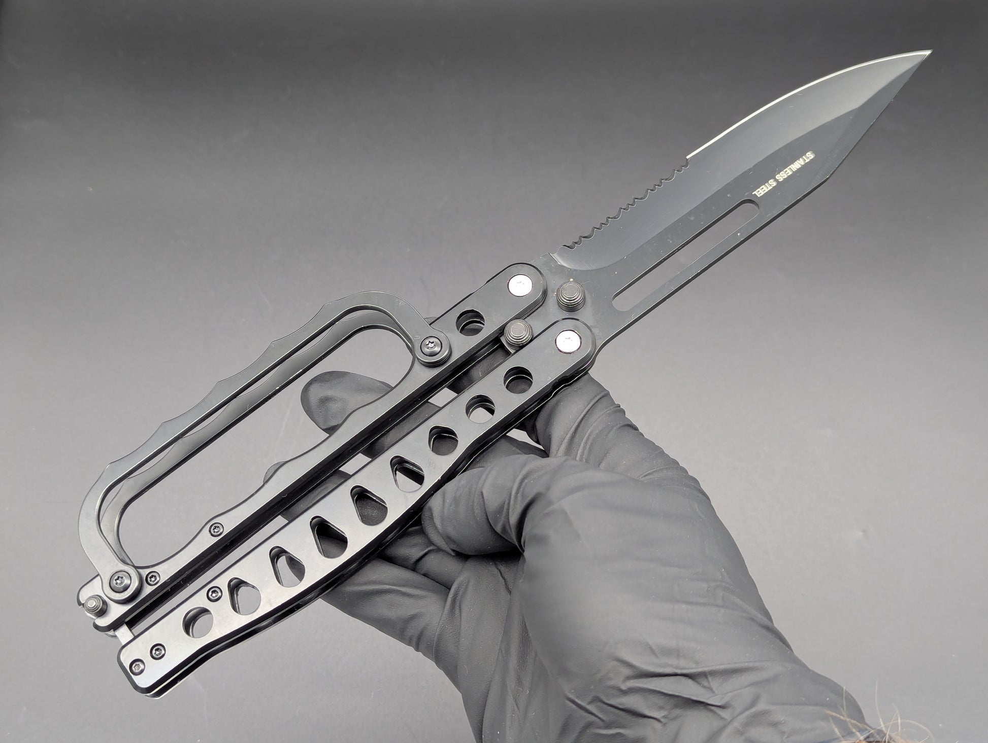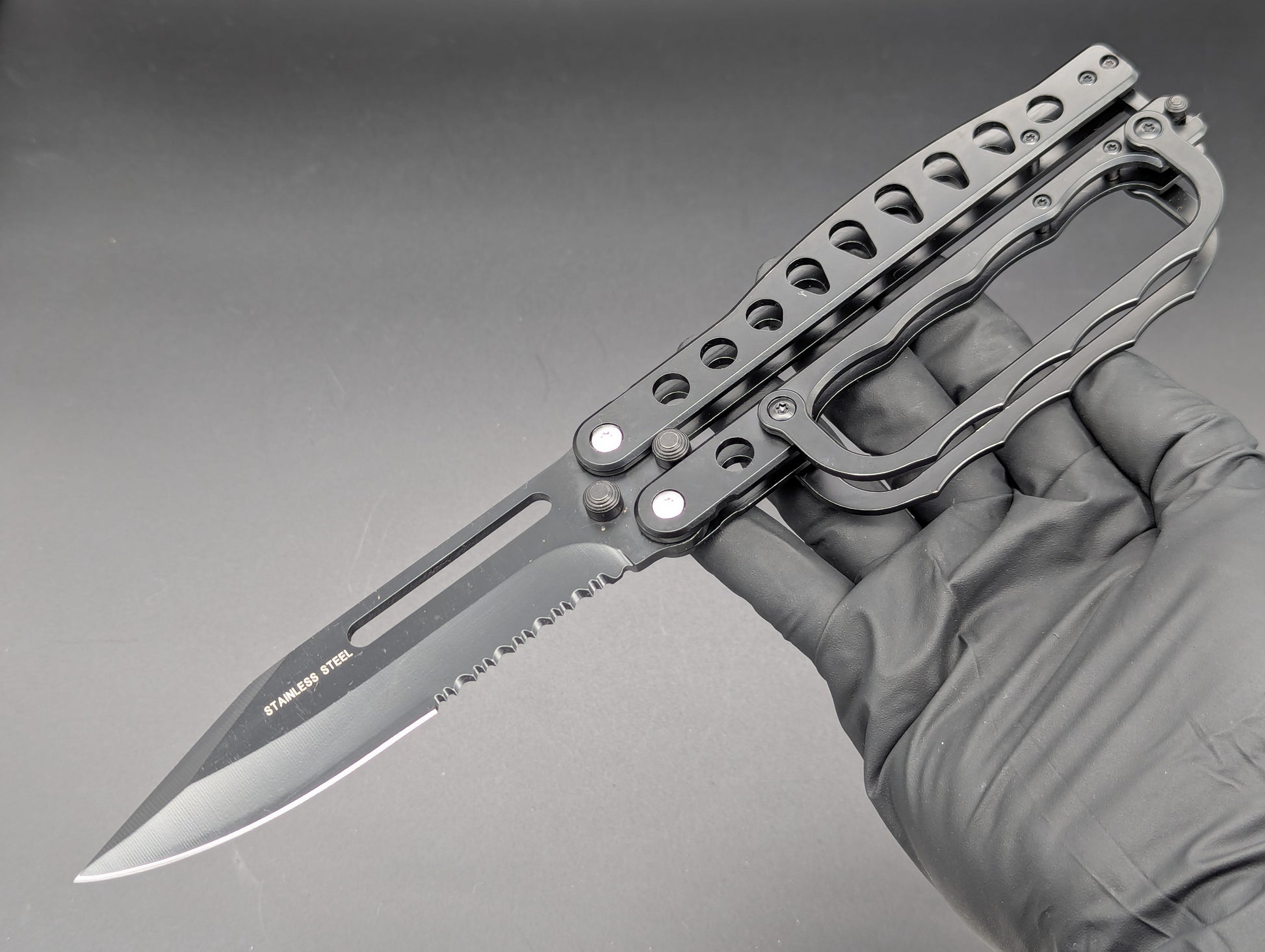 BRINGING THE OLD SCHOOL BACK! SUPER KNIVES BRAND BALISONG TRENCH KNIFE. 11" OVERALL LENGTH OPEN. VERY STRONG STAINLESS STEEL CONSTRUCTION WITH LOCKING CLASP IN THE OPEN AND CLOSED POSITION. SUPER HARDCORE ITEM FOR THE PRICE RANGE! EACH INCLUDES BLACK NYLON SHEATH/ CARRY CASE. STAINLESS AND BLACK FINISHED VERSIONS AVAILABLE