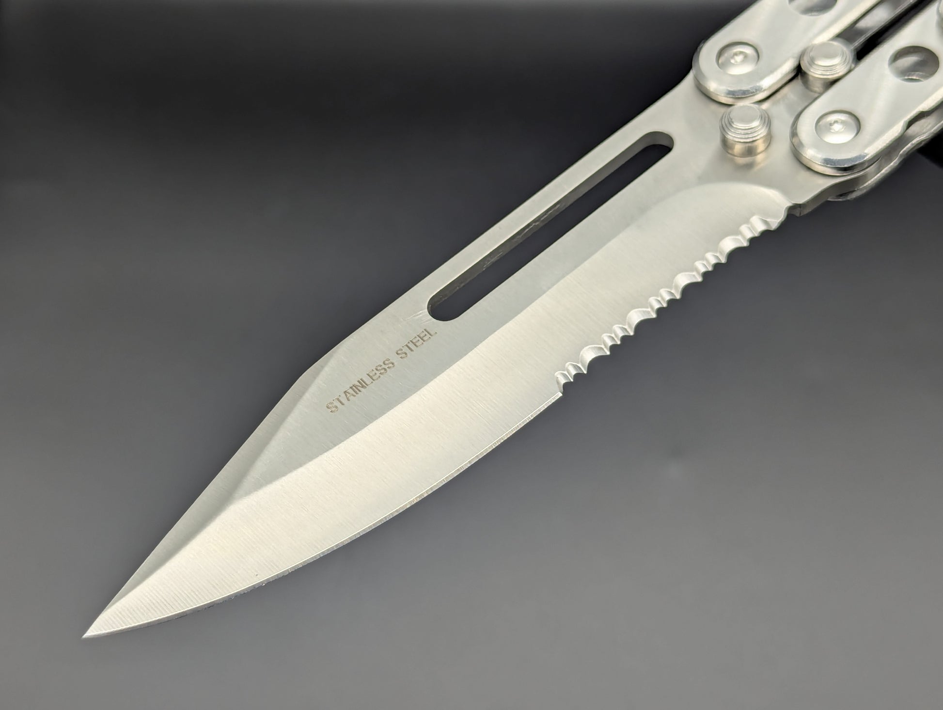 BRINGING THE OLD SCHOOL BACK! SUPER KNIVES BRAND BALISONG TRENCH KNIFE. 11" OVERALL LENGTH OPEN. VERY STRONG STAINLESS STEEL CONSTRUCTION WITH LOCKING CLASP IN THE OPEN AND CLOSED POSITION. SUPER HARDCORE ITEM FOR THE PRICE RANGE! EACH INCLUDES BLACK NYLON SHEATH/ CARRY CASE. STAINLESS AND BLACK FINISHED VERSIONS AVAILABLE