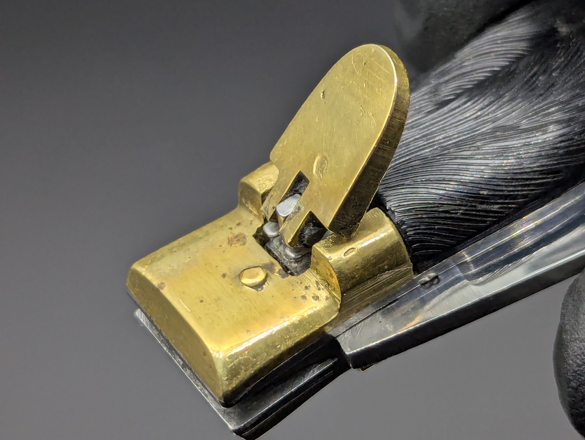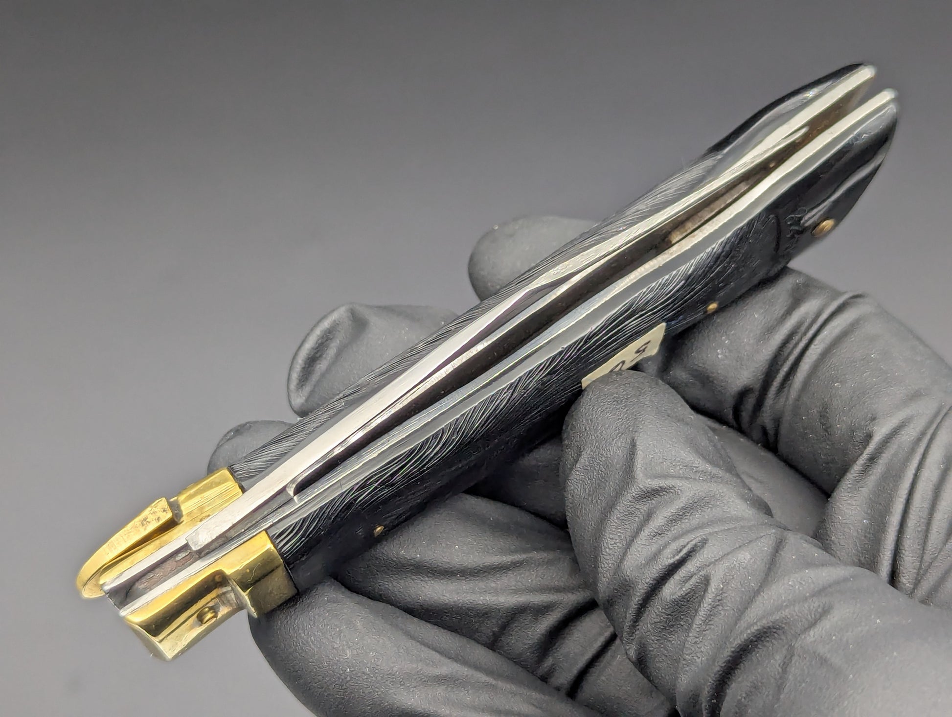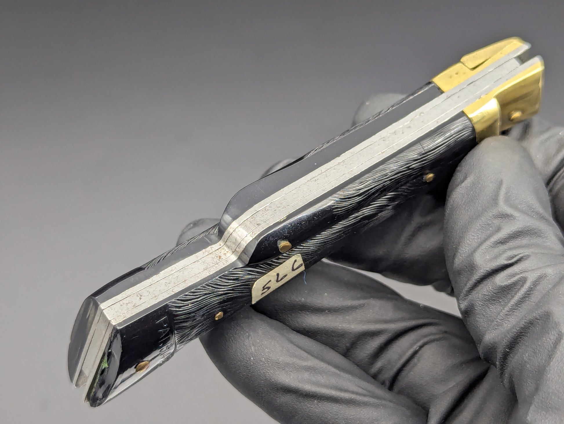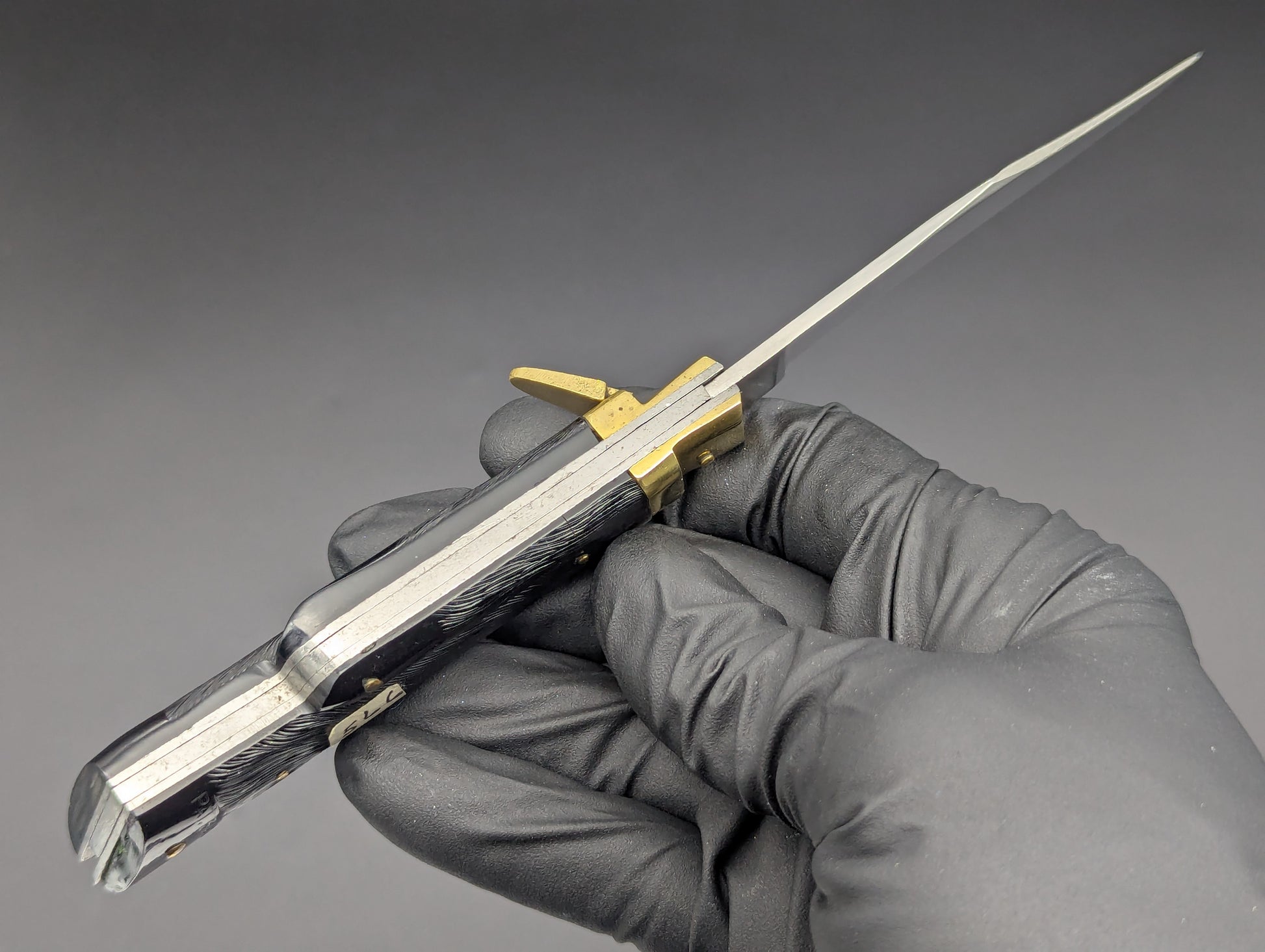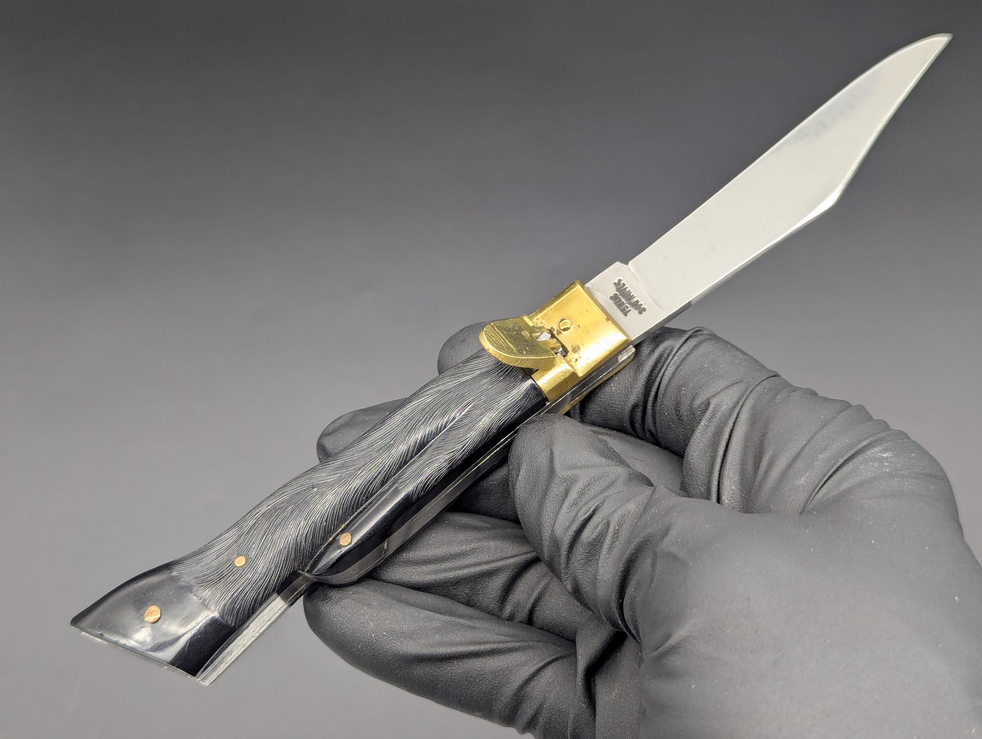 THIS PATENTED JAPANESE DEER FOOT SWITCHBLADE KNIFE IS IN EXCELLENT OVERALL CONDITION! HANDLE SCALES ARE MADE OF MOLDED BLACK COMPOSITEAND ARE IN REALLY NICE CLEAN SHAPE WITH ALL THE HIGH RELIEF DETAIL COMPLETELY VISIBLE.  THE PATENT INFORMATION BEING ON THE BOTTOM BOLSTER/ HOOF AREA. BEAUTIFULLY AGED BRASS TOP BOLSTER AND FIRING LEVER. BLADE IS FULL AND SEEMS UNUSED WITH SOME LIGHT MICRO ABRASIONS FROM OPENING AND CLOSING OVER THE DECADES.  GREAT SPRING STILL FIRES PROUD AND STRONG WITH A POSITIVE LOCKUP EVERY TIME.  BLADE SITS DEEP IN HANDLE WHEN CLOSED.  RARE ITEM HERE NOT OFTEN SEEN! 7.5" OPEN LENGTH.  3.25" BLADE LENGTH