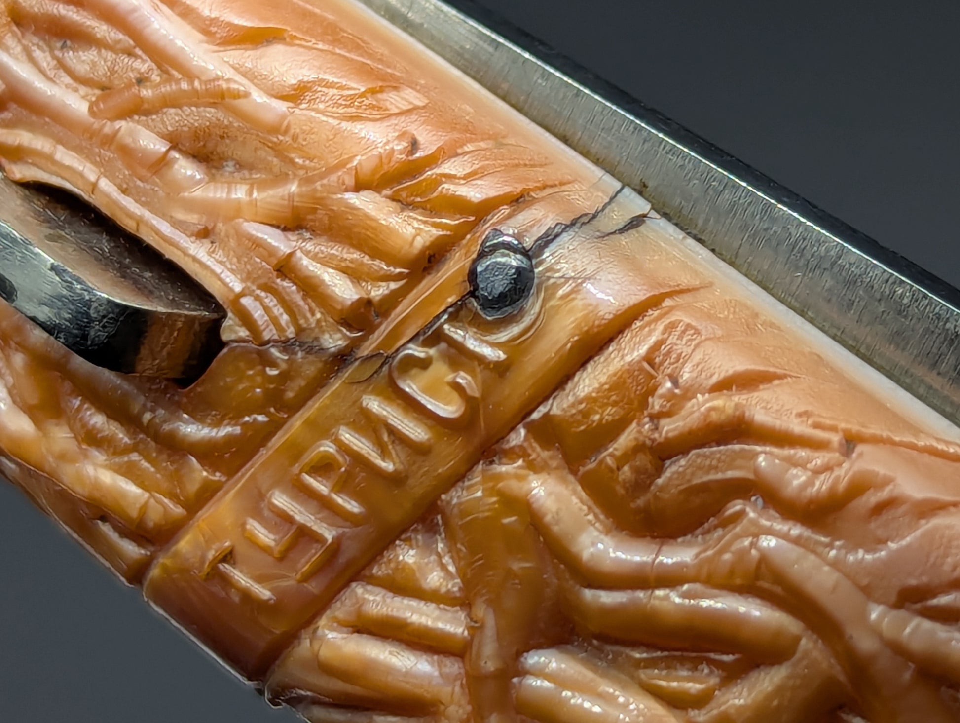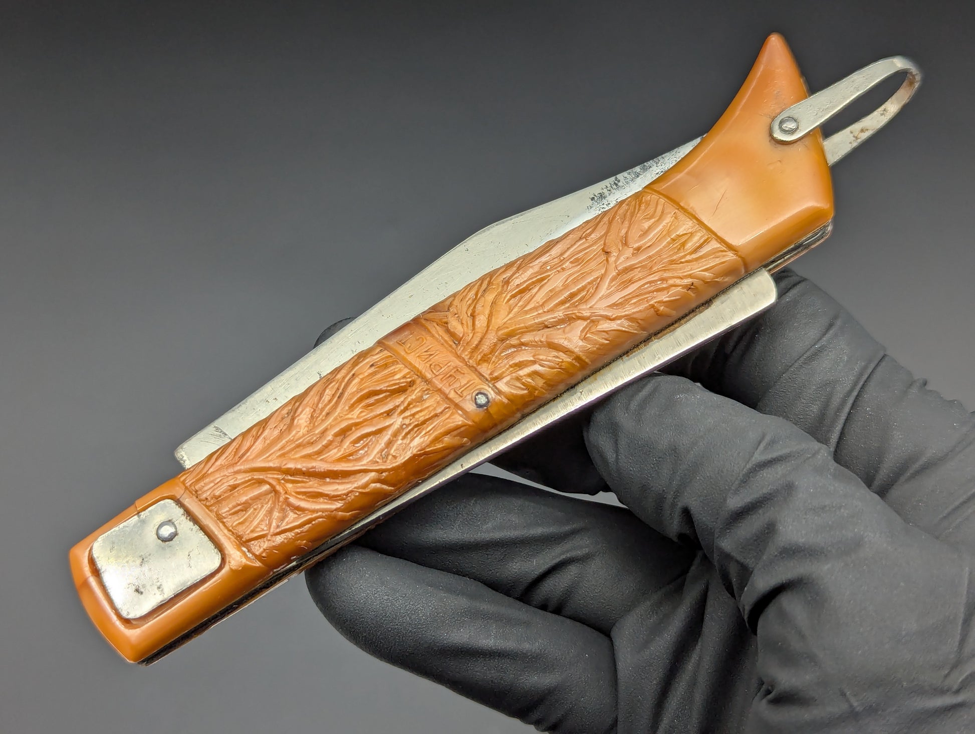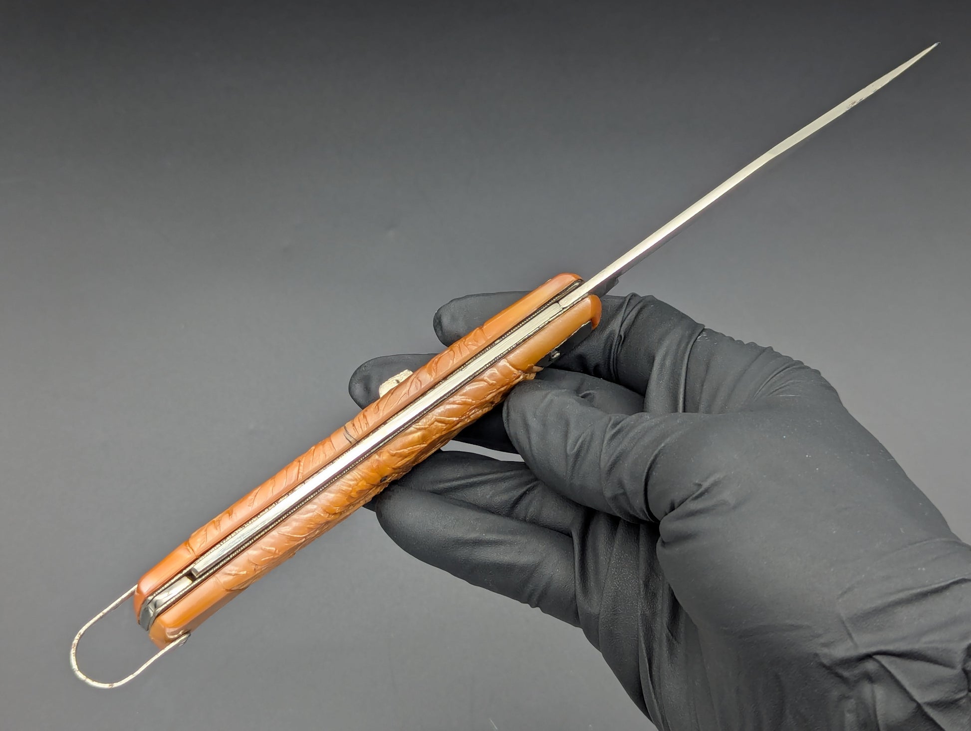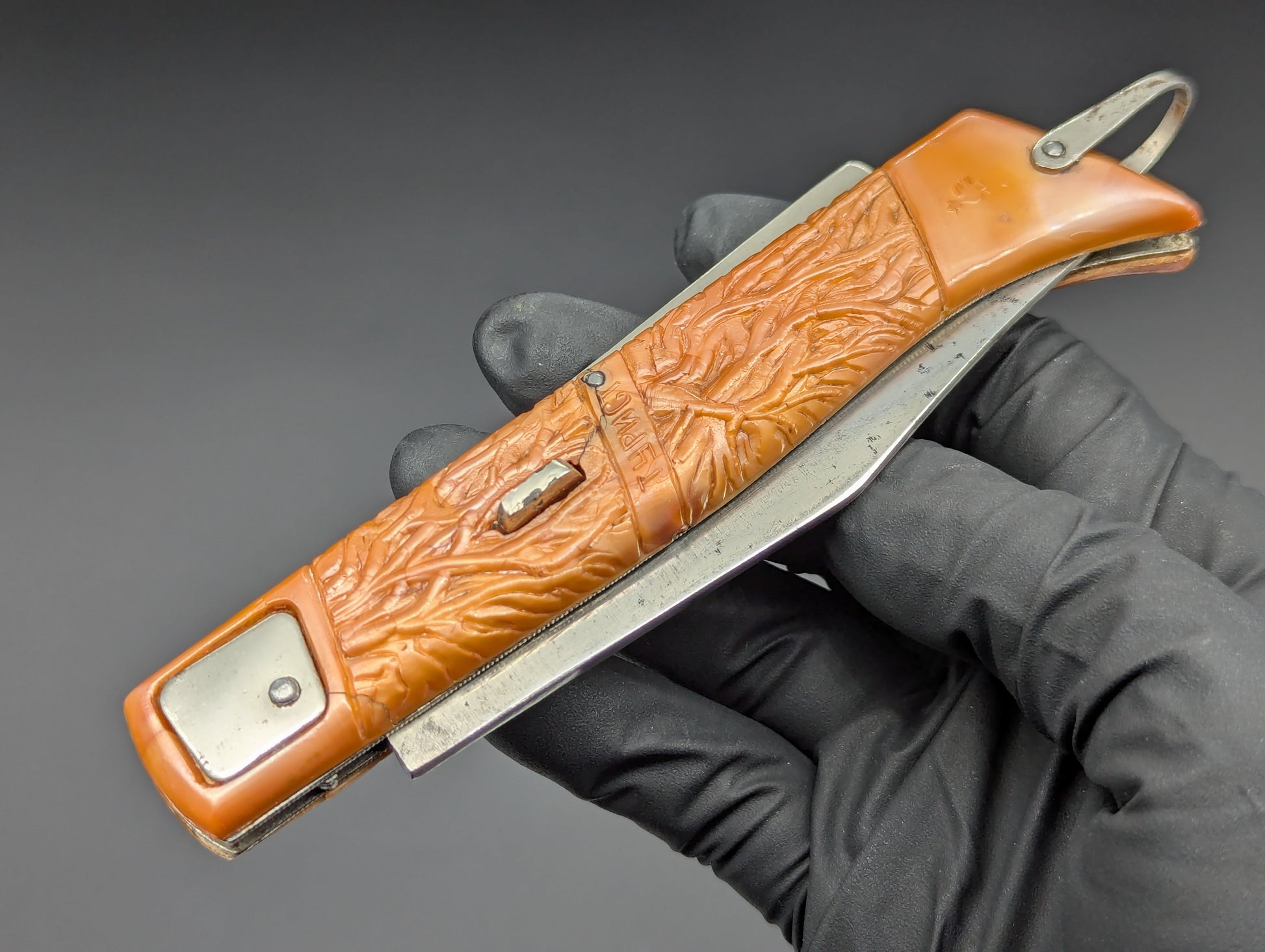 YOU DO NOT SEE THESE VORSMA CITY RUSSIAN AUTOMATIC KNIVES OFTEN. MADE IN THE "OLD DAYS" FOR HUNTING AND OUTDOORSMAN IN SOVIET ERA RUSSIA. ORANGE-ISH BAKELITE COMPOSITE SCALES. BIG OLE CLIP POINT BLADE. THESE STEEL BLADES USUALLY BEGIN TO OXIDIZE AND PIT OVER THE DECADES. THIS EXAMPLE IS VERY NICE AND CLEAN AND OPERATES PERFECTLY. MAY BE A LITTLE BLEMISH HERE AND THERE BUT THIS IS A GREAT COLLECTIBLE!