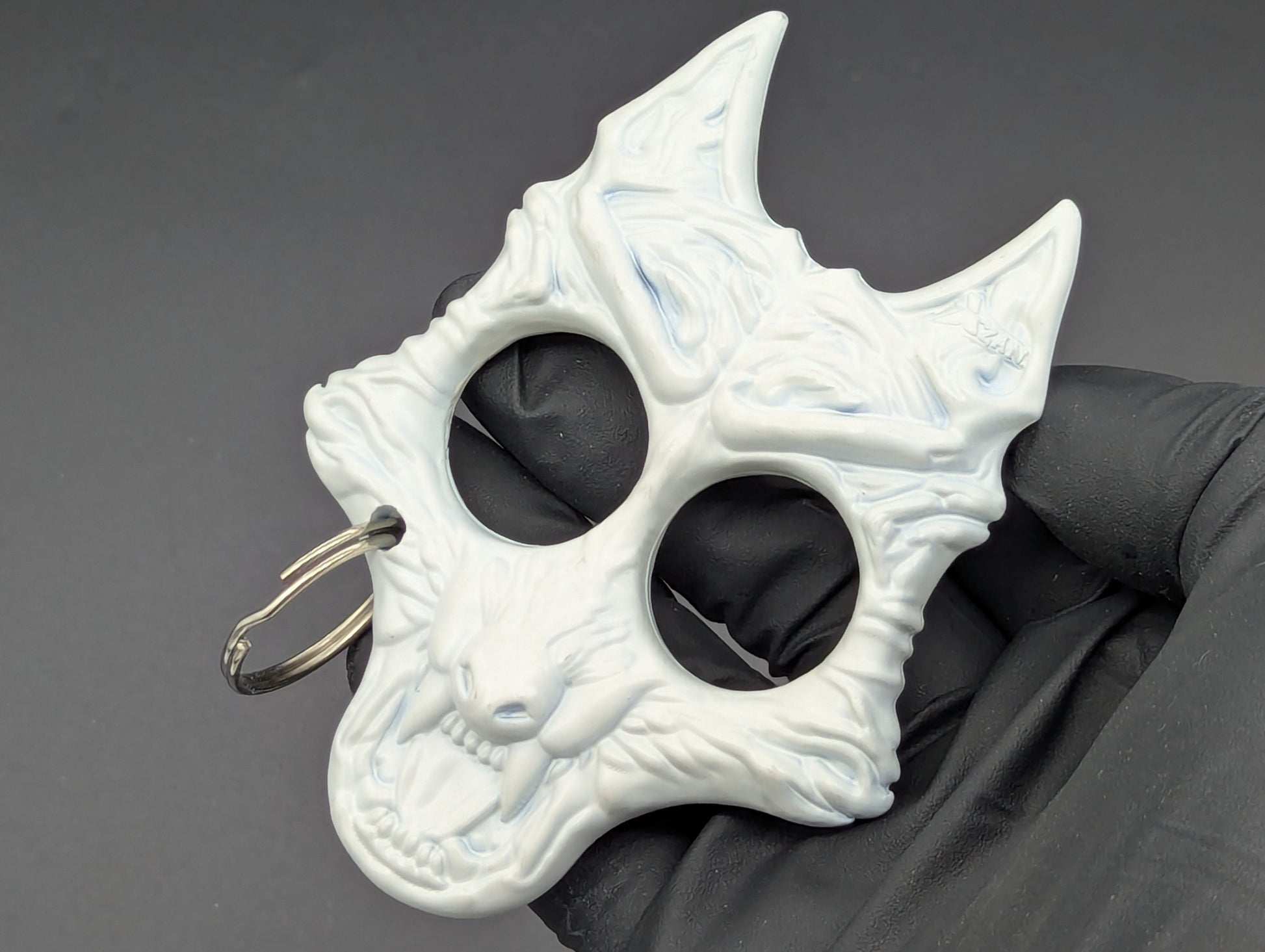 WHITE FINISHED WEREWOLF SELF DEFENSE CHARM AND KEYRING ATTACHMENT. MADE OF ABS IMPACT RESISTANT MOLDED PLASTIC. JUST PLACE YOUR FINGERS THROUGH THE WEREWOLF'S "EYES" FOR A GOOD GRIP. VERY HEAVY DUTY DURABLE CONSTRUCTION