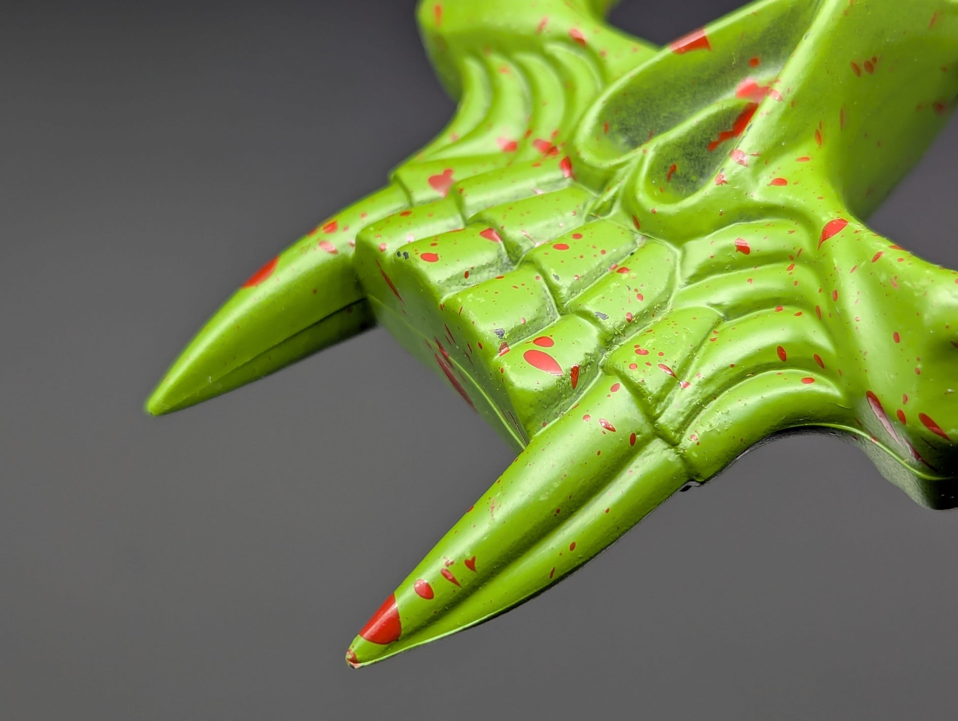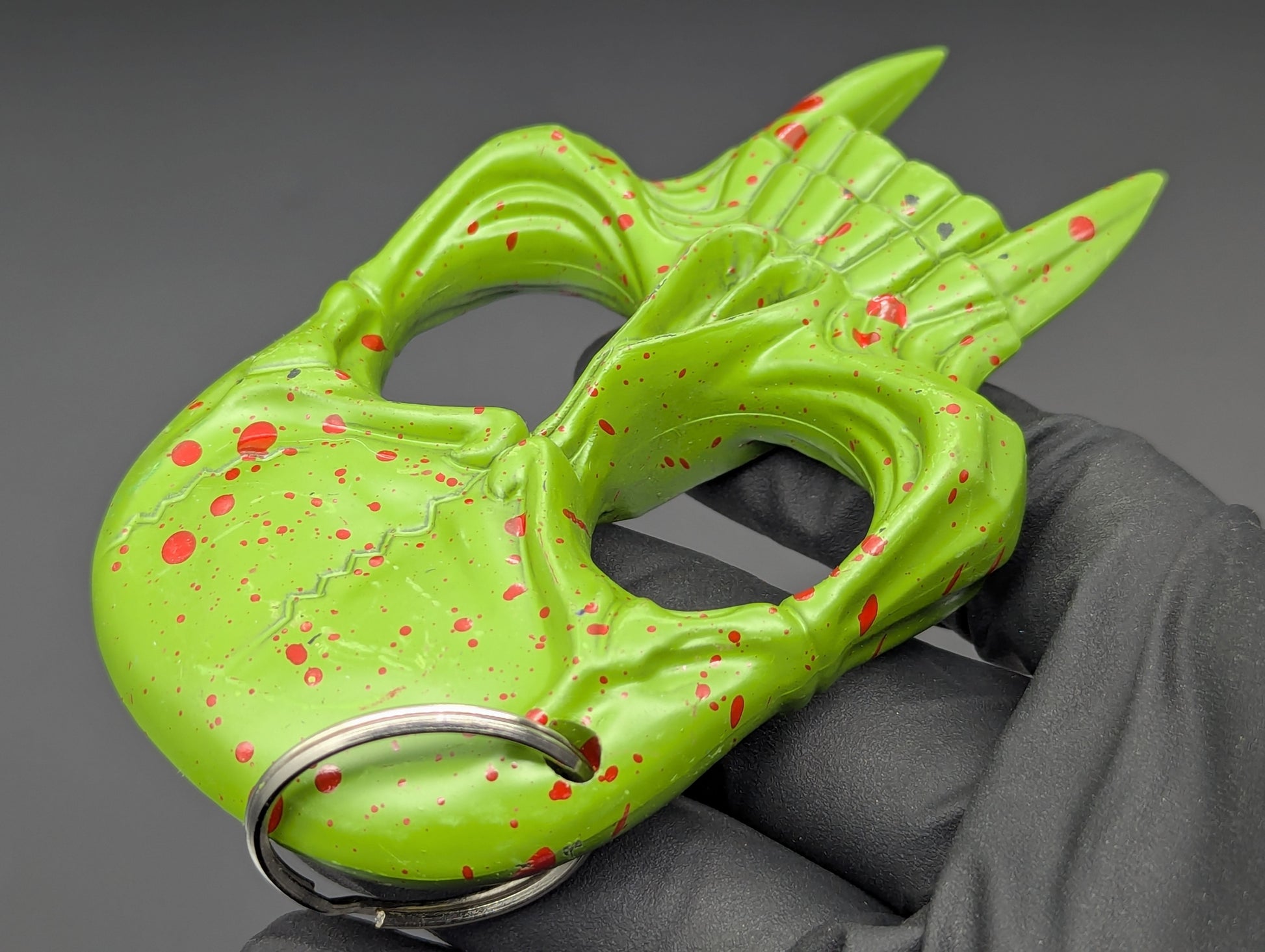 GREEN ZOMBIE SKULL SELF DEFENSE CHARM AND KEYRING. MADE OF ABS IMPACT RESISTANT MOLDED PLASTIC. JUST PLACE YOUR FINGERS THROUGH THE SKULL'S "EYES" FOR A GOOD GRIP. VERY HEAVY DUTY DURABLE CONSTRUCTION